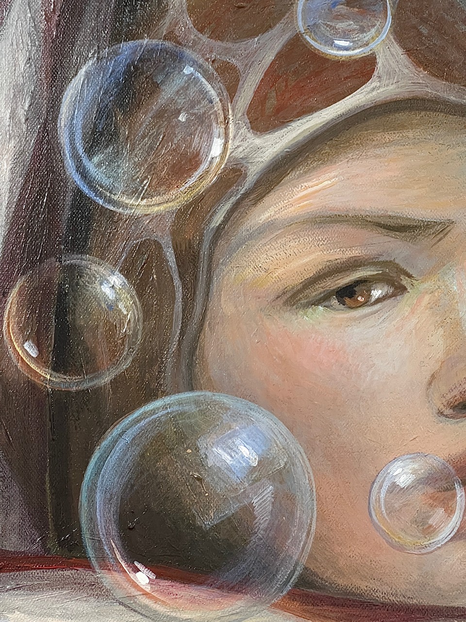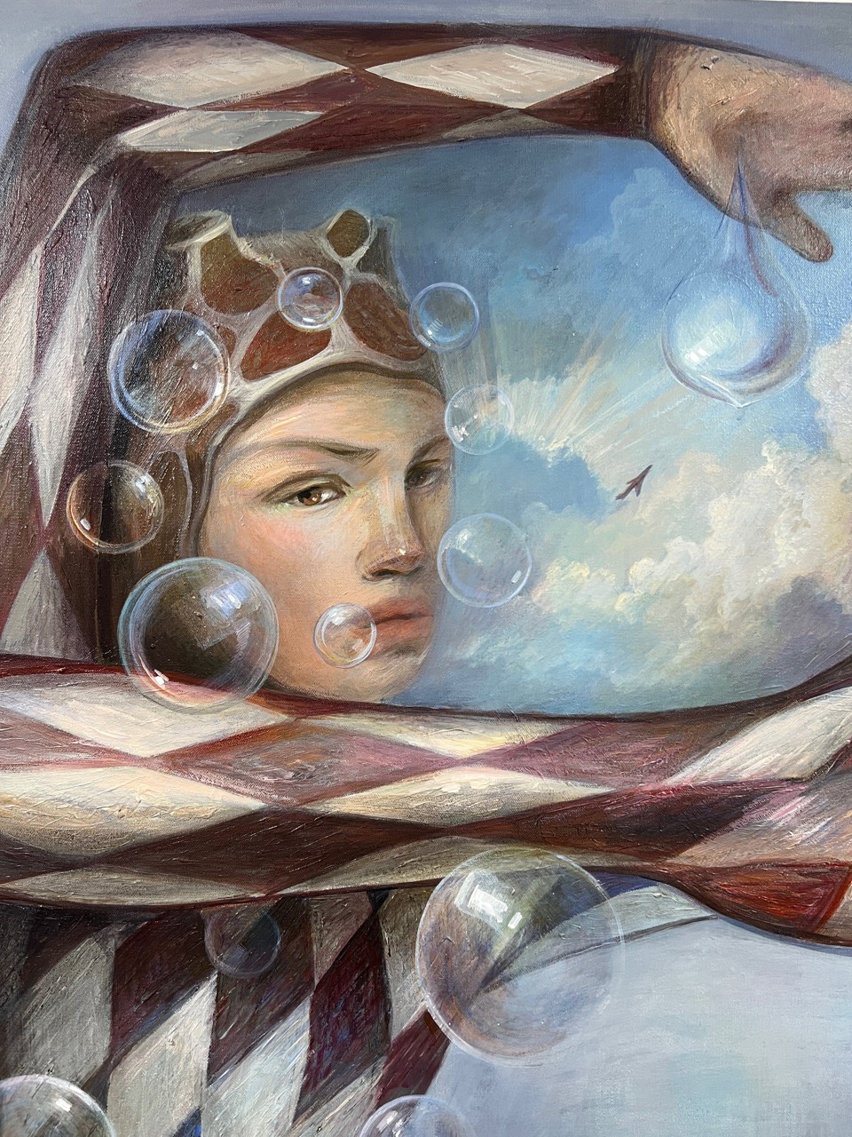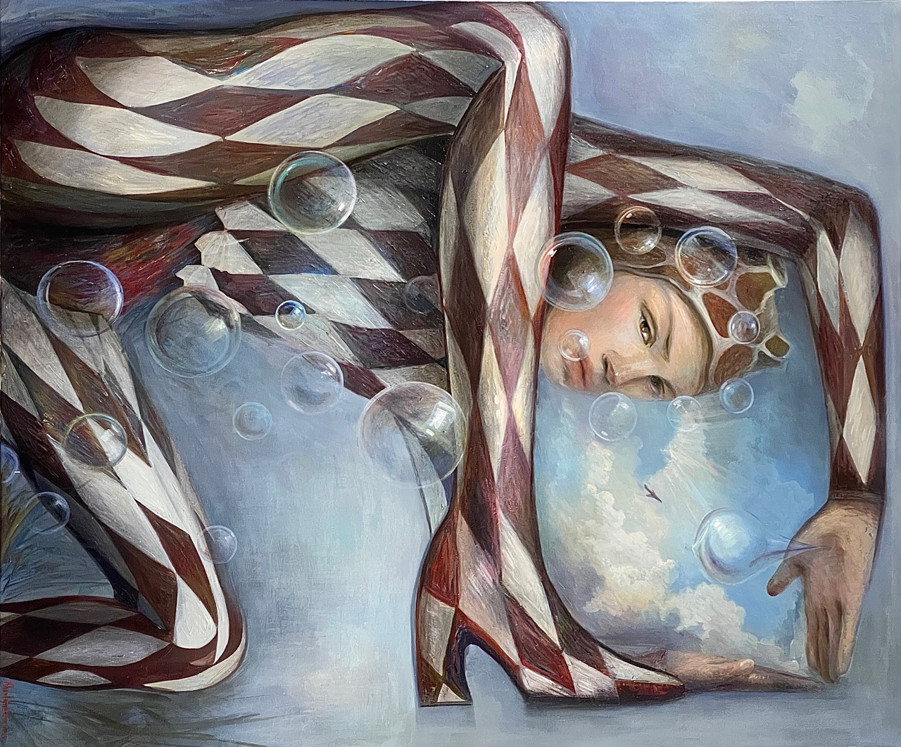 Чем глубже я ухожу в самопознание, тем ярче понимаю, сколькими иллюзиями мы обрастаем, мечтаем чужие мечты и стремимся к навязанной идеальности. Героиня этой работы предстает перед зрителем в сложной позе, словно ломает саму себя перед натиском внешнего, чтобы сохранить истинные желания. Едва заметный самолет символизирует ее свободу, полет мечты, а мыльные пузыри как знак эфемерности, иллюзии, социально желаемого. Своей работой я хочу сказать, как важно видеть мир собственными глазами и сердцем, а не через призму искажений. И, пожалуй, это самая сложная работа — искать, находить и оберегать.