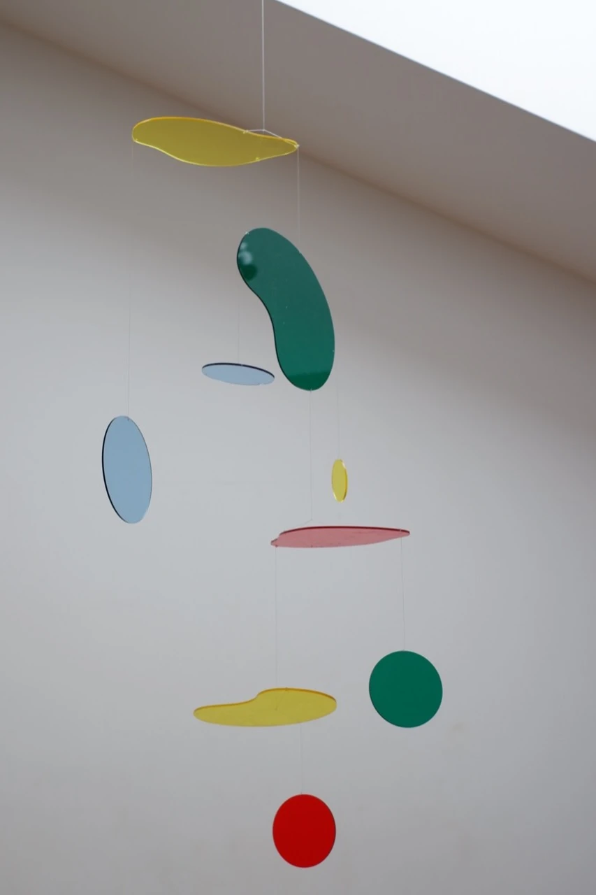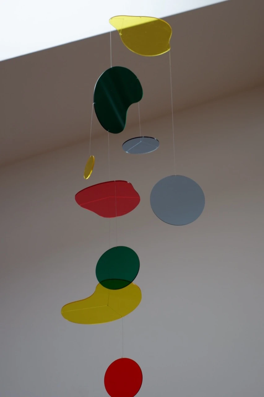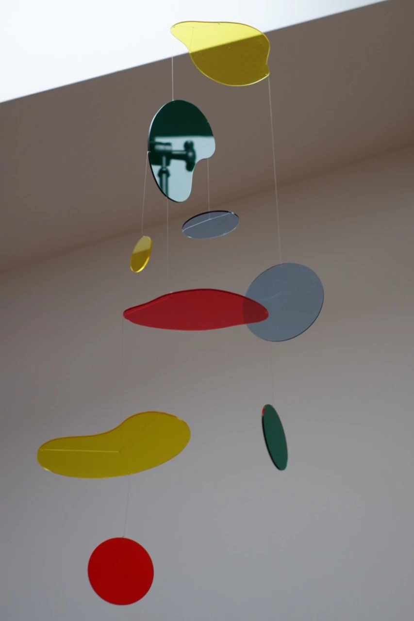 Разноцветные фрагменты оргстекла работают как световые фильтры: при движении они накладываются друг на друга, создавая новые оттенки и сложные оптические проекции на стены и пол.