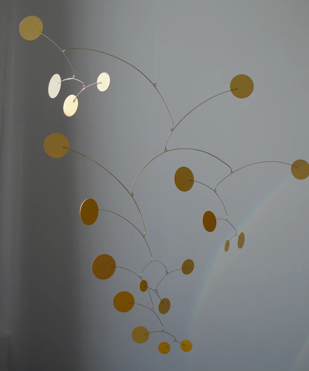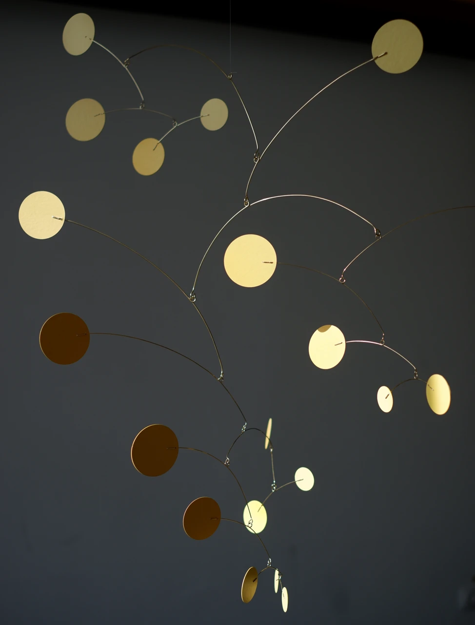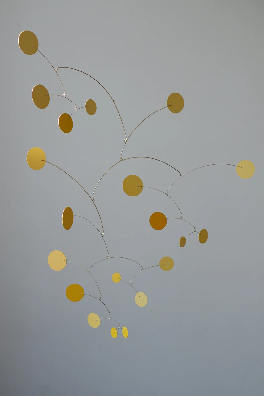 Весна, запечатленная в статике и движении. Мобиль «Мимоза» — это ода хрупкости и первым теплым лучам. Ярко-желтые диски, словно пушистые соцветия, парят на тонких стальных ветвях, создавая в интерьере ощущение легкости и солнечного света, даже в пасмурный день.