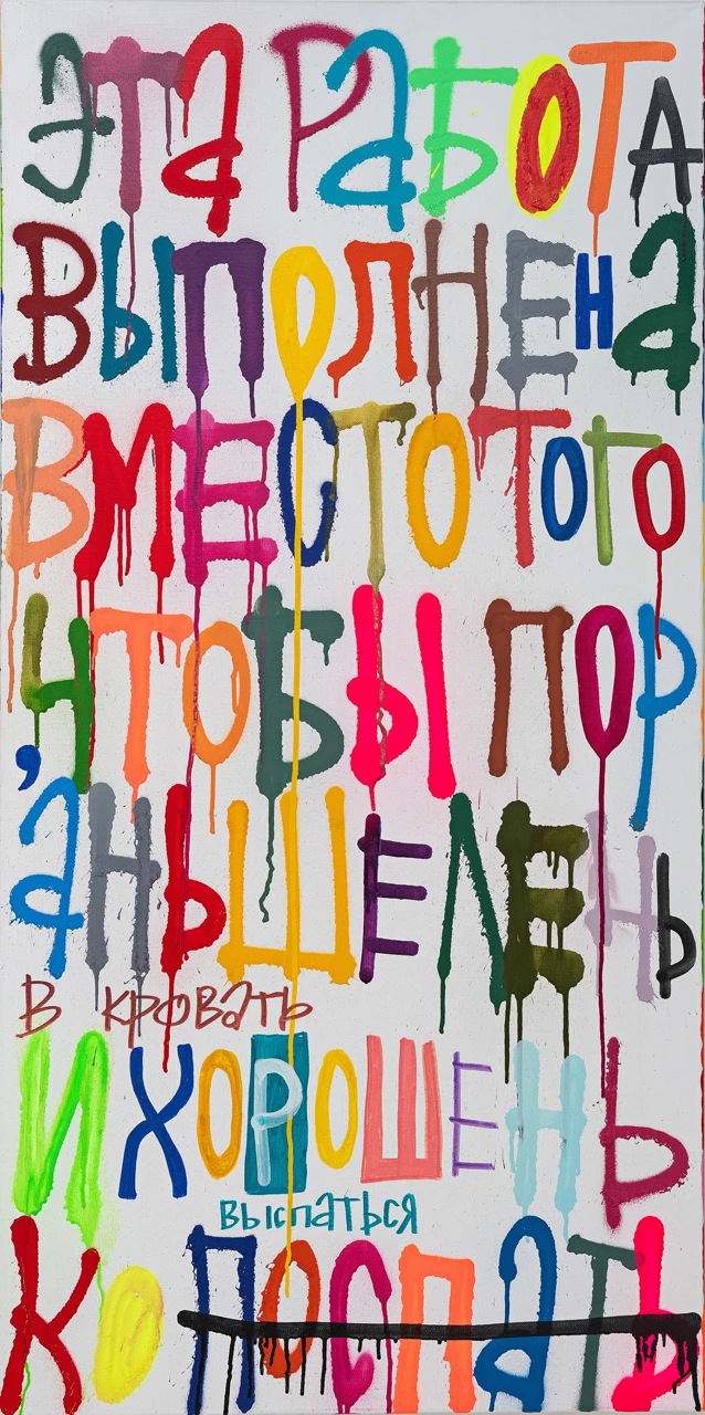 Новая серия кажется едва ли не приятельским жестом художника, знакомящего всех со своей обыденной жизнью. Каждая картина оказывается «сделана вместо того, чтобы», а из написанного вслед за этой формулой можно легко составить список дел: «позвонить другу», «пойти на турник», «лежать на диване», «смотреть сериалы», «гладить кота», из которого возникает понятный и вызывающий симпатию образ человека, такого же, как все мы, — если не помнить, что любые простые занятия современный художник способен превратить в часть работы.