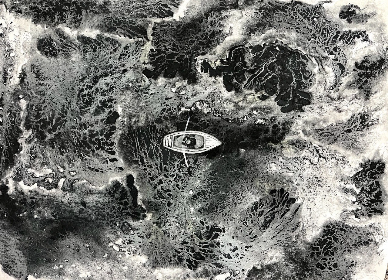 Лабиринты глубин — это визуальный монолог о человеческом одиночестве, растворённом в беспредельности времени и подсознания. Картина манит с первого взгляда: центр композиции — крошечная лодка с фигурой человека — кажется случайной точкой на теле неведомого космоса, который одновременно может быть и океаном, и разумом, и сном. Черно-белая гамма не лишена глубины: она звучит тревожно, как шёпот древних вод, откуда никогда не возвращаются прежними. Используется игра фактур и размывов, создаются органические, будто живые структуры — словно это не краска, а сама природа пишет. В этих разветвлённых линиях — нервные окончания мира, по которым дрожит что-то древнее и бессловесное. Каждая деталь говорит о зыбкости границ между реальностью и воображением, между внутренним «я» и бескрайней стихией. Эта работа не требует ответа — она сама вопрос. Куда мы плывём, если не знаем — где берег?