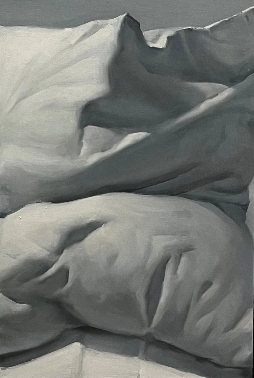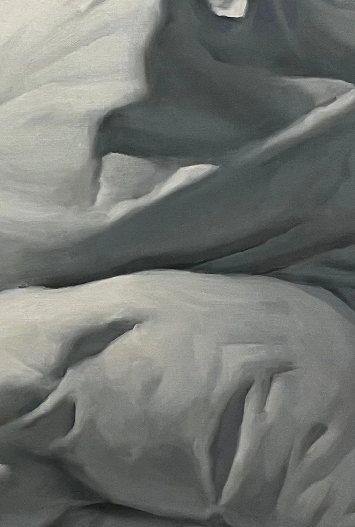 Проект продолжает размышления, начатые в серии «Погружение» 2023-2024 года. В большеформатных картинах ставится вопрос о том, ощущаем ли мы телесность при ее исчезновении, через ее следы — отпечатки присутствия. Лейтмотивом становится образ кровати, рассматриваемый как очень личное и одновременно объединяющее всех людей место присутствия. Человека нет, есть только его следы — заломанные и замятые драпировки, пространство становится отчужденным и пустым. Холодная цветовая гамма усиливает и варьирует это впечатление: здесь кто-то был, но его/их нет. В настоящий момент находятся в разработке первые холсты из серии, требуется додумать и развить проект новыми поворотами и связями.