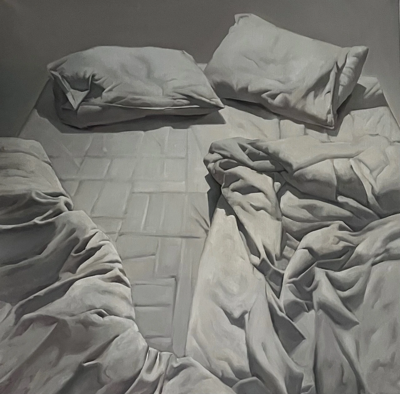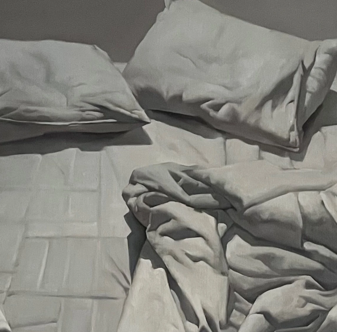 Проект продолжает размышления, начатые в серии «Погружение» 2023-2024 года. В большеформатных картинах ставится вопрос о том, ощущаем ли мы телесность при ее исчезновении, через ее следы — отпечатки присутствия. Лейтмотивом становится образ кровати, рассматриваемый как очень личное и одновременно объединяющее всех людей место присутствия. Человека нет, есть только его следы — заломанные и замятые драпировки, пространство становится отчужденным и пустым. Холодная цветовая гамма усиливает и варьирует это впечатление: здесь кто-то был, но его/их нет. В настоящий момент находятся в разработке первые холсты из серии, требуется додумать и развить проект новыми поворотами и связями.