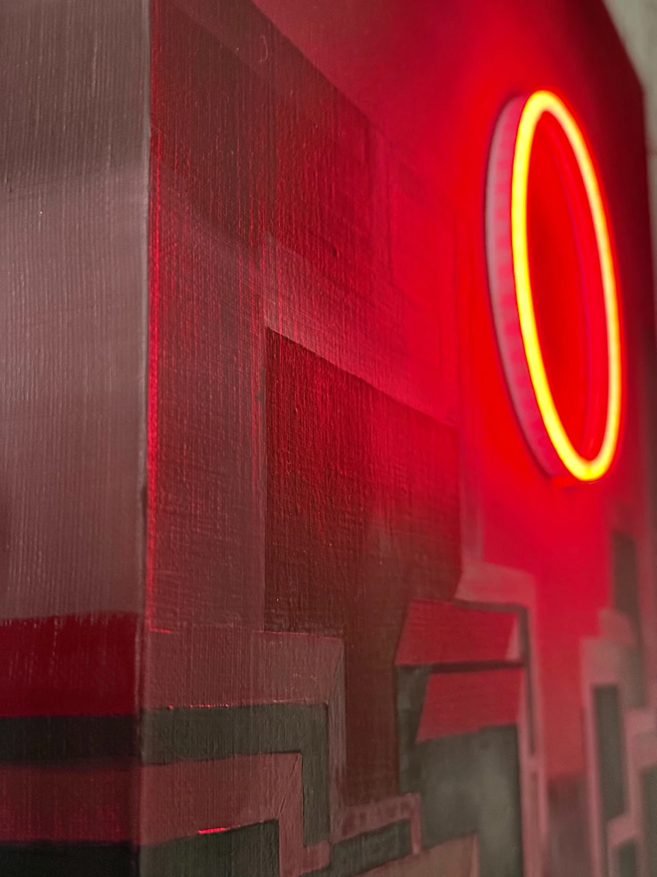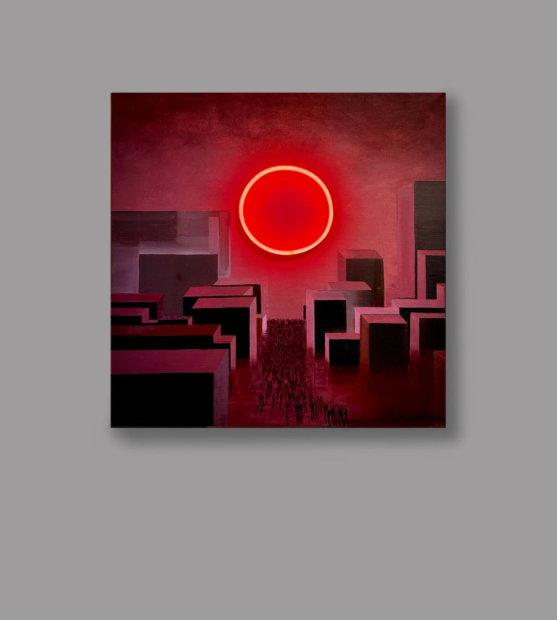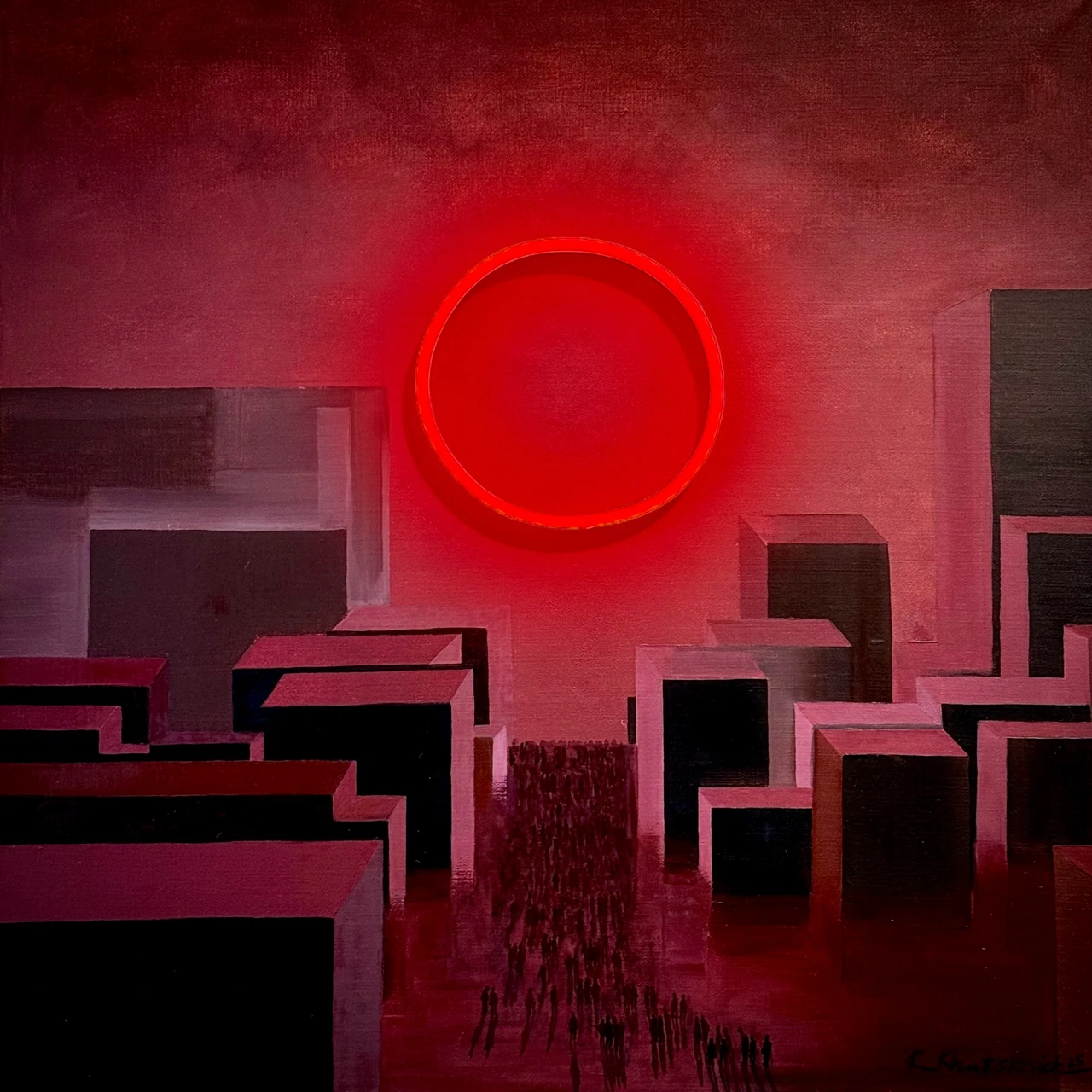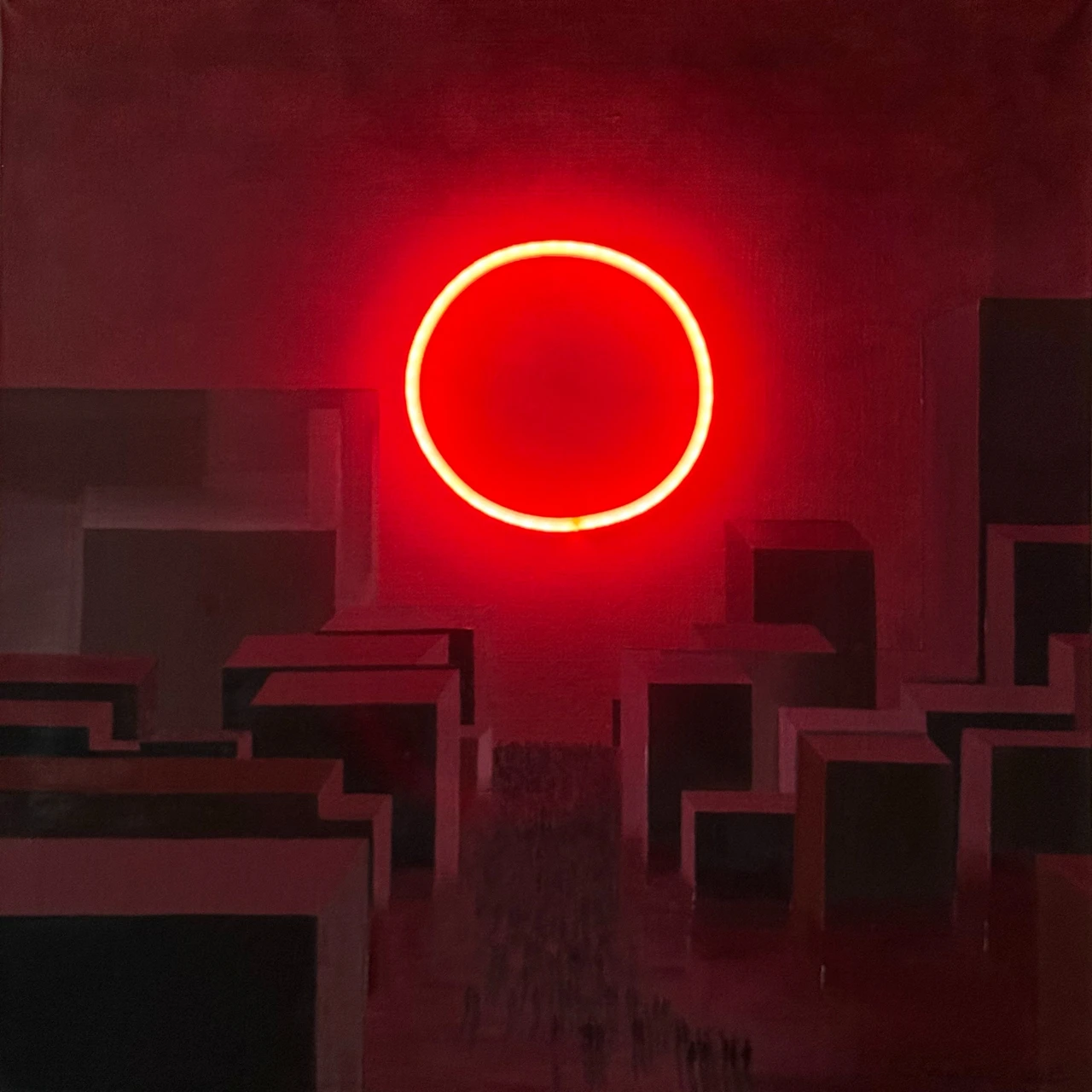 фигур, устремлённых к красному неоновому нимбу. Индустриальная архитектура лишена индивидуальных признаков и выступает метафорой среды, в которой человек соотносит себя не с другим субъектом, а с системой. Неоновый нимб становится образом нового сакрального, технологического источника смысла, подменяющего диалог коллективным откликом. Масштабное несоответствие между человеком и светом фиксирует утрату симметрии общения.