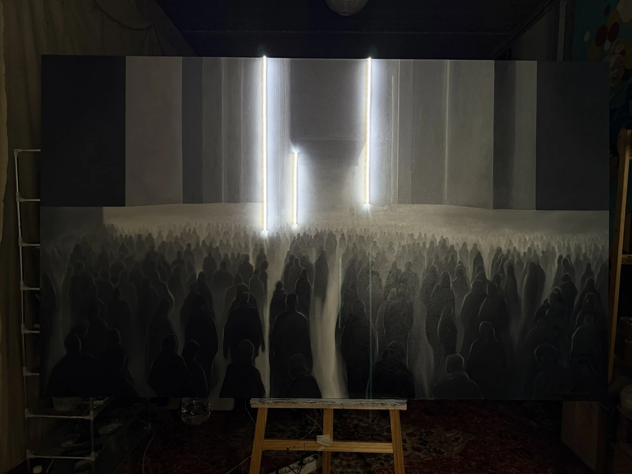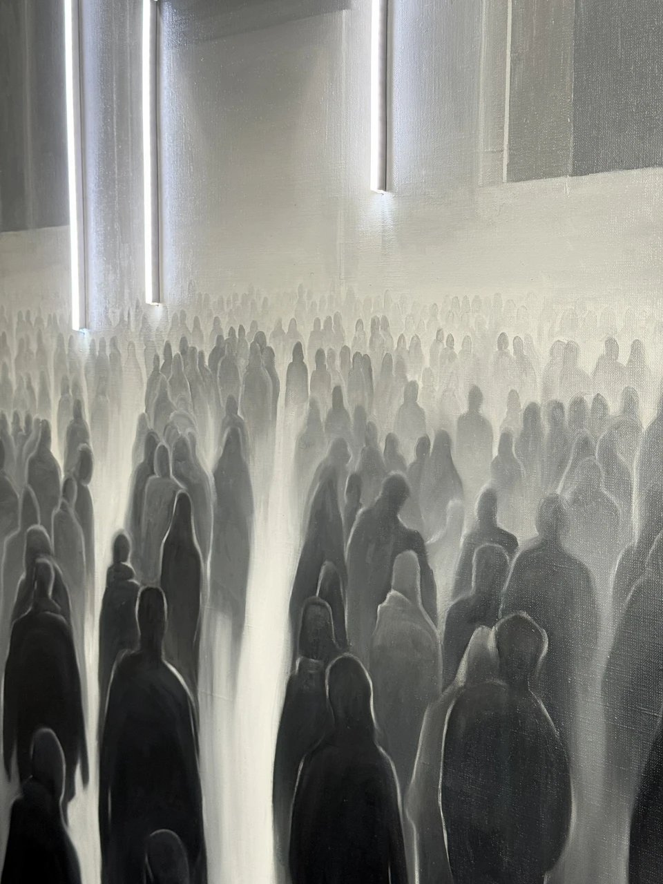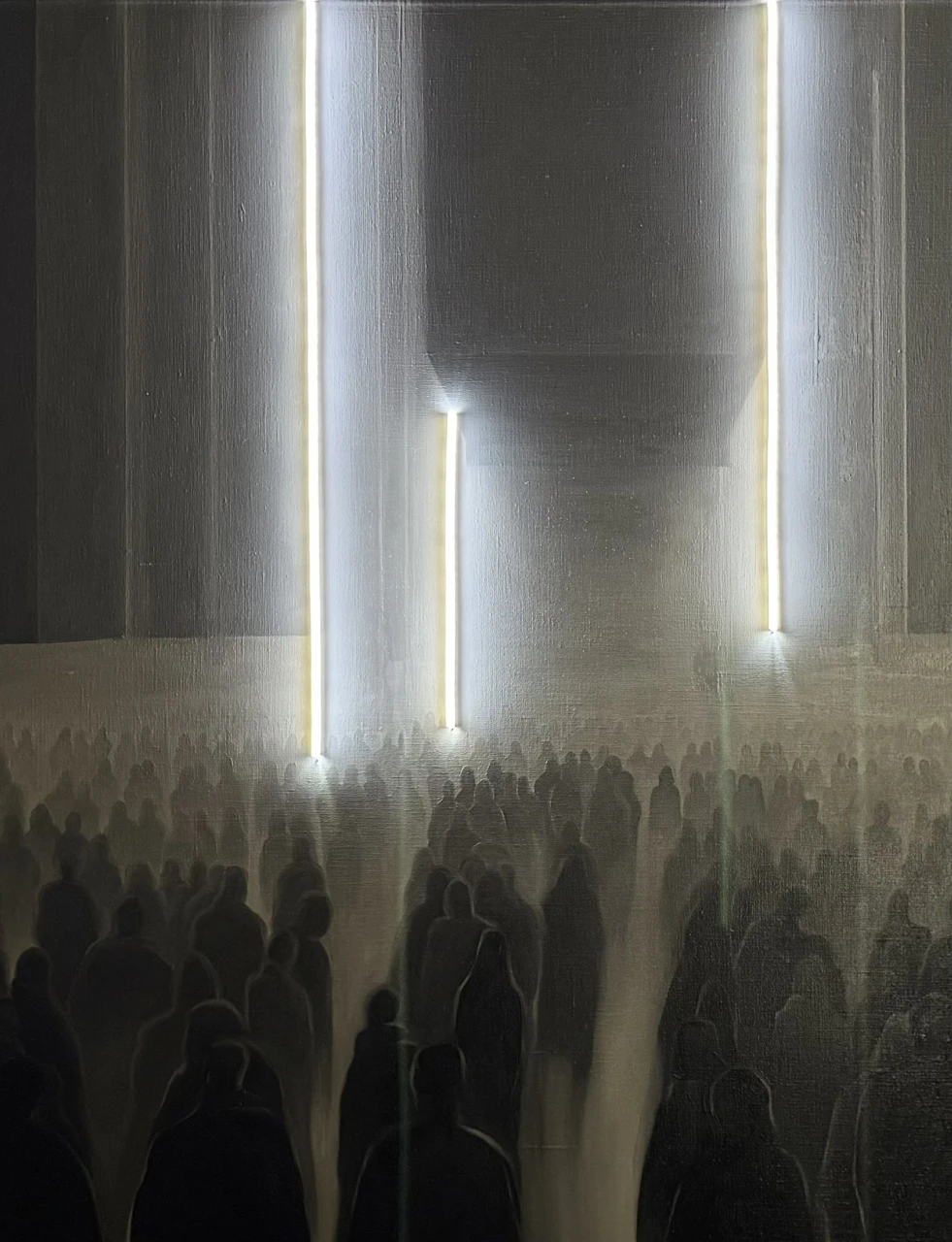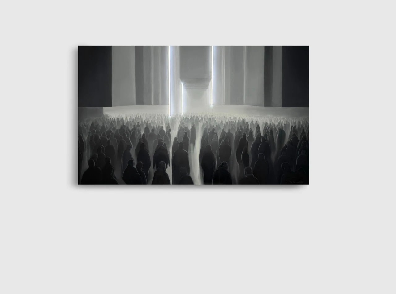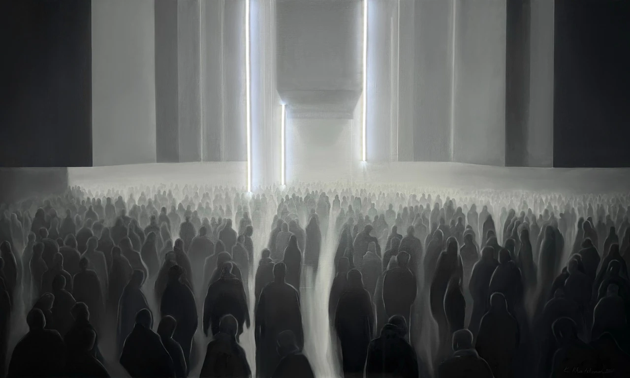 Безликая масса движется к источнику белого неонового света под давлением архитектурной структуры, организующей пространство как коридор без альтернатив. Холодное свечение неона одновременно притягивает и рассеивает восприятие, превращая коллективное движение в проживание предзаданной траектории. Пространство здесь не фон действия, а активный производитель направления, где навигация ощущается как выбор, оставаясь структурной необходимостью.
