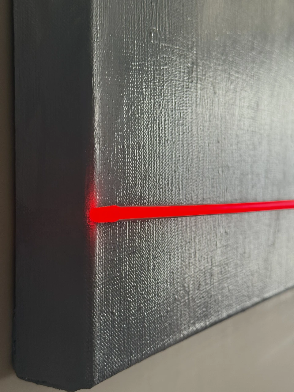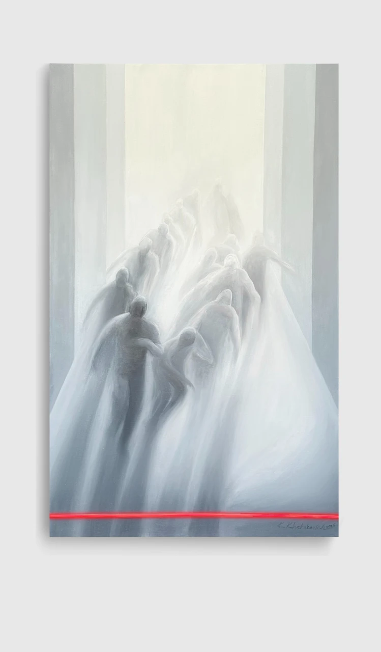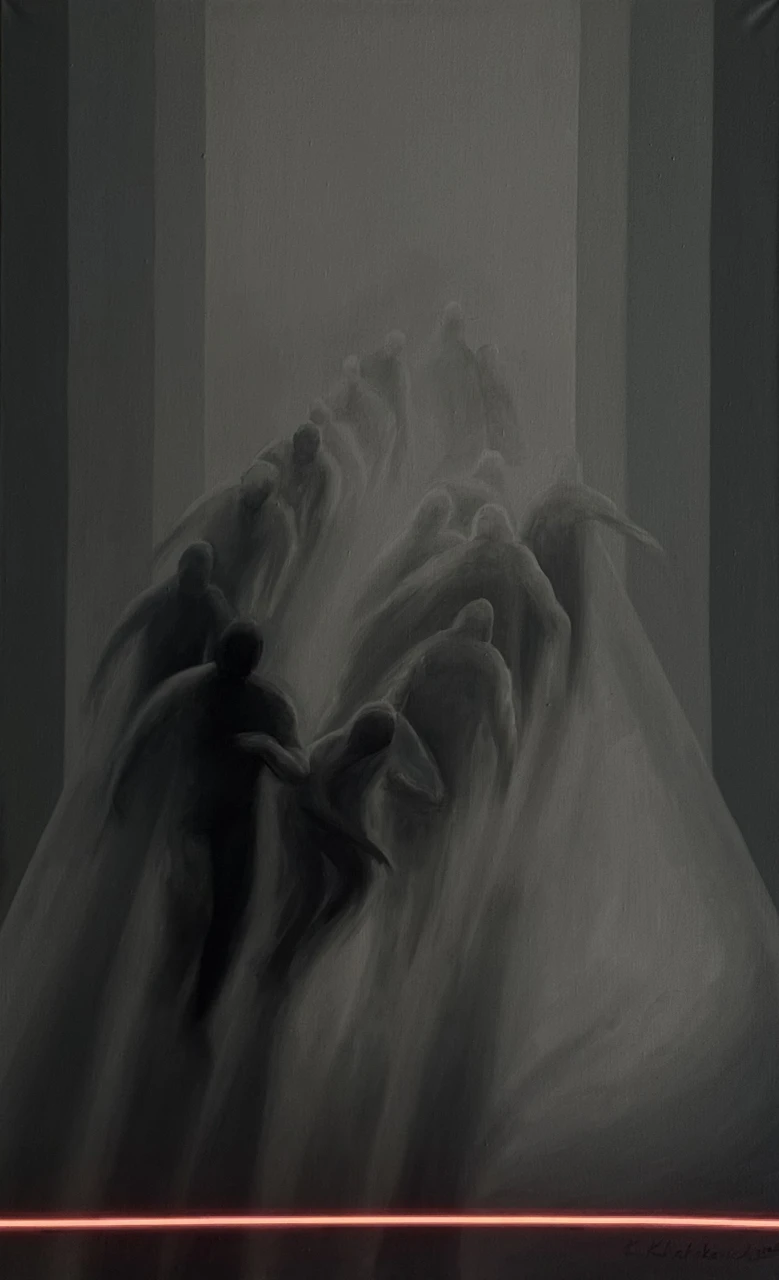 Размытые фигуры ускоряются в вертикальном коридоре, фиксируя движение не как событие, а как перманентное состояние адаптации. Замкнутая красная неоновая траектория внизу холста превращает бег в механизм воспроизводства системы, а не её преодоления. Тело трансформируется не через освобождение, а через встраивание в ритм пространства, производящего само движение.