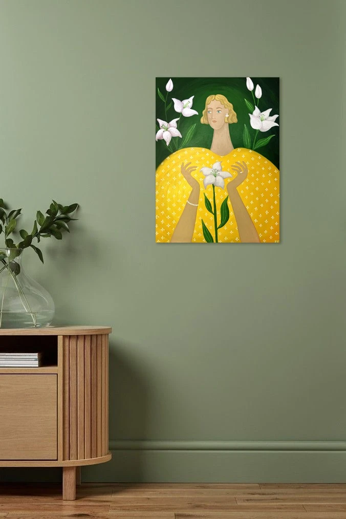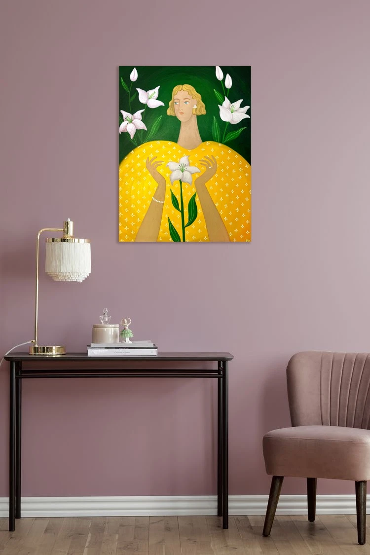 Картина красиво и эффектно смотрится в интерьере за счет сочных и ярких цветов. Красивые и нежные цветы лилии смягчают контрастность, но также притягивают внимание и являются одним из акцентов в сюжете.