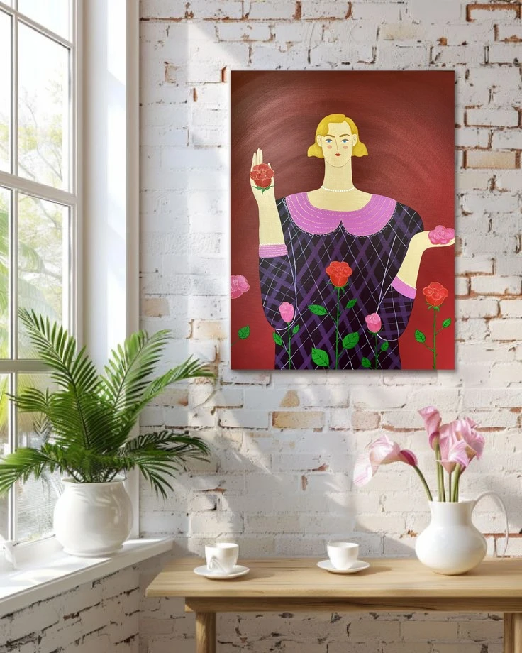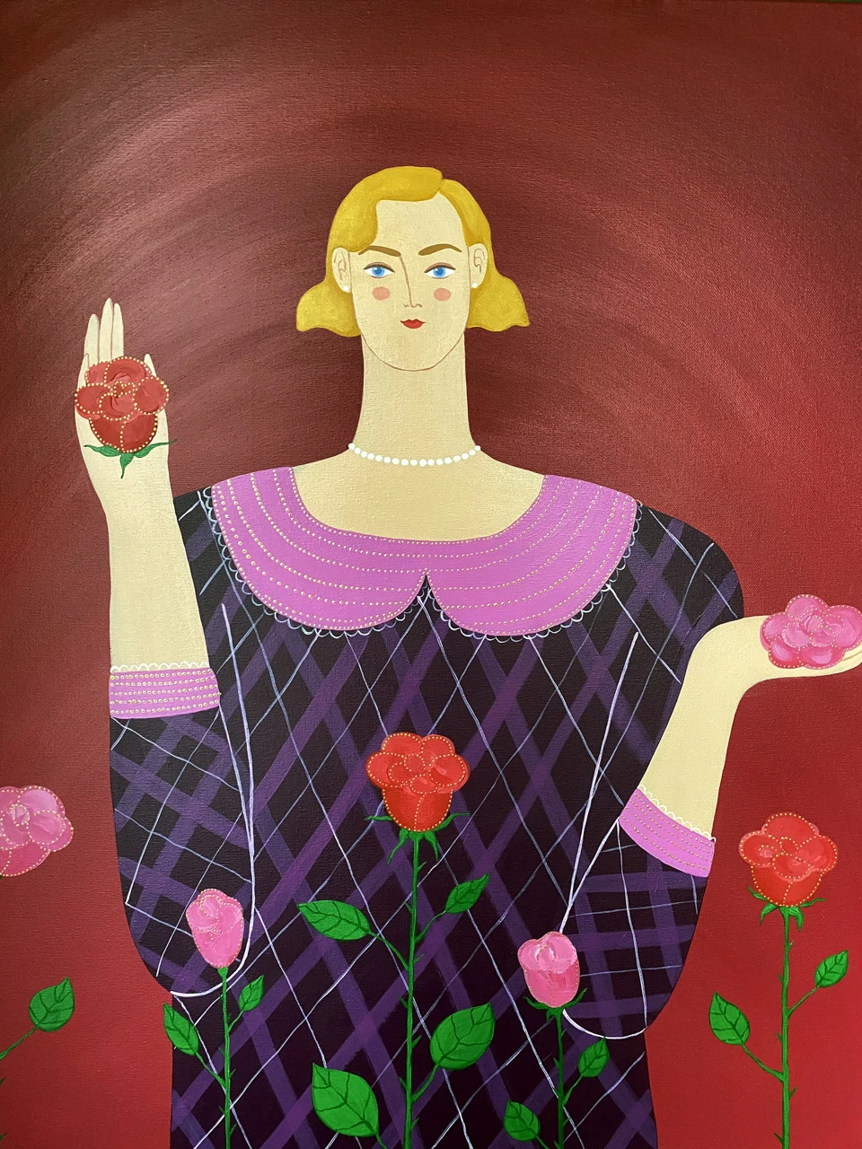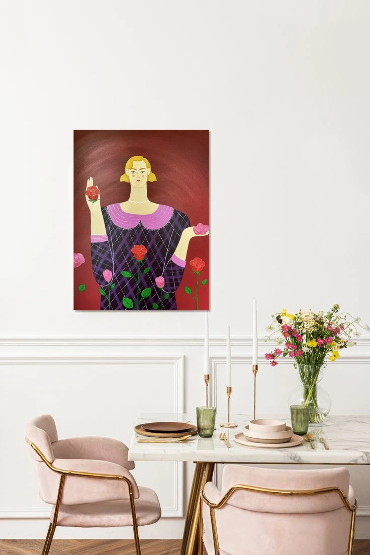 Картина "Дама роз". Картина выполнена акриловыми красками на холсте на подрамнике. В качестве акцента использован золотой контур. Картину можно повесить в интерьер без дополнительного оформления, так как все боковые стороны прокрашены. Также можно оформить работу в раму для большего эффекта.
