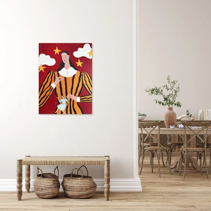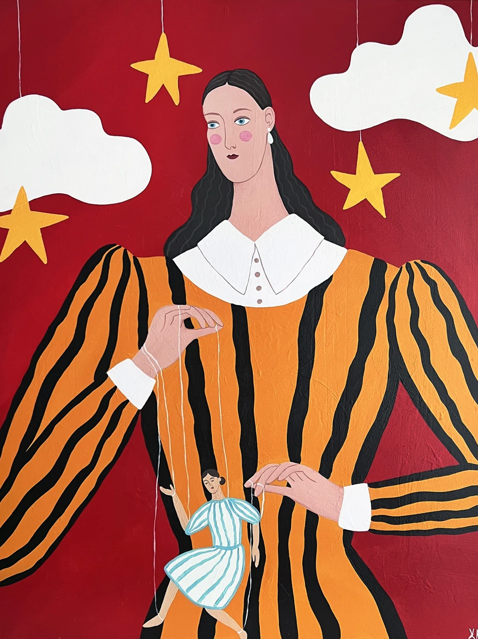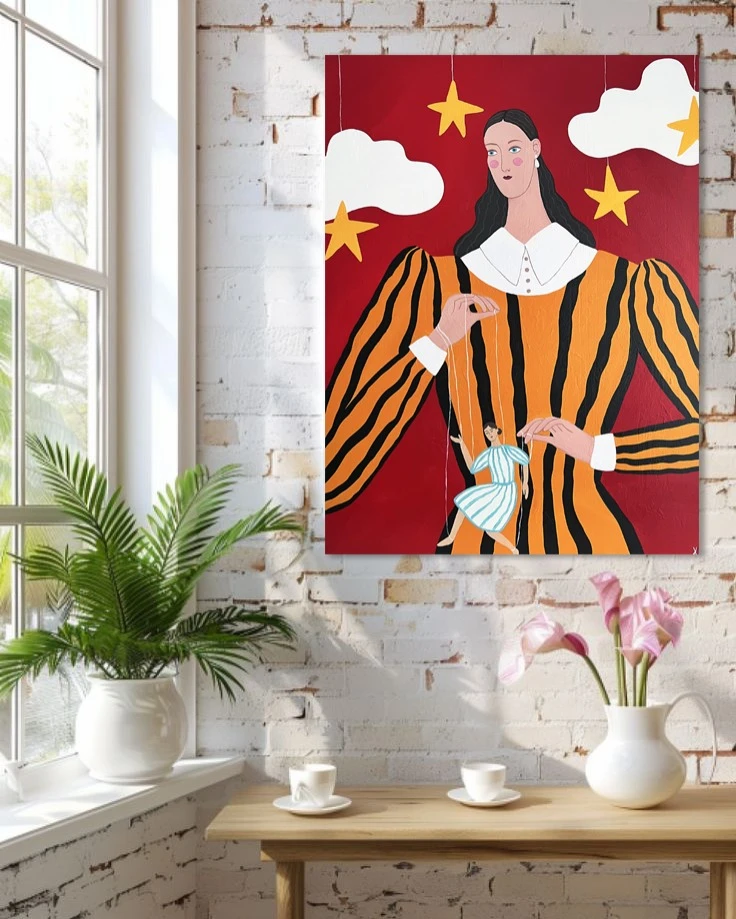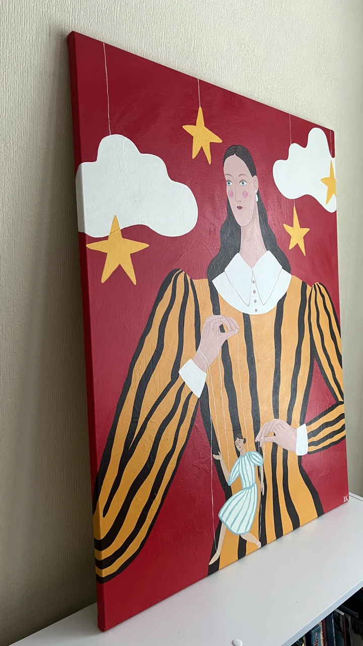 На картине изображена девушка, управляющая марионеткой. В картине отражена тематика кукольного театра. Яркие насыщенные и контрастные цвета.
