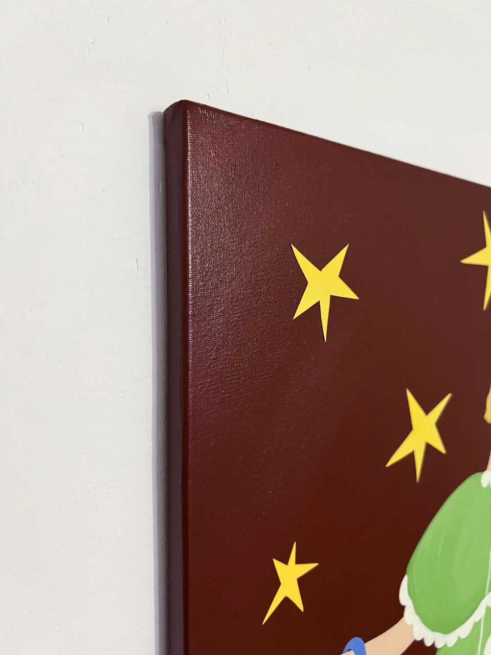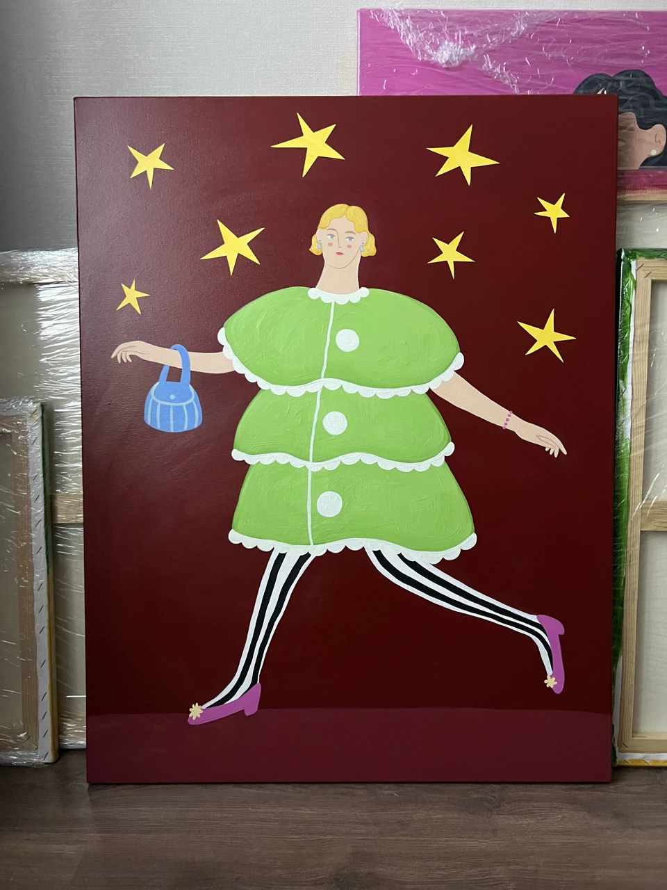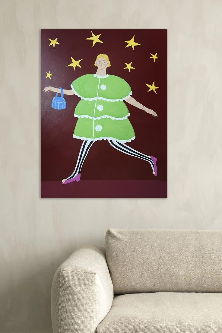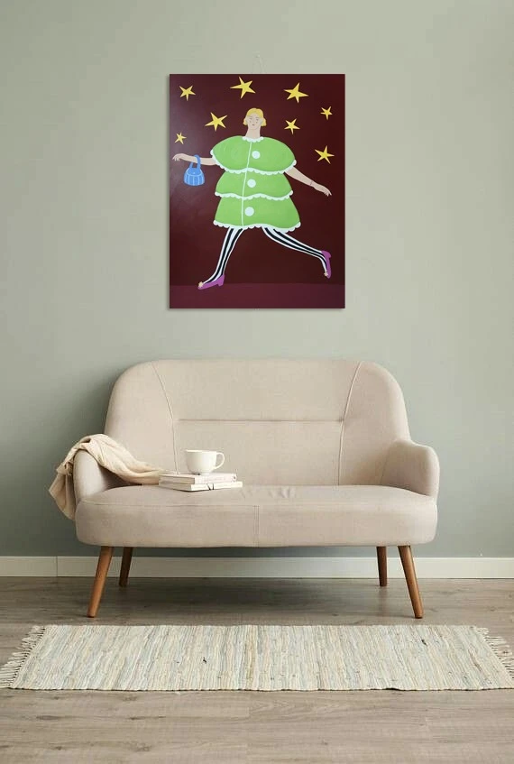 Картина изображает ярко-одетую девушку, которая спешит на вечеринку. В работе присутствует предновогодняя атмосфера, за счет формы и цвета платья, звезд. В целом легкая, забавная, игривая по настроению работа. Картина добавит в интерьер новогоднего настроения и атмосферы.