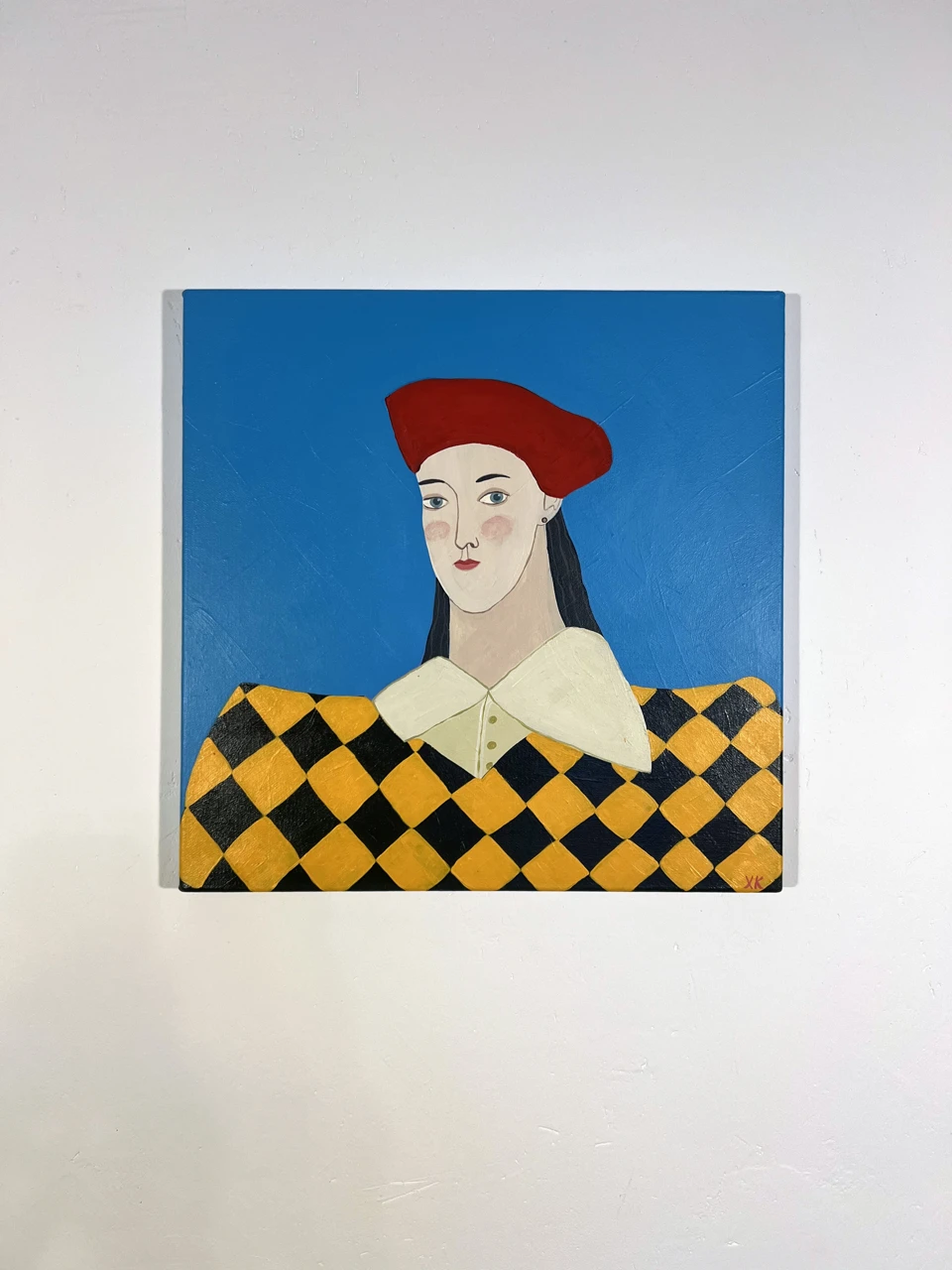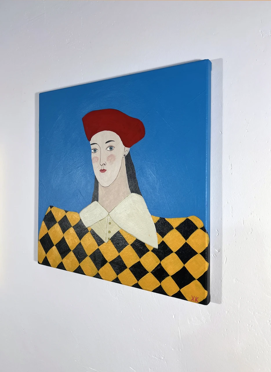 Портрет девушки в ярком пиджаке и берете. Несмотря на небольшой размер, картина эффектно смотрится в интерьере за счет яркого цветового сочетания.