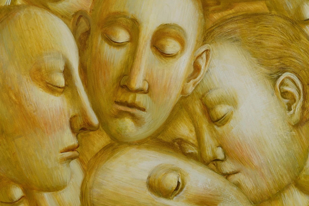 Фигуры с закрытыми глазами находятся в состоянии сна — они не взаимодействуют с внешним миром, а погружены внутрь, в пространство сновидений. Это пространство безопасно , в нём нет боли и тревоги, оно подобно утробе матери. Состояние похожее на сон Сон в данном контексте можно рассматривать как символ перехода в иное измерение сознания, где стираются границы между личным и общим, между реальностью и фантазией. Здесь возможно все: время перестает существовать, лица соединяются, перетекая друг в друга, словно воспоминания или фрагменты сна, сменяющие друг друга в бесконечном потоке.