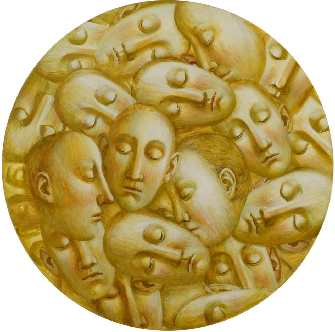Композиция картины построена таким образом, что лица не просто заполняют пространство, а образуют единую массу, напоминающую водоворот мыслей, эмоций, архетипических образов. Круглая форма картины усиливает ощущение замкнутого мира, напоминающего цикл сновидений, где нет начала и конца, где каждое лицо — лишь отражение другого. Здесь нет разобщенности, лишь плавное течение мыслей, образов, чувств, вплетенных в единое целое.