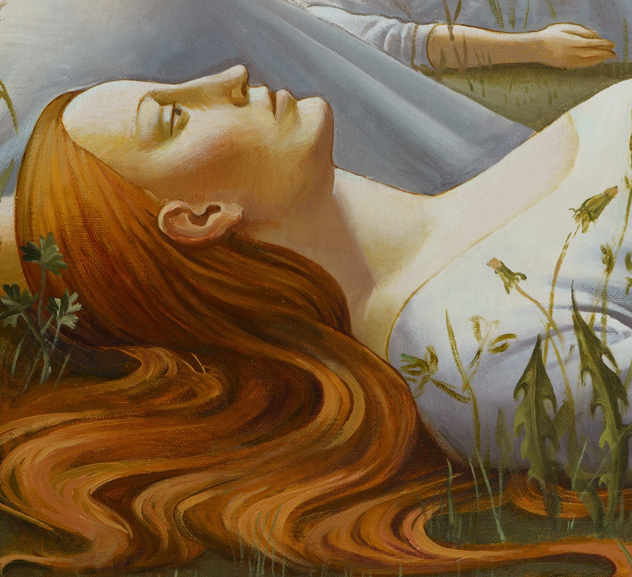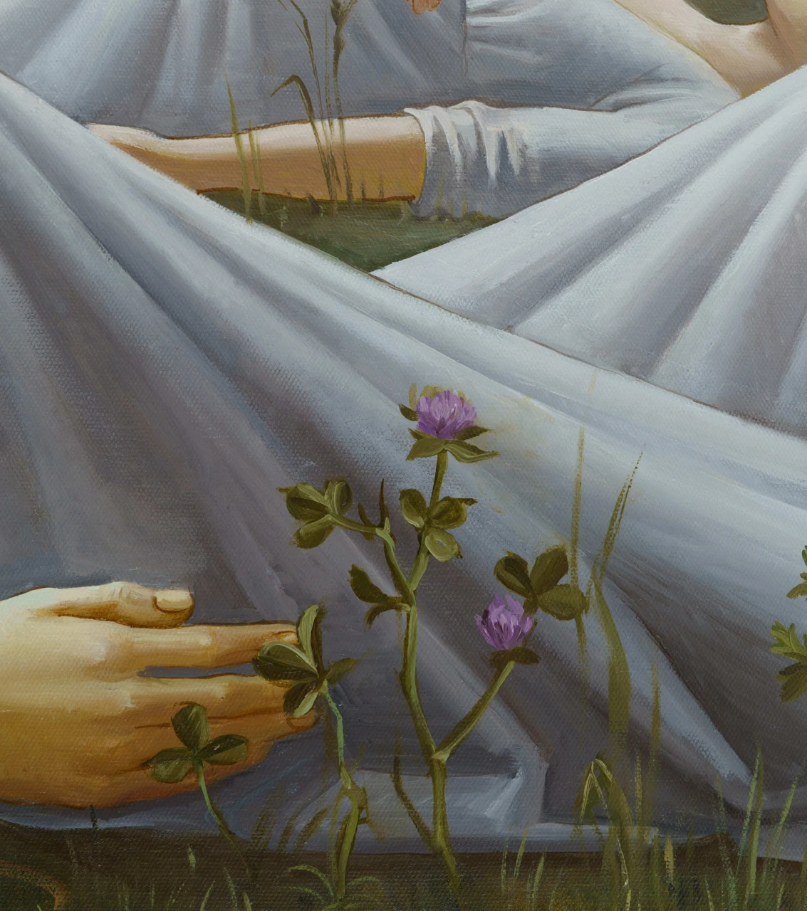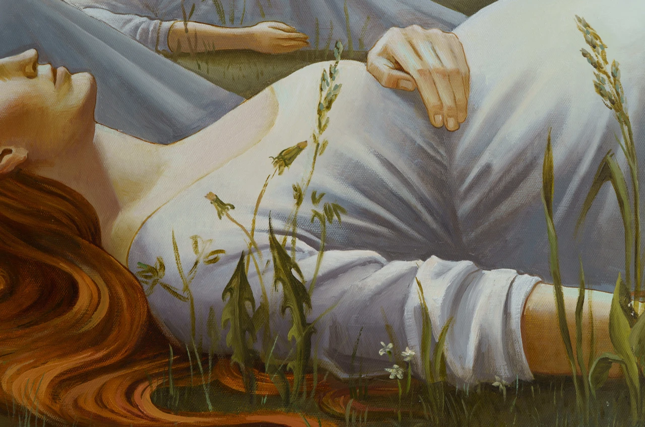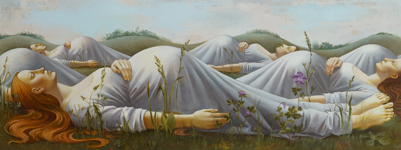 Работа обращается к расхожему выражению «раньше в поле рожали», которое часто используется как аргумент против права женщины на боль, страх и уязвимость в опыте материнства. Эта фраза звучит как обесценивание — как попытка лишить современную женщину права на телесное и эмоциональное переживание, свести сложный и травматичный опыт к бытовому сравнению. Множественные лежащие женские тела отсылают к буквальному прочтению этого выражения. Поле становится пространством, где женское тело превращается в функцию — рожать, выносить, терпеть. Повторяющаяся поза стирает индивидуальность: женщина здесь не личность, а единица, воспроизводимая снова и снова. Не случайно фигуры лишены действия и голоса — они существуют в состоянии пассивности, навязанной извне. Ландшафт, в который вписаны тела, перестаёт быть нейтральным. Земля здесь — не только символ плодородия, а пространство принуждения. Женское тело приравнивается к почве, предназначенной для использования, лишённой права на предел, усталость и отказ.