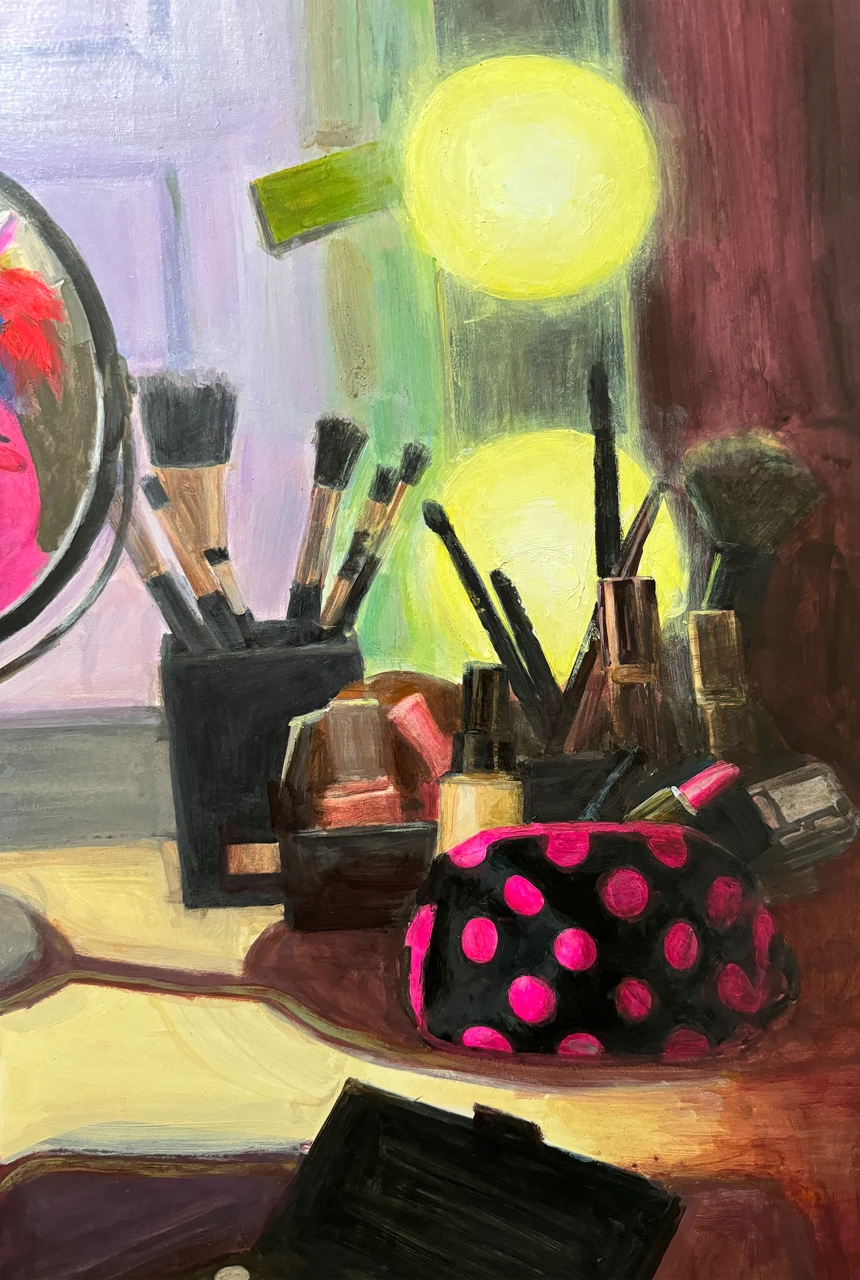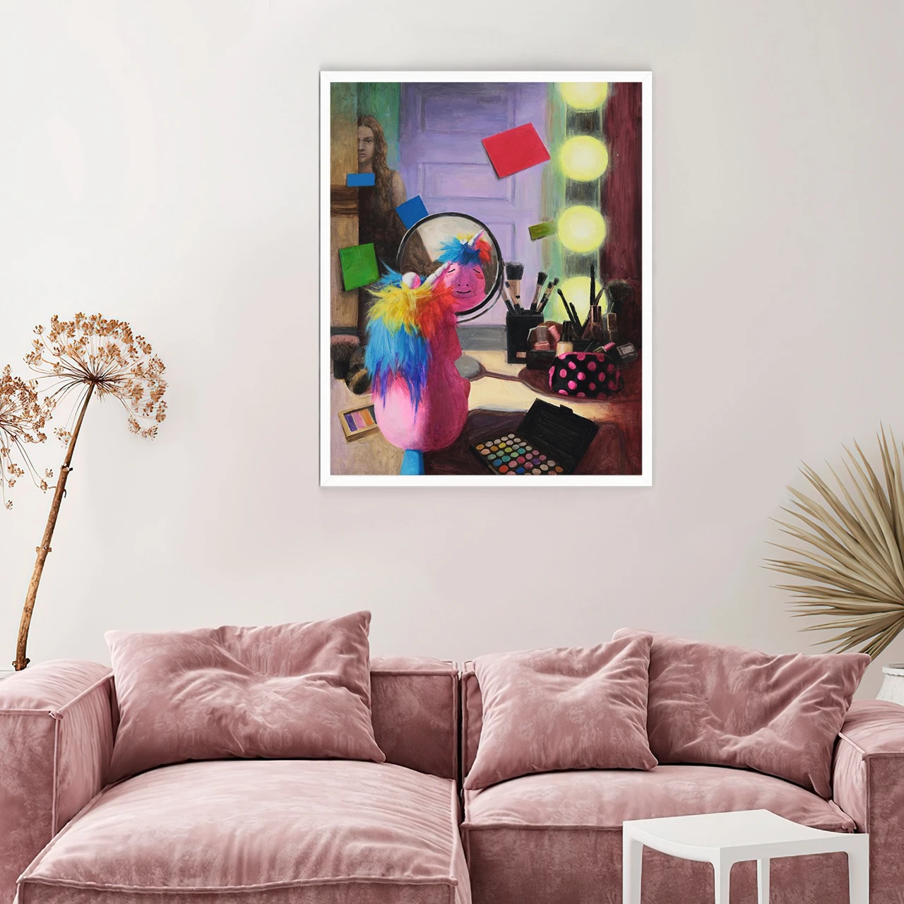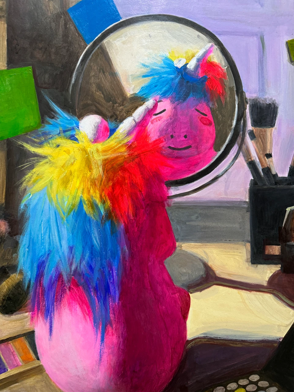 «Единорожка» — камерная, многослойная работа, построенная на игре отражений, масок и идентичностей. Работа разворачивается в пространстве гримёрной: зеркало с круглыми жёлтыми лампами, расставленные кисти, палитра теней, флаконы, косметичка. Всё происходит в закулисном пространстве — месте превращения, где реальность всегда чуть условна.