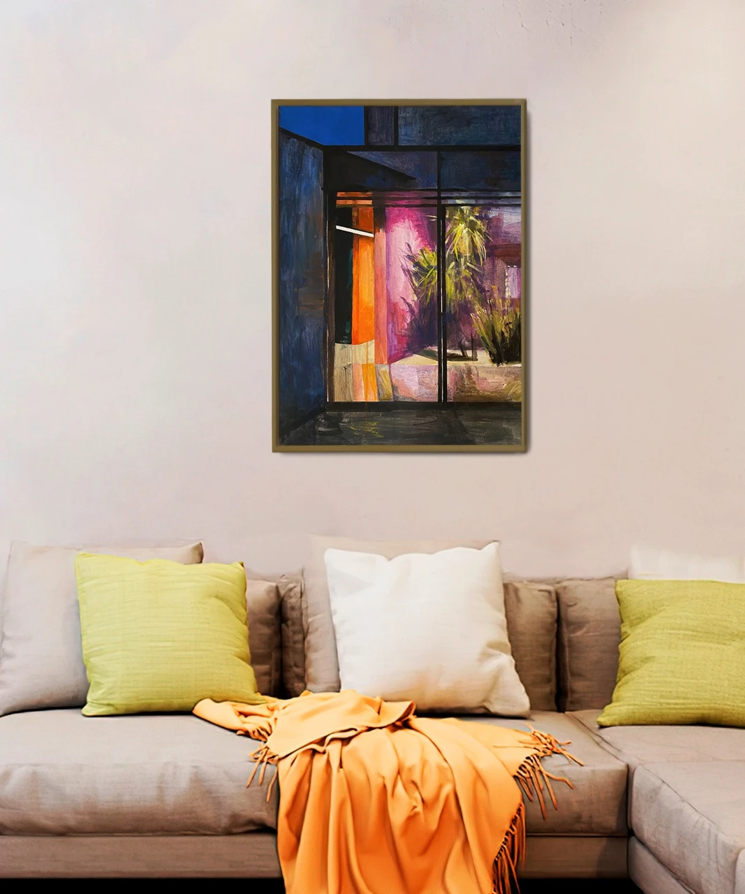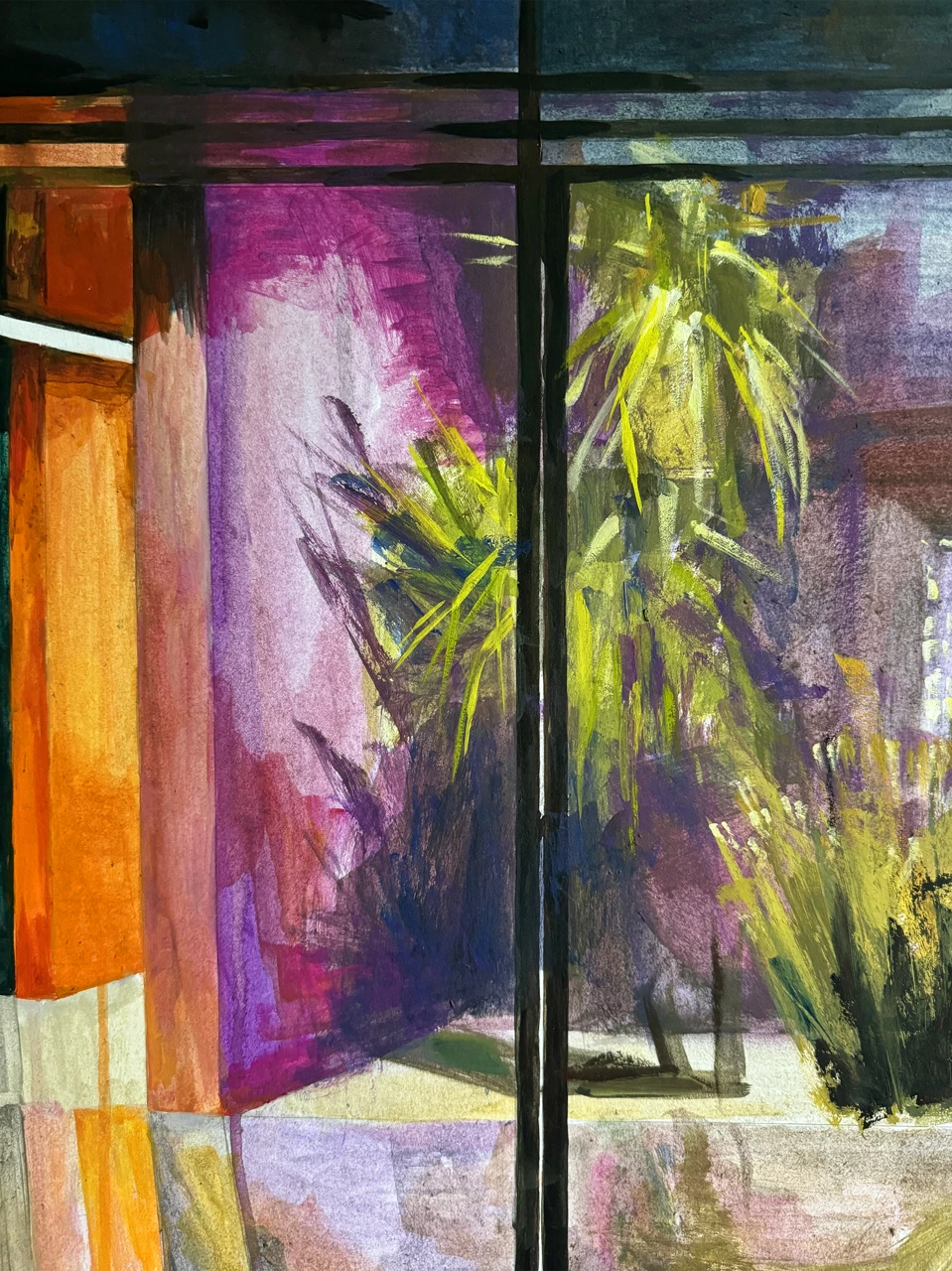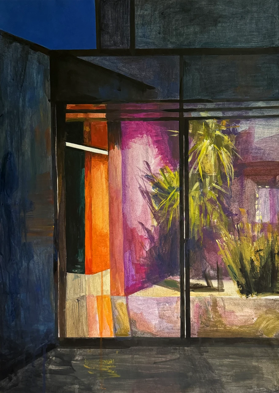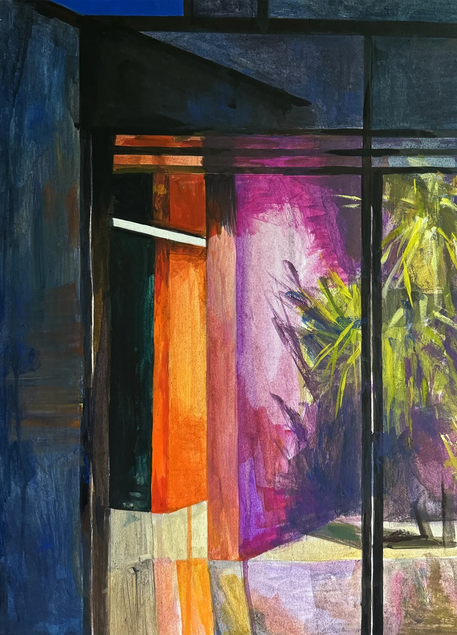 Работа «Пальма» — это авторская графика. Композиция представляет собой вид из окна на тропическое растение. Яркие оранжевые и пурпурные оттенки стен контрастируют с глубоким синим небом и зеленью пальмы, создавая атмосферу теплого вечера. Художник передает игру света и тени, используя экспрессивные мазки. Визуальная глубина достигается за счет контраста между четкими линиями оконных рам и мягкими, размытыми формами растительности и интерьера. Эта авторская работа станет выразительным арт-объектом для интерьера, добавляя ему колорита и утонченности.