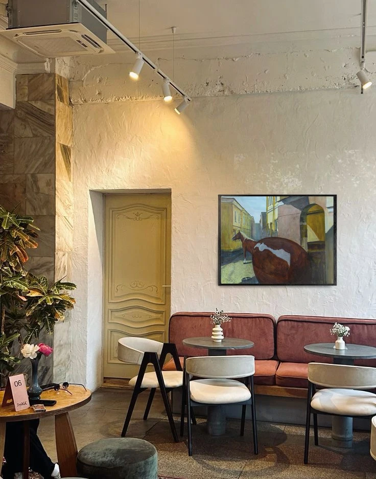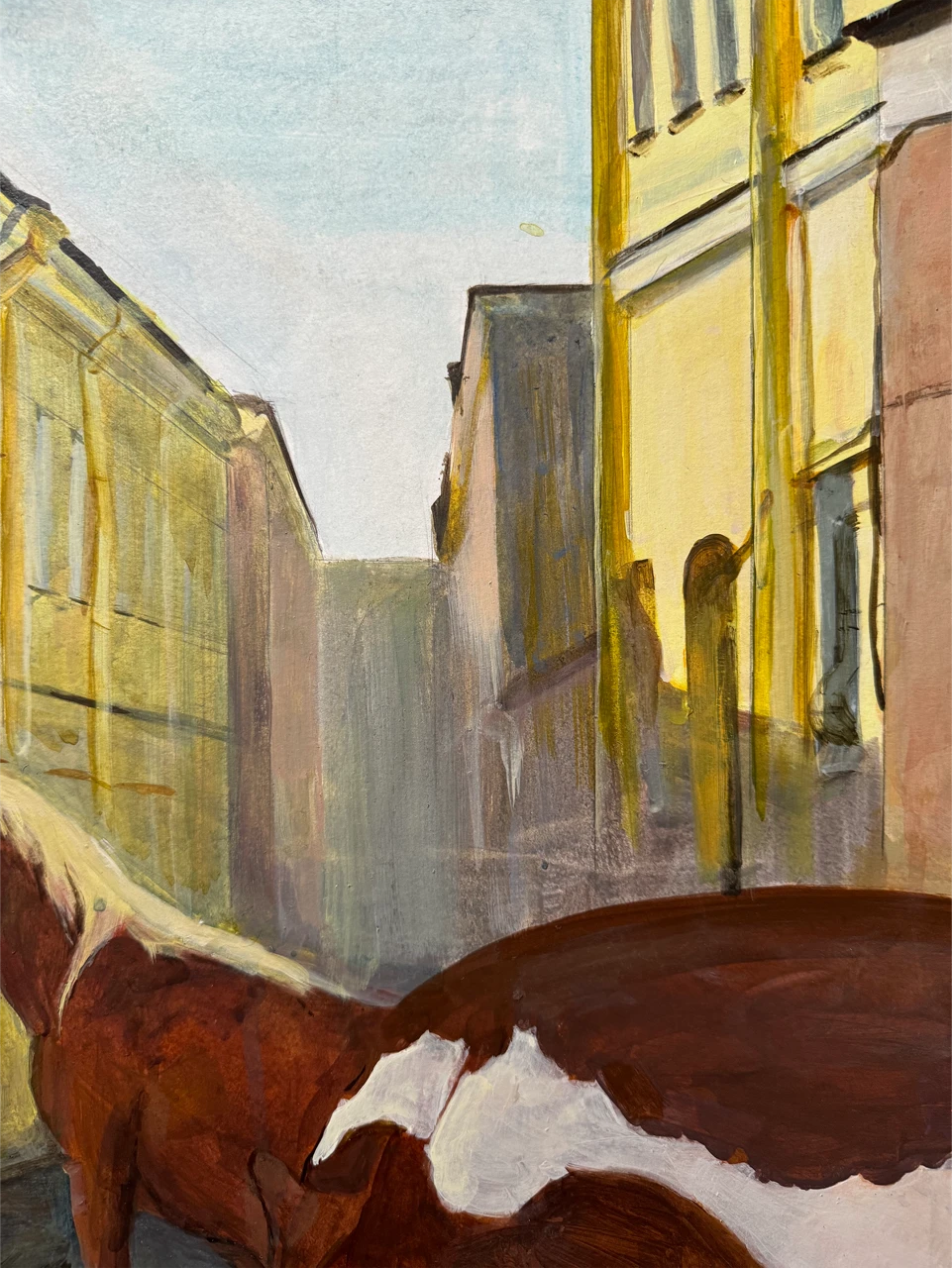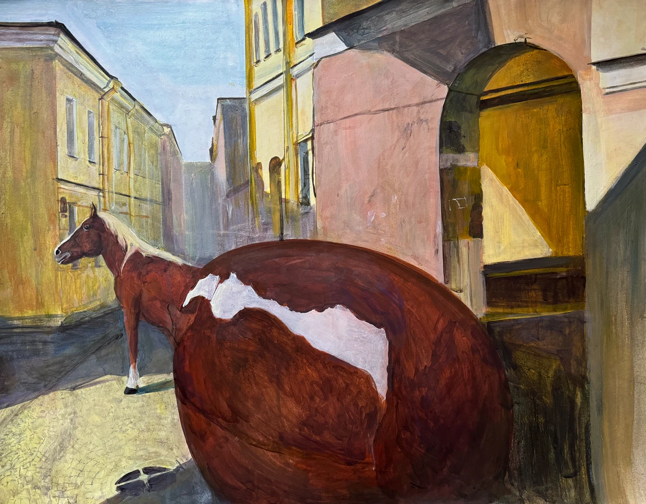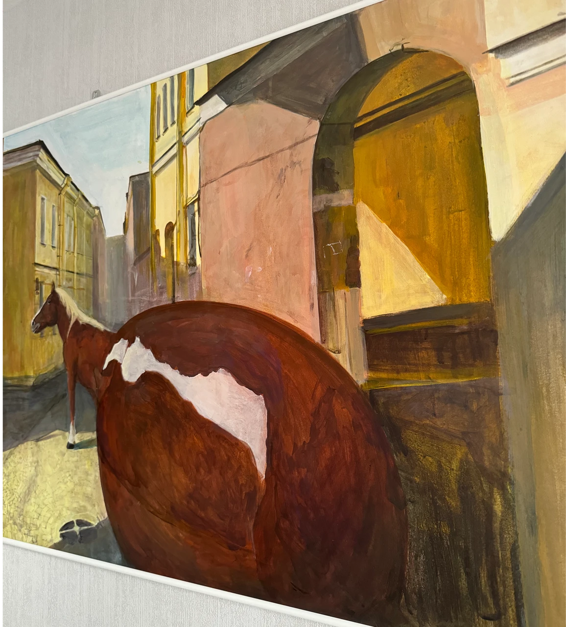 Работа «Утро» — это авторская графика, выполненная акрилом на ватмане. Композиция изображает лошадь, стоящую в узком городском переулке. Фигура животного занимает центральное положение, ее тело представлено в виде массивной, округлой формы, контрастирующей с головой и шеей. Цветовая палитра работы построена на сочетании теплых охристых и коричневых оттенков, характерных для городской застройки, с чуть более холодным небом.