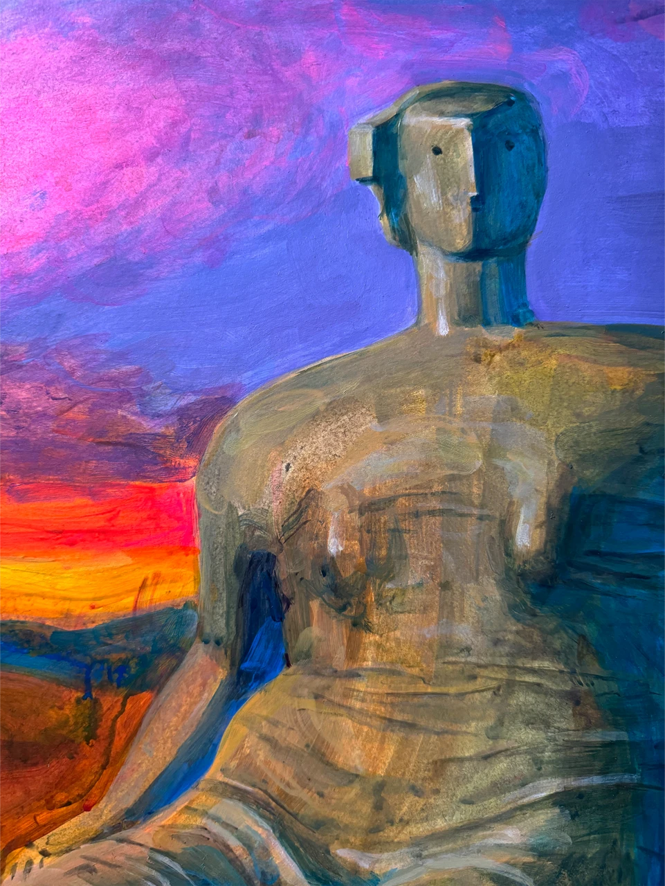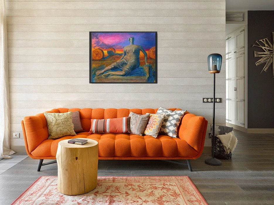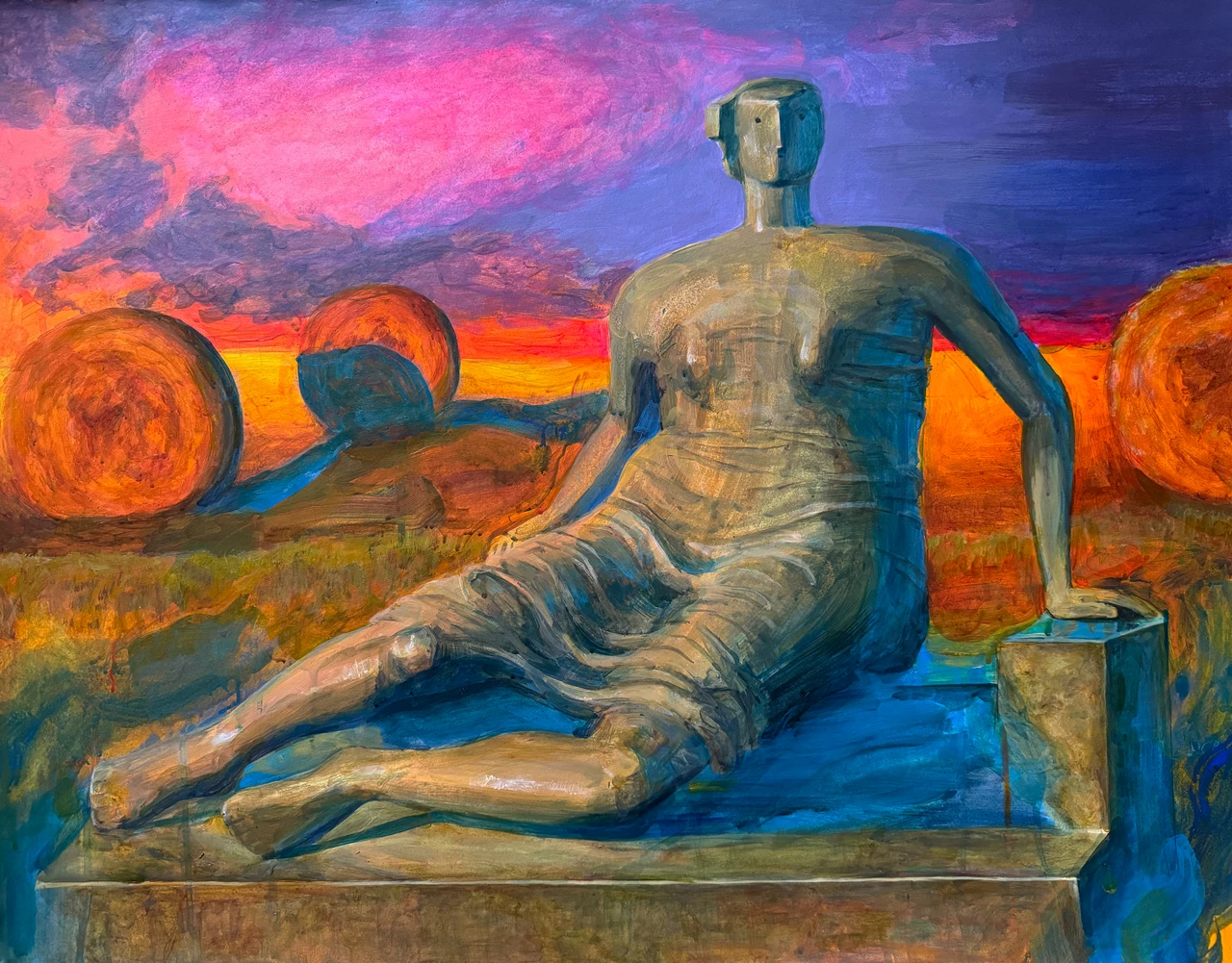 Работа «Вечер» — это авторская графика, выполненная акрилом на ватмане. Композиция представляет собой фигуративное изображение, где центральное место занимает скульптура в приглушенных с зеленоватыми и золотистыми отблесками, создающими ощущение монументальности. Складки одежды на фигуре выполнены динамичными мазками, добавляющими текстуры и объема. Фоном для фигуры служит пейзаж, освещенный заходящим солнцем. Небо переливается от насыщенного фиолетового и розового до ярко-оранжевого у горизонта, создавая ощущение вечернего заката. На дальнем плане видны стога сена и поле.