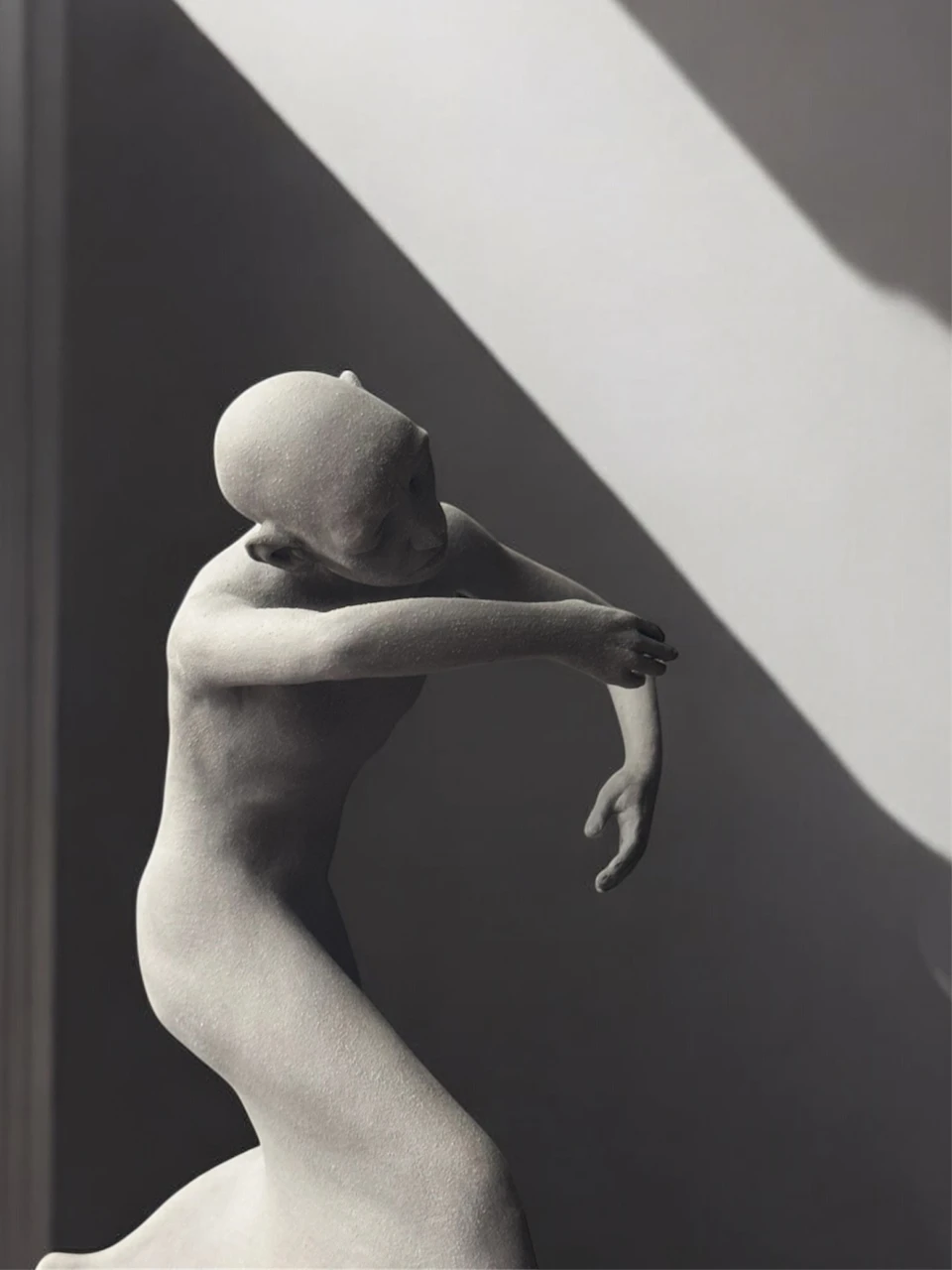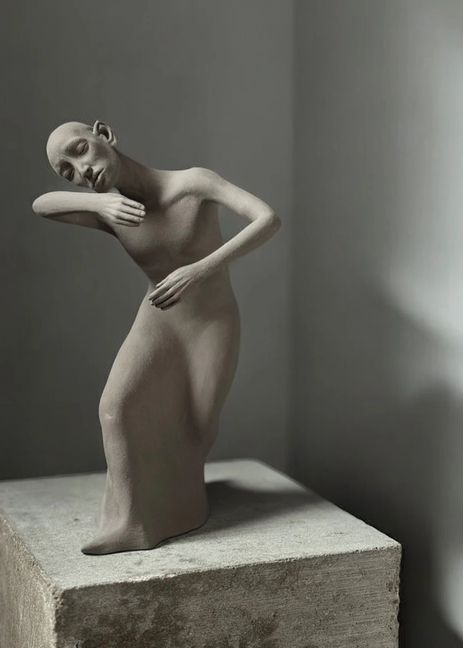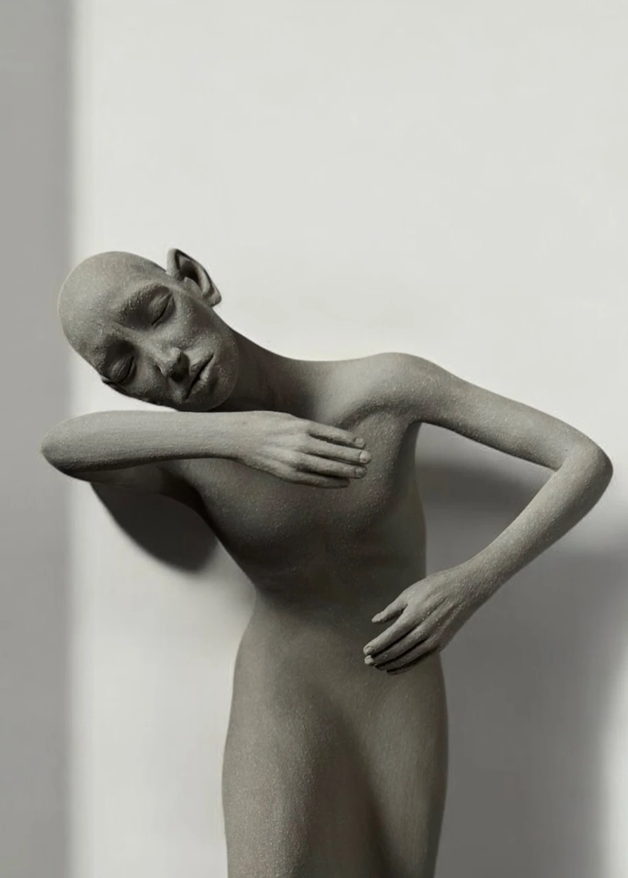 Тело и условное платье сливаются в единый текучий объём. Плавные линии рук словно обнимают невидимую энергию, создавая ощущение медленного, внутреннего танца с собой. Фигура погружена в пространство воспоминаний, где внутреннее становится зримым через форму, а сдержанная пластика соединяет хрупкость и тихую силу эмоций.