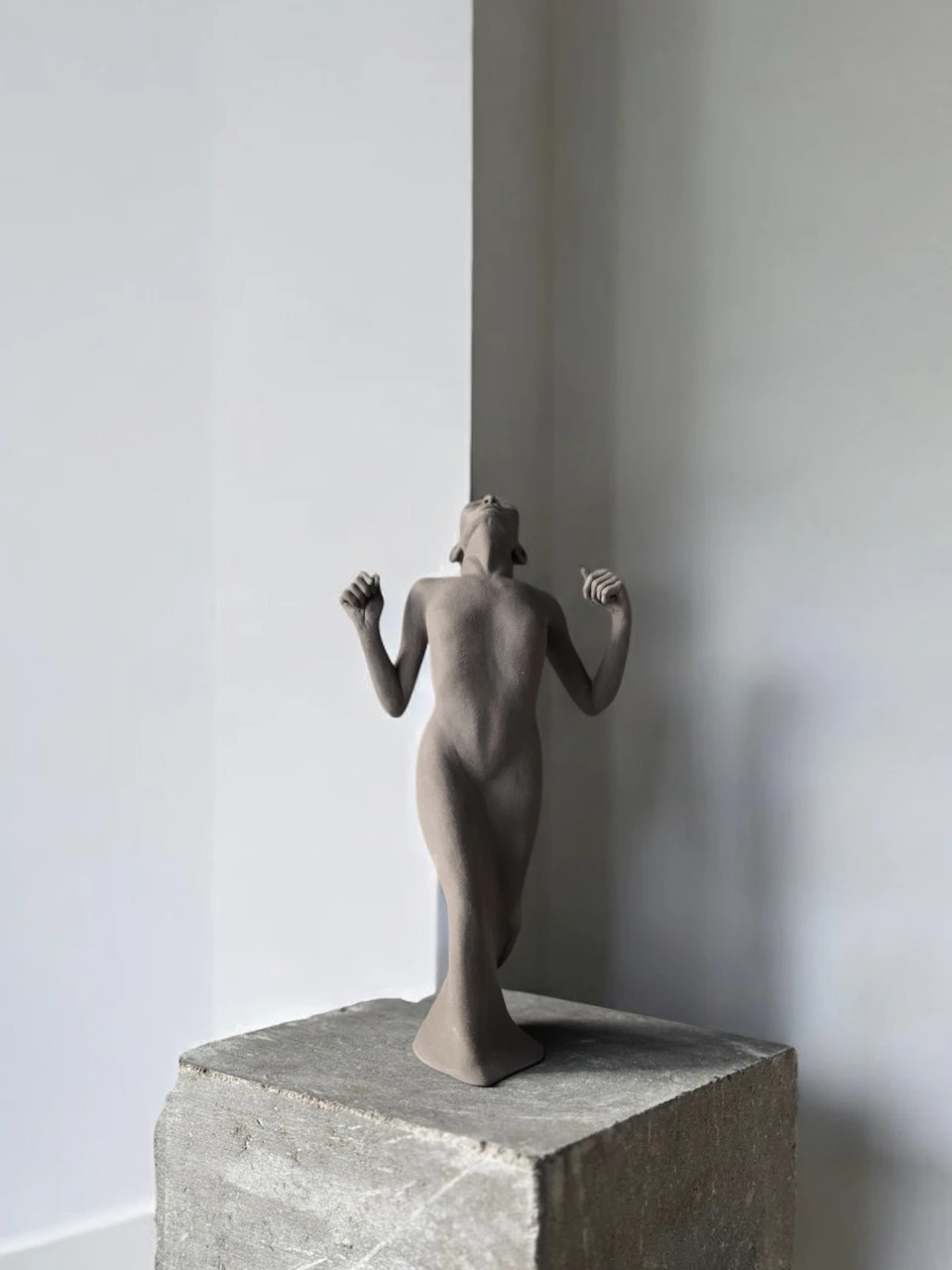 Тело и платье сливаются в единый текучий объём. Поза и изгибы фигуры передают ощущение внутренней борьбы, которая постепенно превращается в движение вперёд, создавая пространство для размышлений. Внутреннее становится зримым через форму, а пластика соединяет хрупкость и глубину эмоционального состояния.