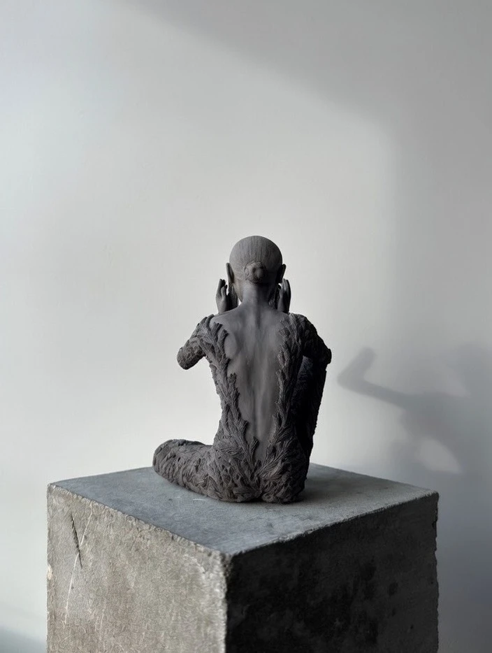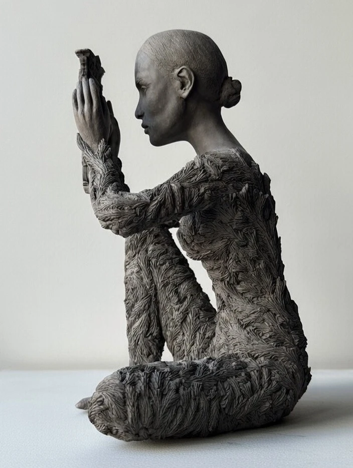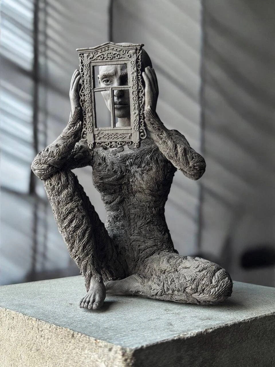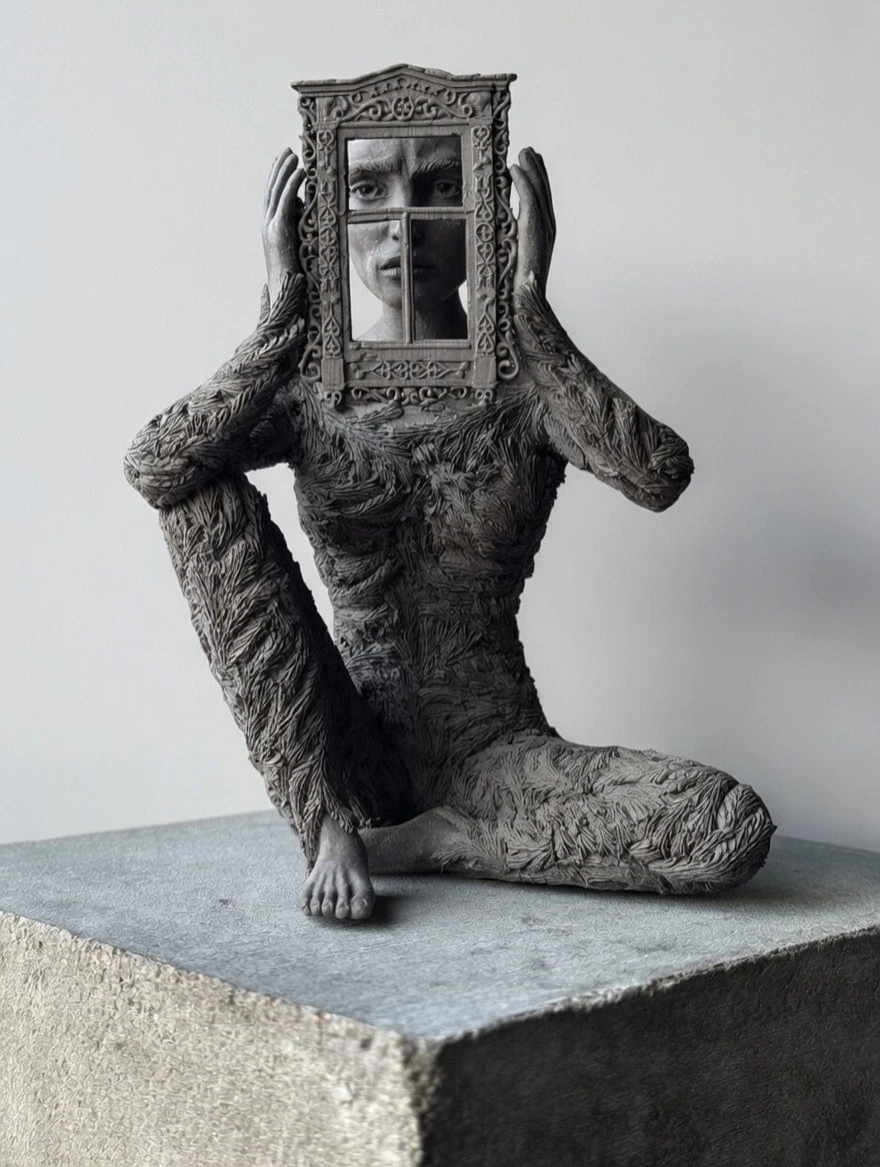 Плавные, но чёткие линии фигуры и окна струятся в едином ритме вопрошания. Эта работа представляет собой углубление в реальность, признание её многомерности. Скульптура превращается в визуальную поэзию внутреннего взгляда, где каждый символ на окне задаёт зрителю тихий вопрос о том, что скрывается по ту сторону.