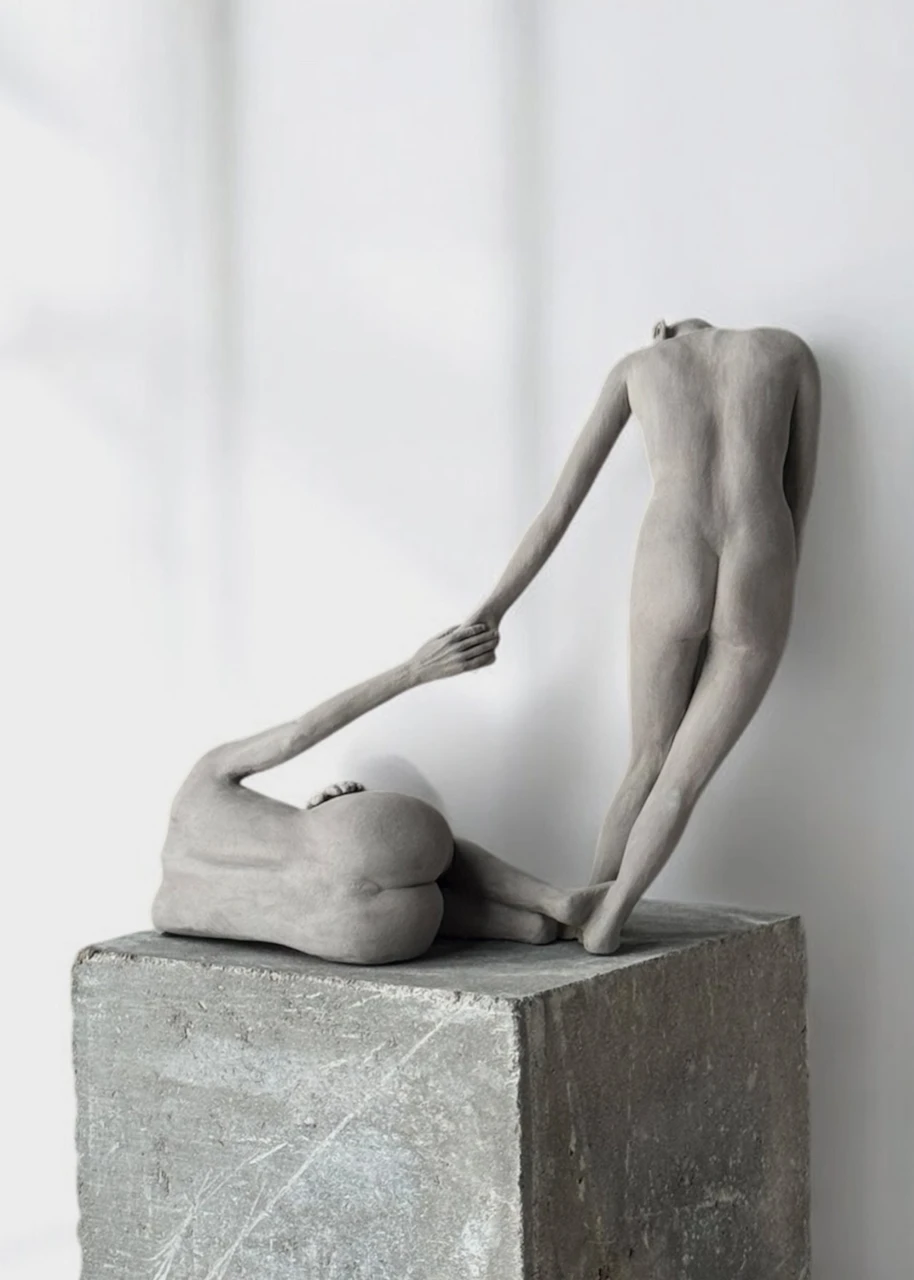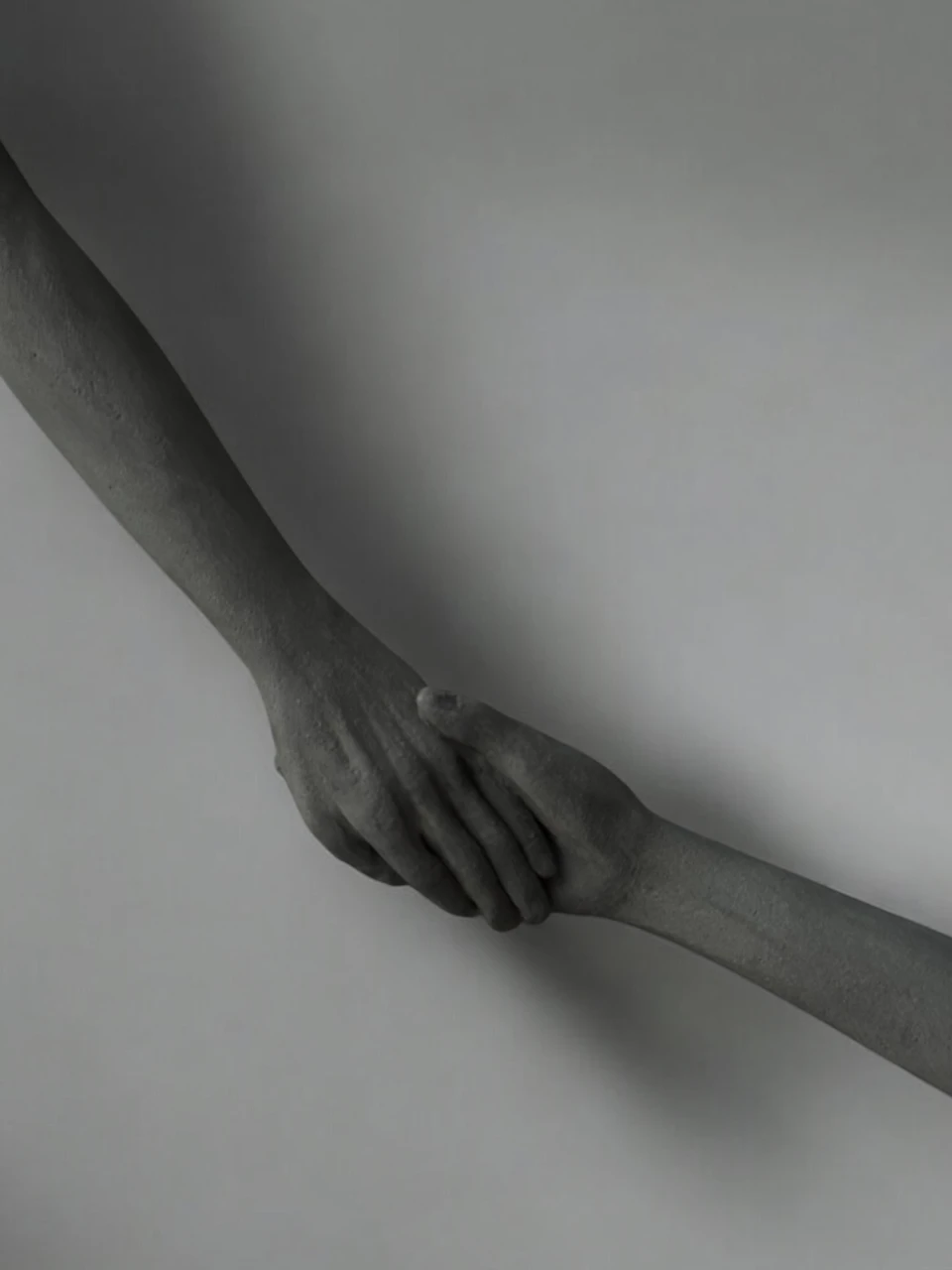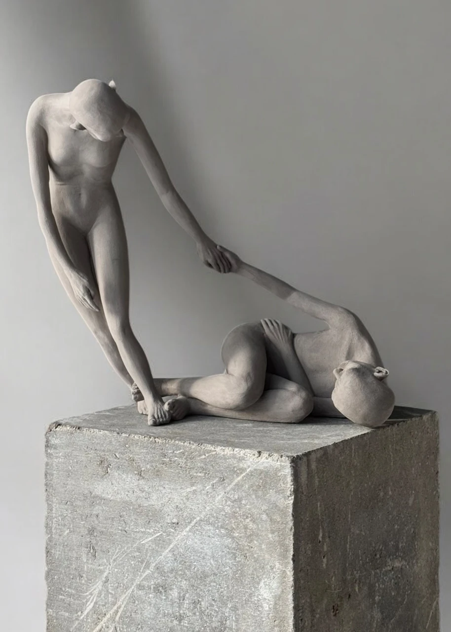Эта скульптура о том, как рождается сила, о мгновении, когда нужно дотронуться до собственной боли, чтобы подняться. Даже если рука, протянутая тебе, это твоя же собственная рука. Одна фигура встречается с другой, превращая уязвимость в жест поддержки и доверия. В этом напряжённом соединении скрыта тихая сила, возможность остановиться и продолжить путь.