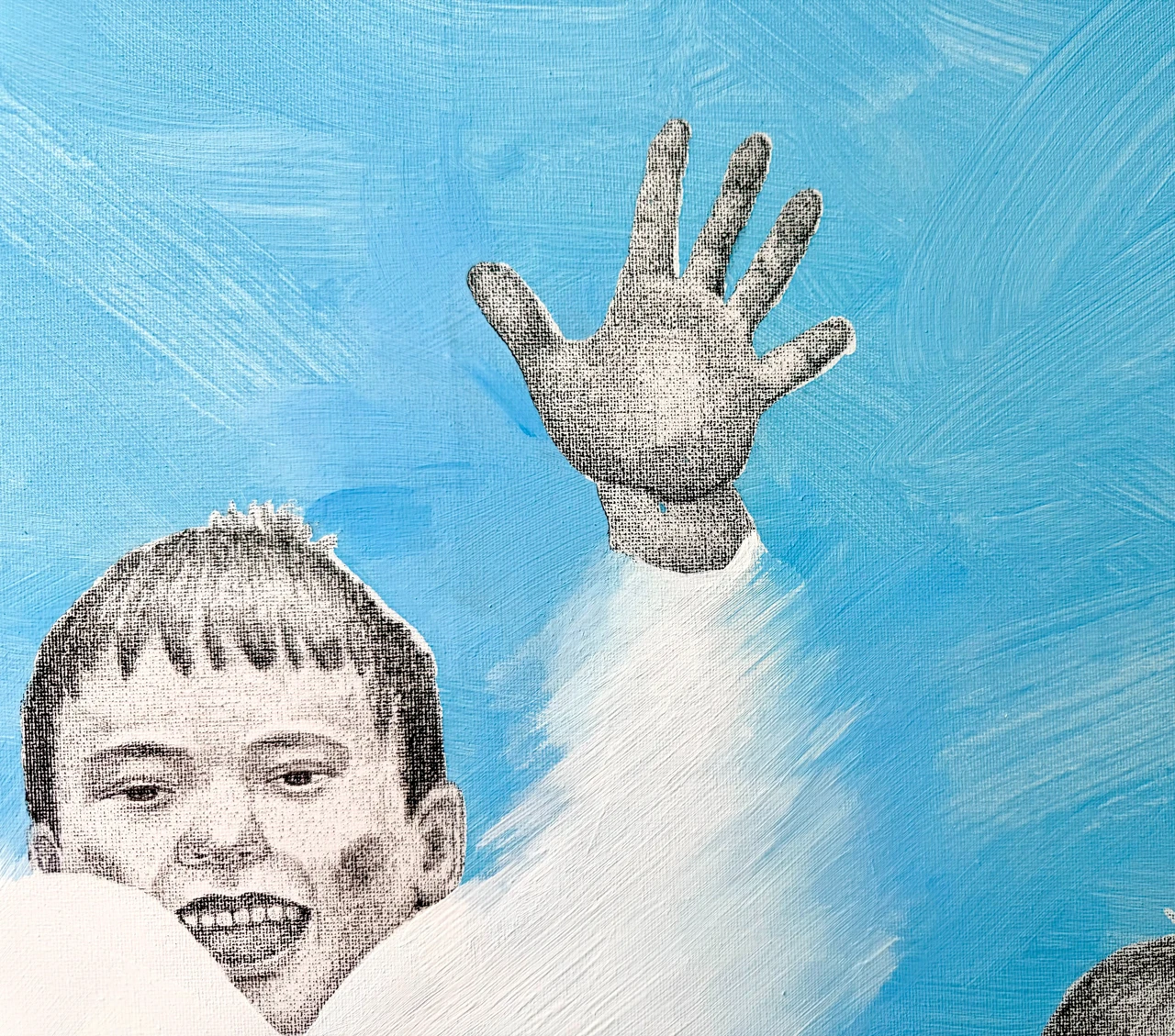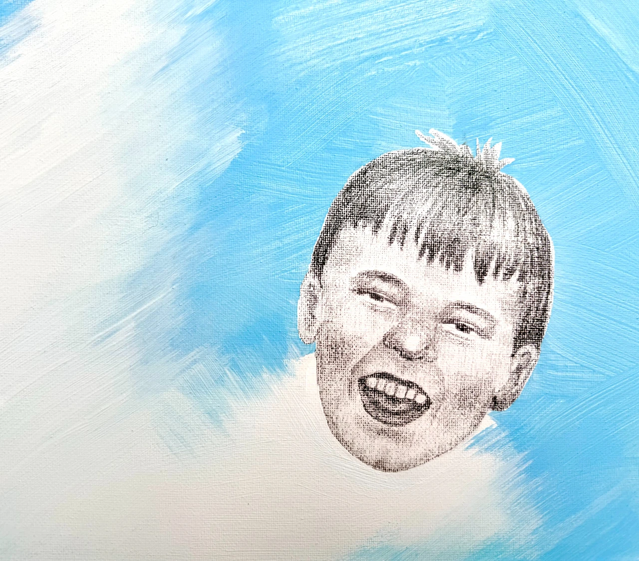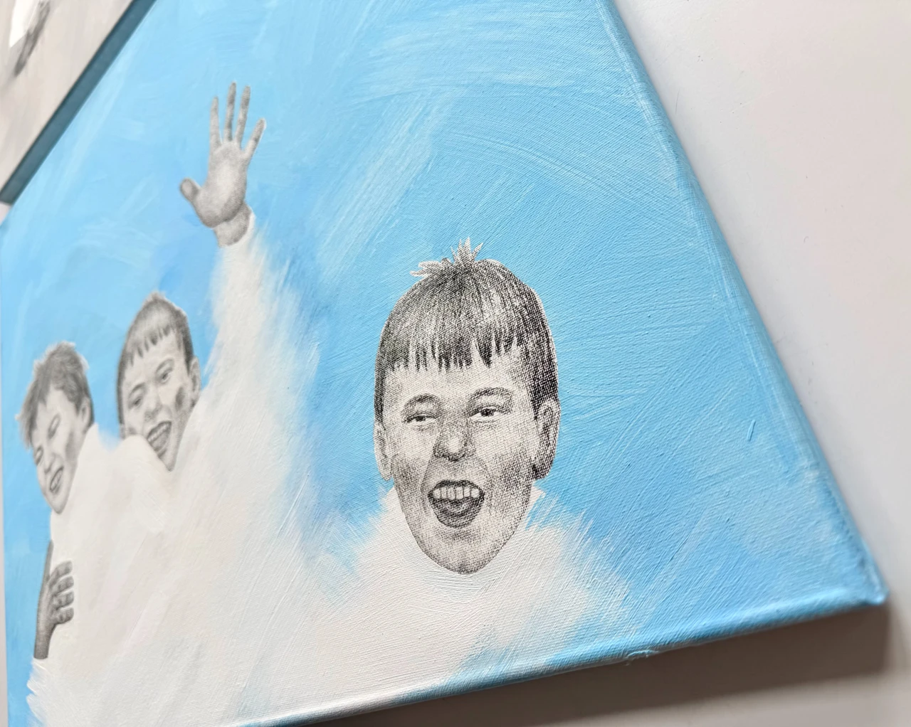 Фигуры ребят намеренно лишены четких границ, символизируя то, как детали стираются со временем, оставляя в памяти добрые воспоминания. Старалась передать, как мы помним прошлое: яркие лица друзей четко остаются в памяти, их я проработала углем, в то время как контекст растворился акриловыми красками, передавая ощущение солнечного дня во дворе.