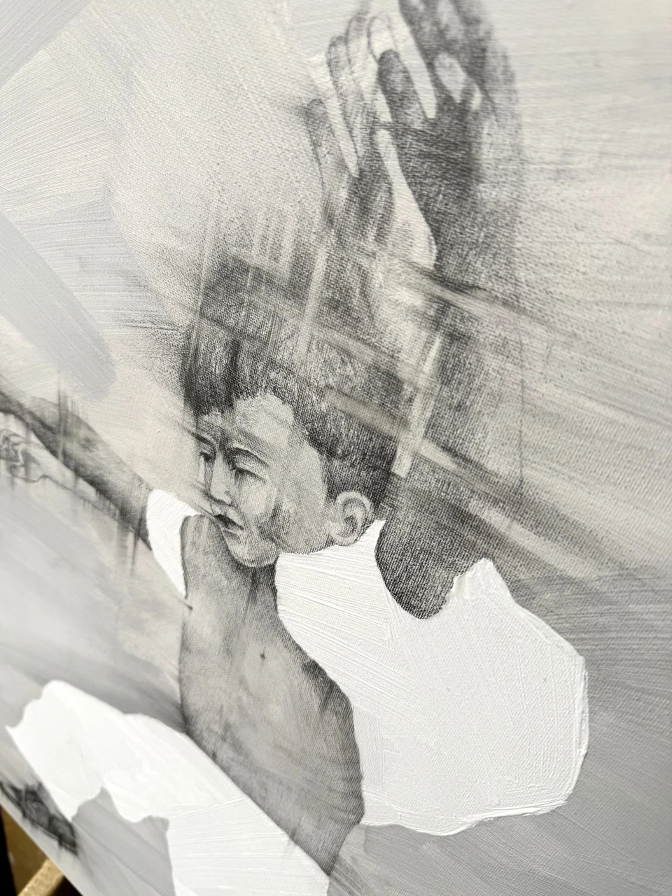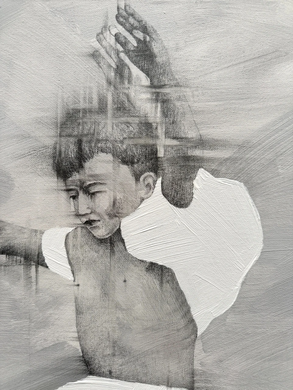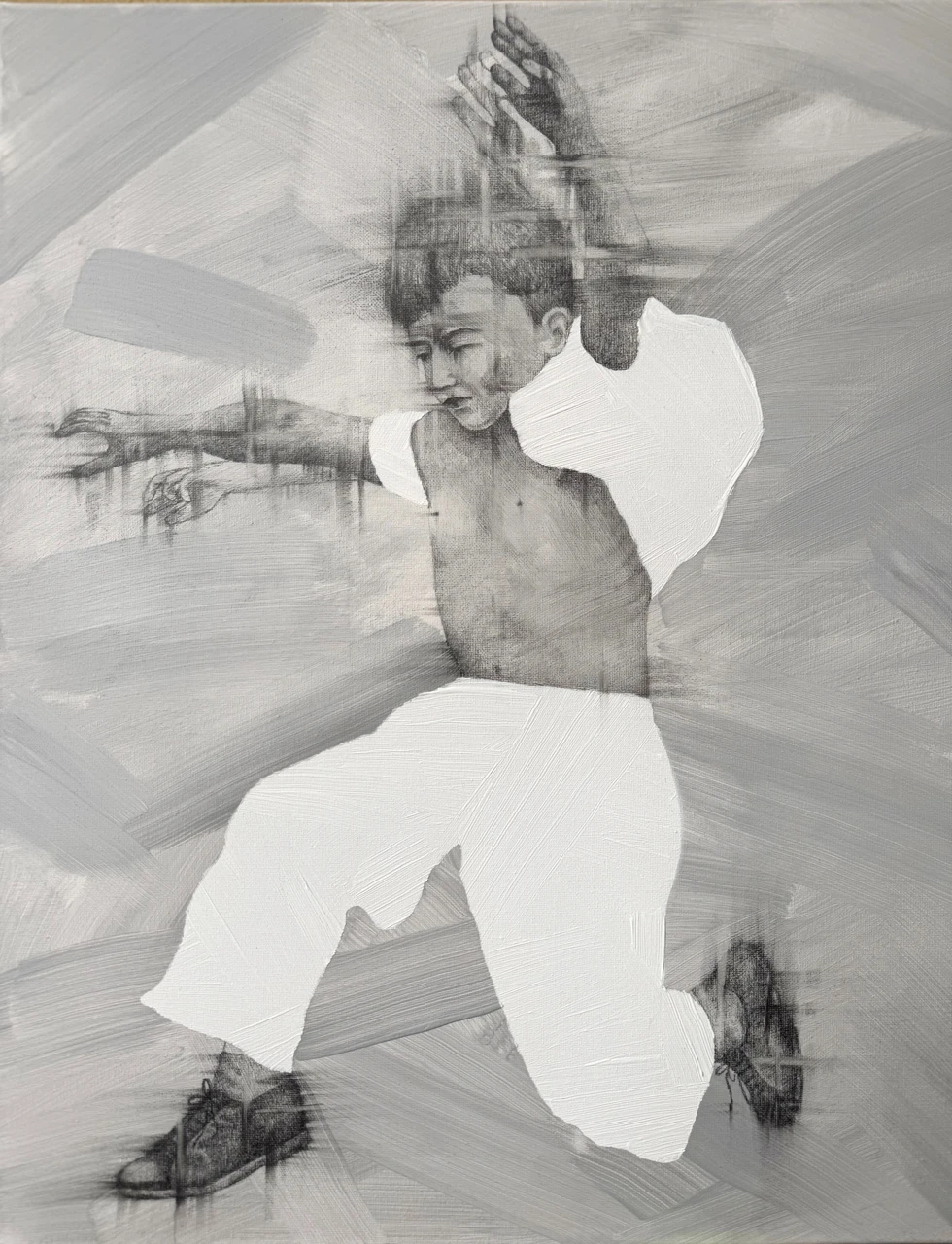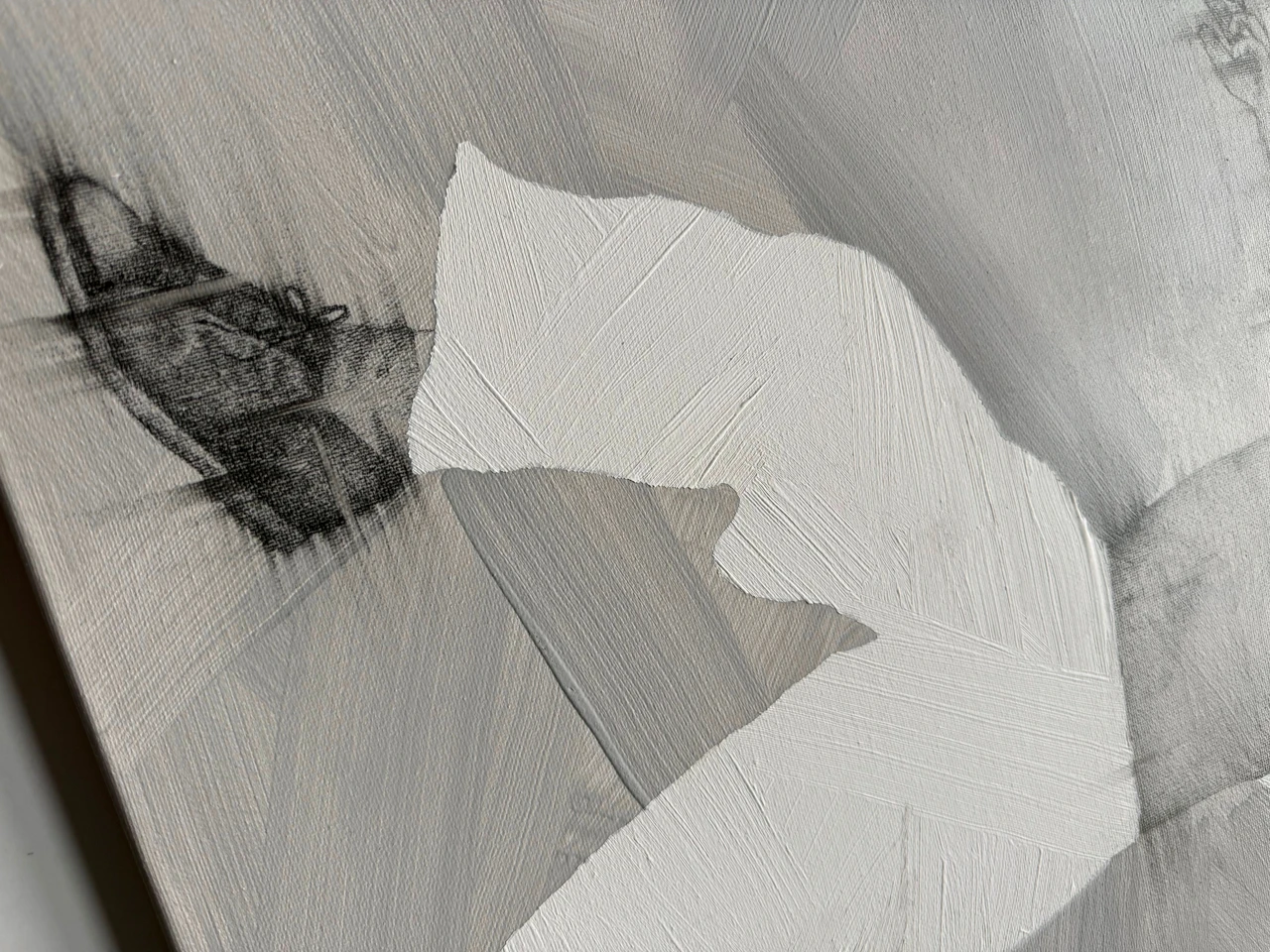 Концептуальная работа на стыке живописи и графики балансирует между гиперреализмом и абстракцией. На ней присутствуют две скорости: медленная, кропотливая штриховка тела и стремительный, размашистый жест фоновых мазков.
