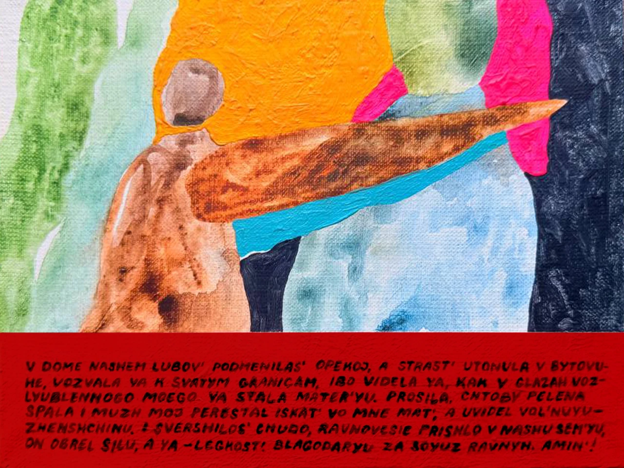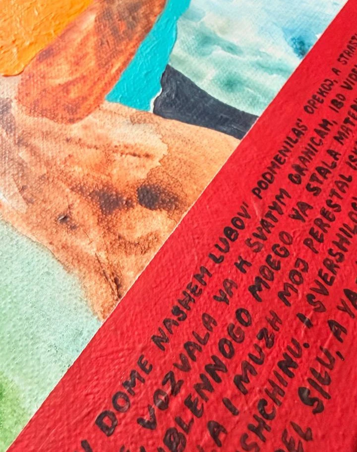 Для усиления аутентичности я использую транслитерацию: русский текст, записанный латиницей. Это придает работам характерный наивный облик традиционных ретаблос, превращая привычные фразы в зашифрованные послания о бытовом чуде. Текст на русском: