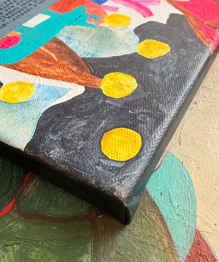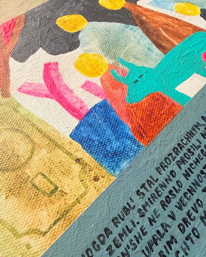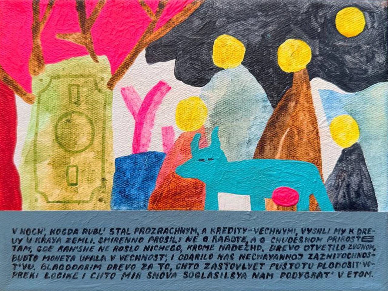 Для усиления аутентичности я использую транслитерацию: русский текст, записанный латиницей. Это придает работам характерный наивный облик традиционных ретаблос, превращая привычные фразы в зашифрованные послания о бытовом чуде. Текст на русском: