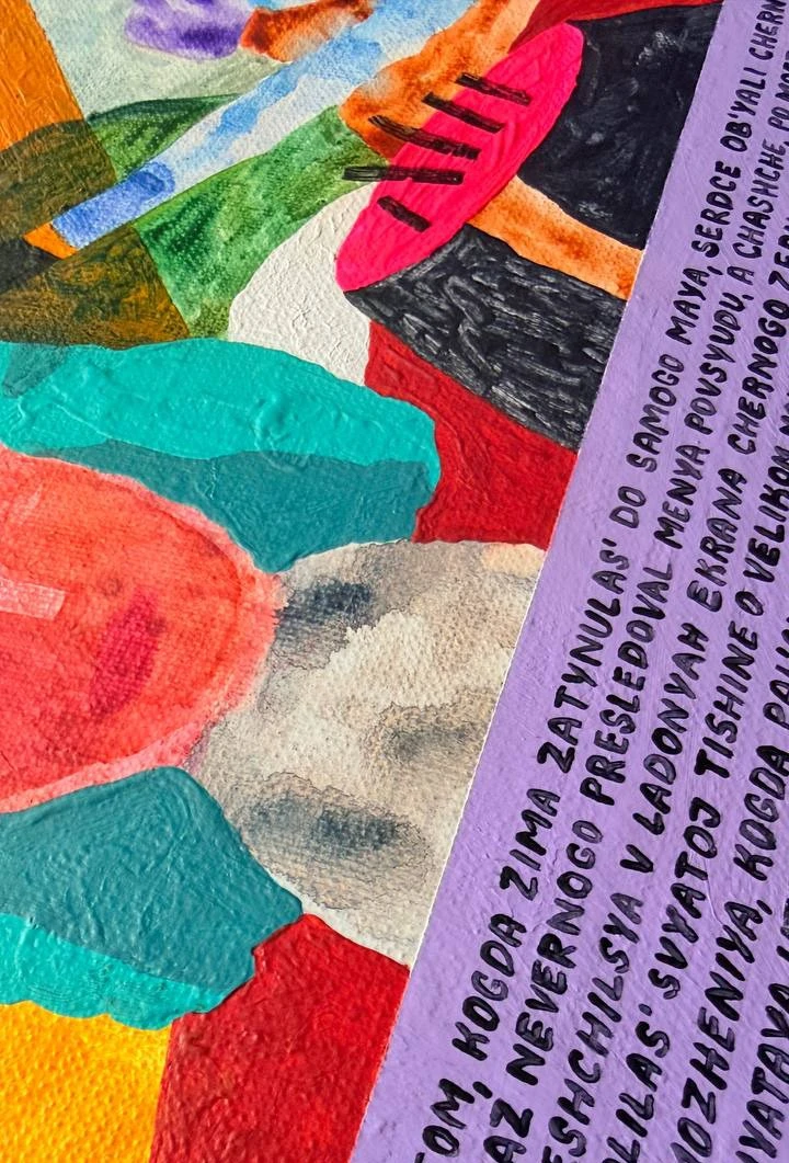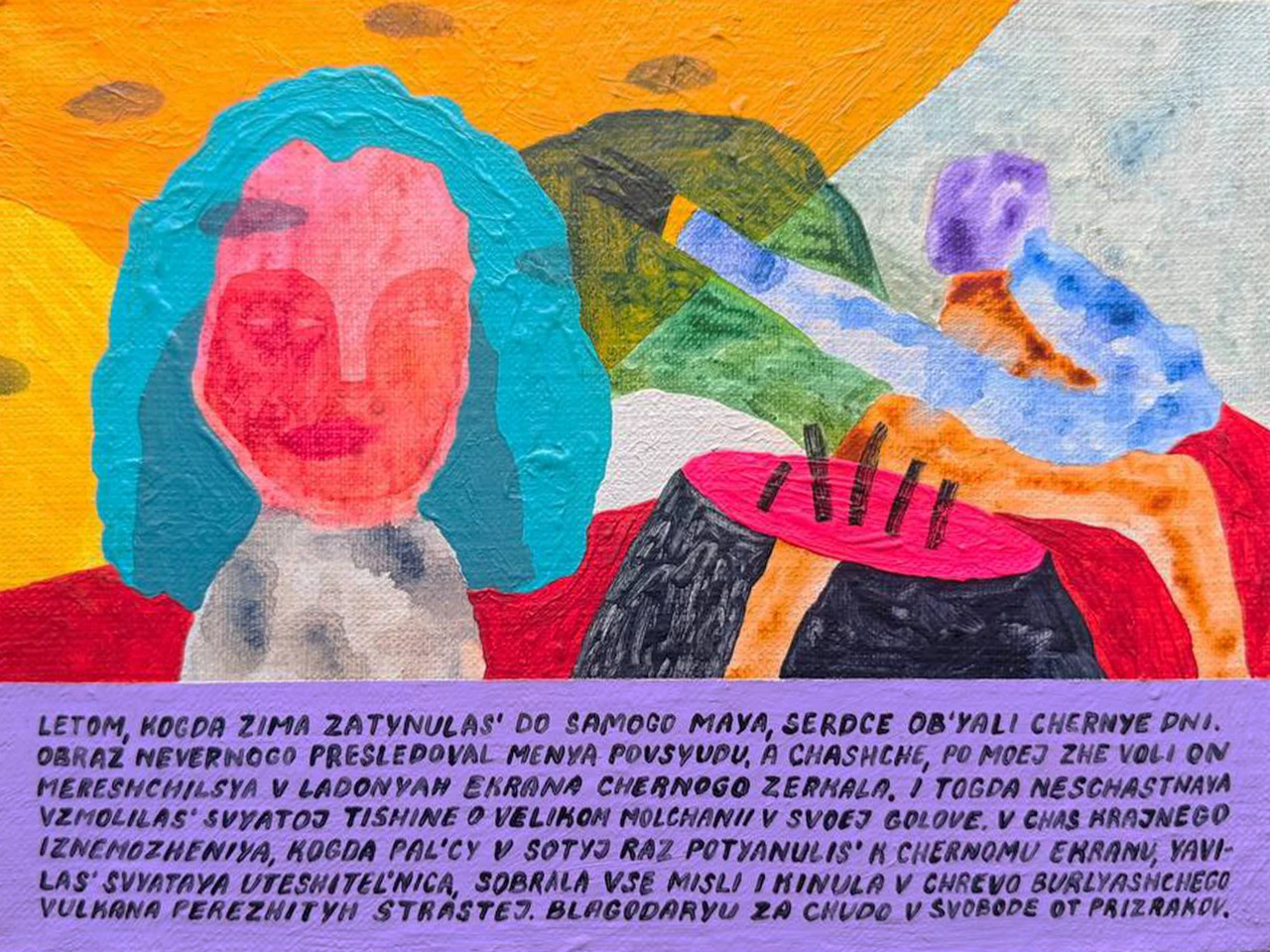 Для усиления аутентичности я использую транслитерацию: русский текст, записанный латиницей. Это придает работам характерный наивный облик традиционных ретаблос, превращая привычные фразы в зашифрованные послания о бытовом чуде. Текст на русском: