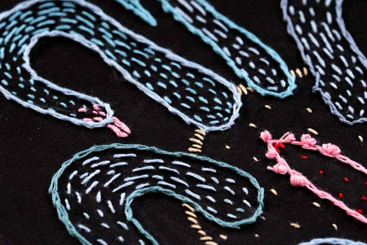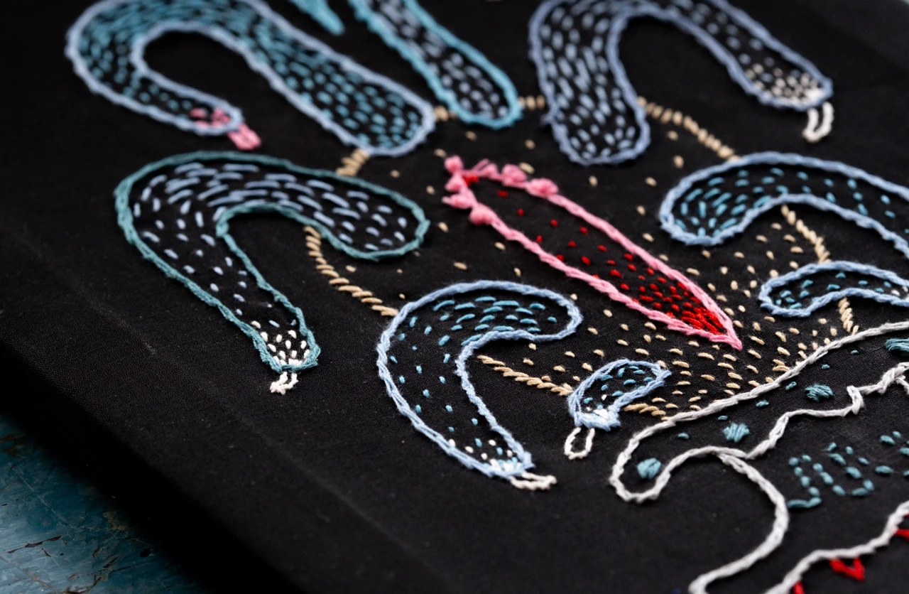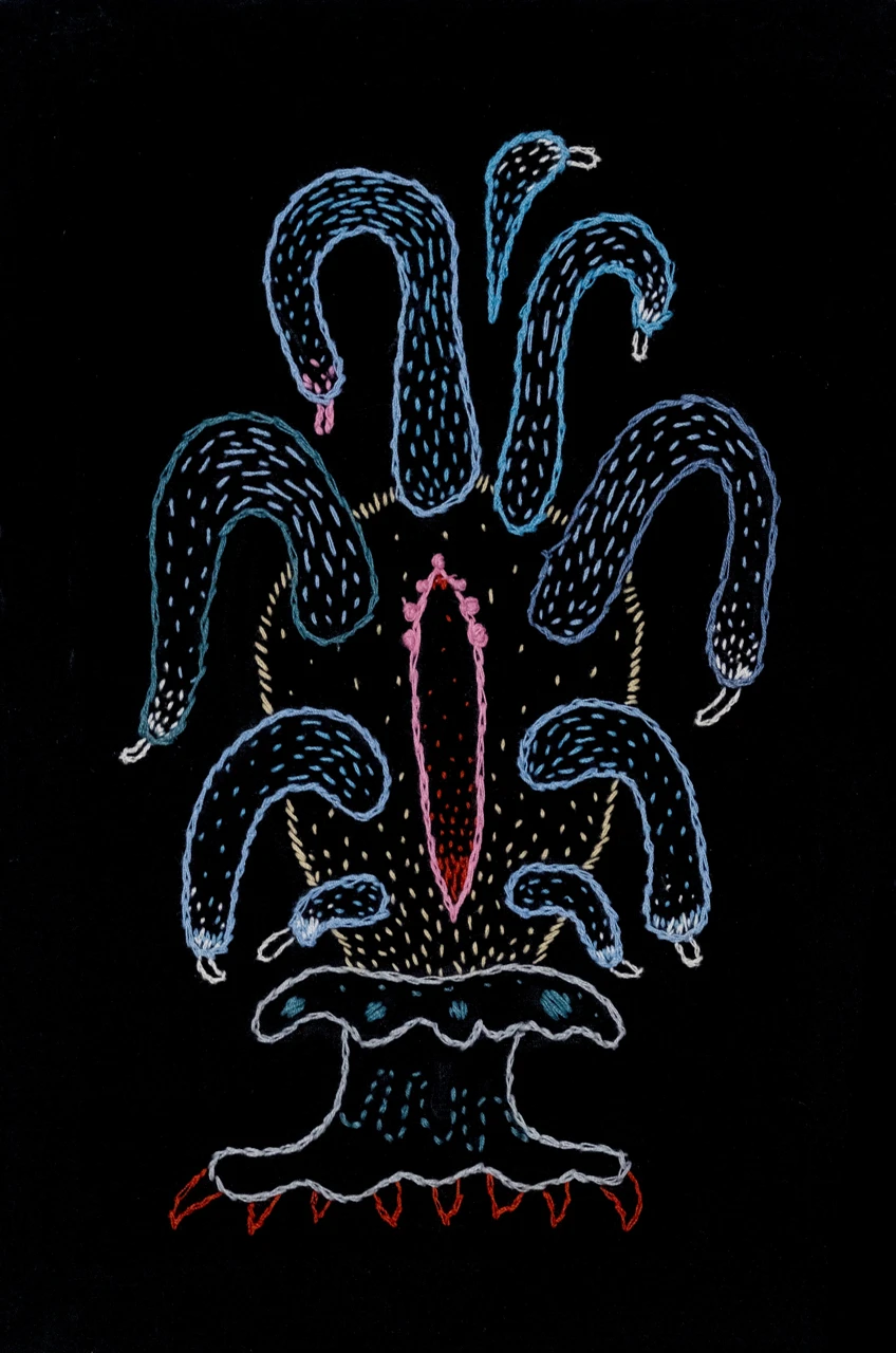 Визуально вышивка напоминает одновременно и фантастическое растение, и древний идол, и водный поток: из центра «фонтана» расходятся текучие линии, похожие на змеиные головы или стебли, из которых течёт энергия. Центральный розово-красный овал ассоциируется с лоном, с пульсирующим источником жизни. Вокруг — множественные «струи», разнонаправленные, но подчинённые общей динамике, как символ того, что из единого центра рождаются бесконечные формы.