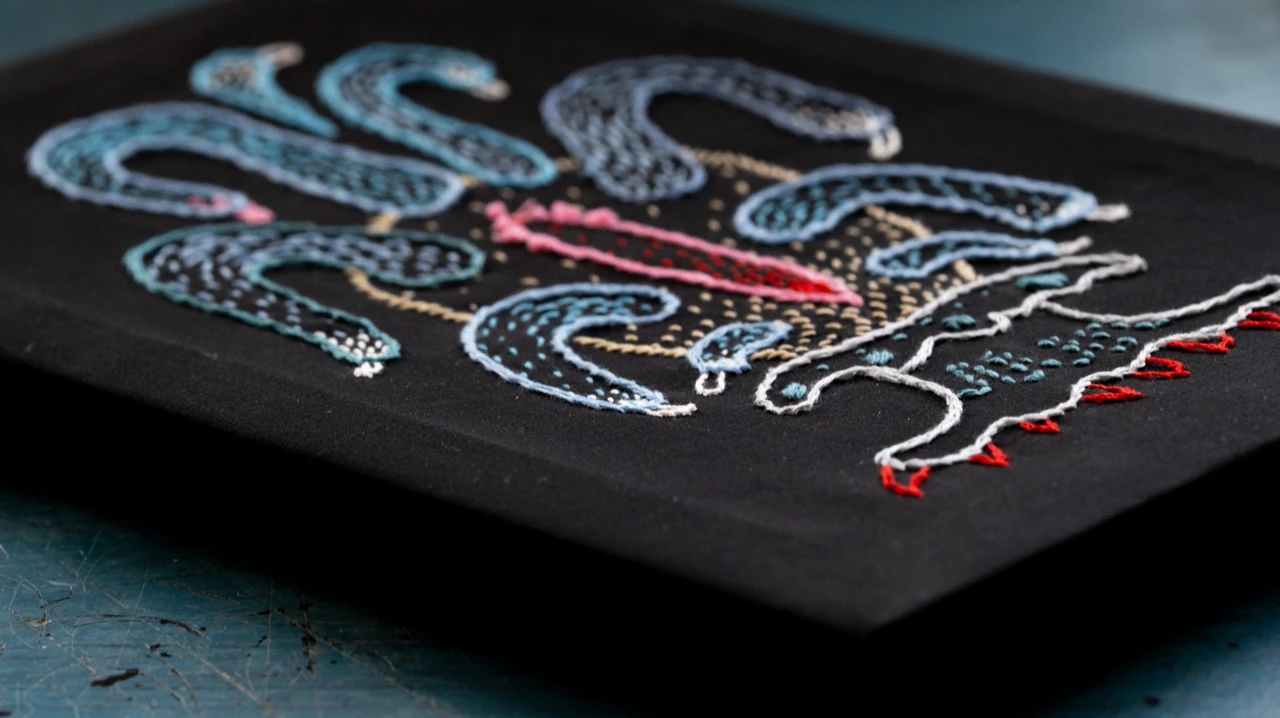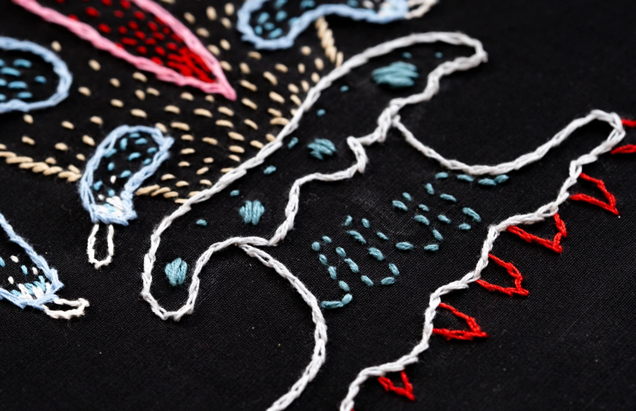Черный фон превращает образ в сакральный, почти иконный: он поглощает свет и выделяет цветные нити, словно ореол. Вышивка здесь выступает не как декоративный приём, а как ритуальный жест: каждая строчка фиксирует импульс, превращая его в знак.