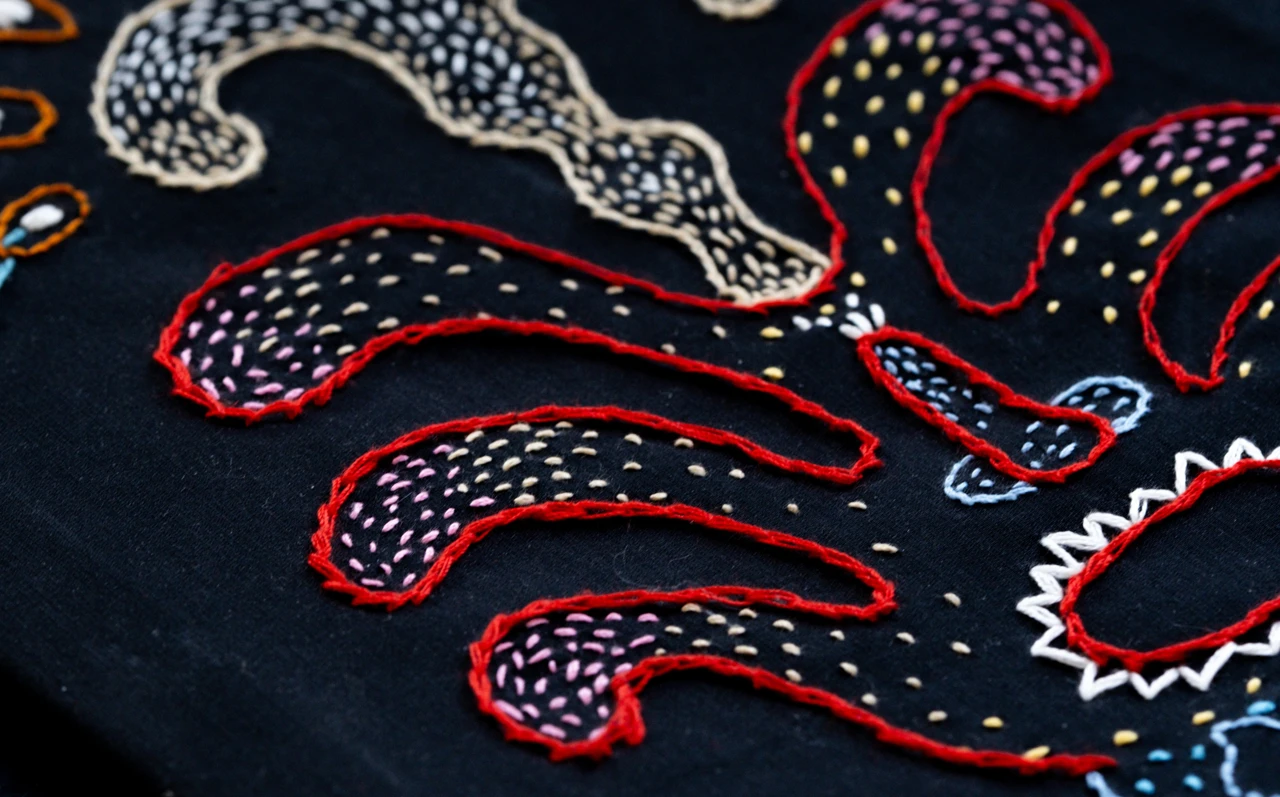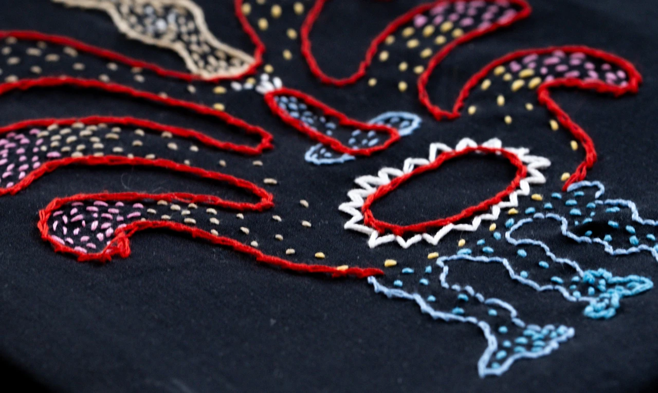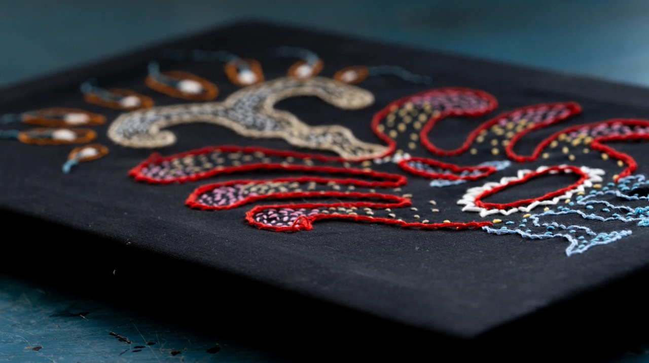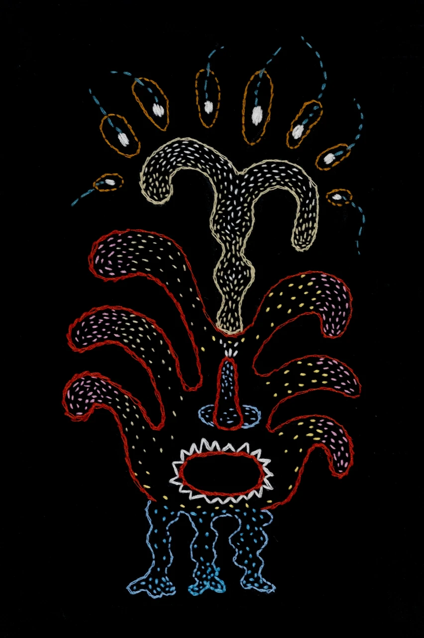 Черный фон превращает образ в сакральный, почти иконный: он поглощает свет и выделяет цветные нити, словно ореол. Вышивка здесь выступает не как декоративный приём, а как ритуальный жест: каждая строчка фиксирует импульс, превращая его в знак.