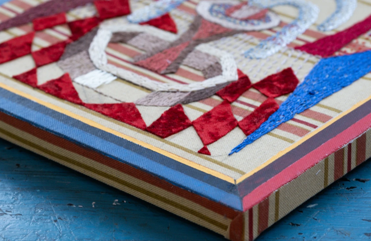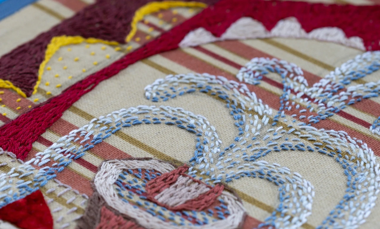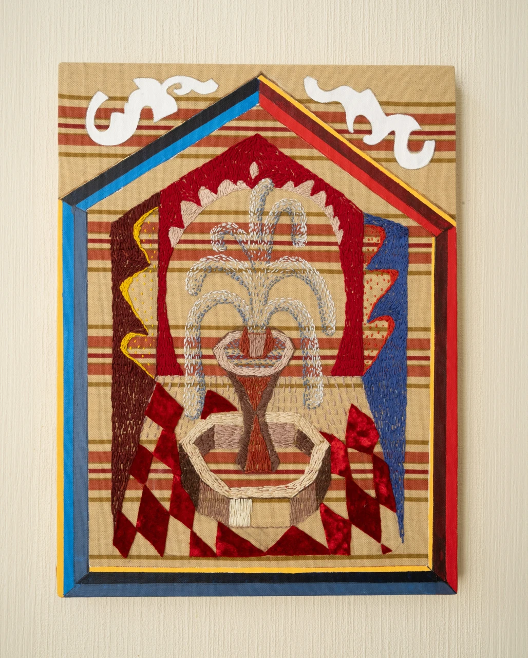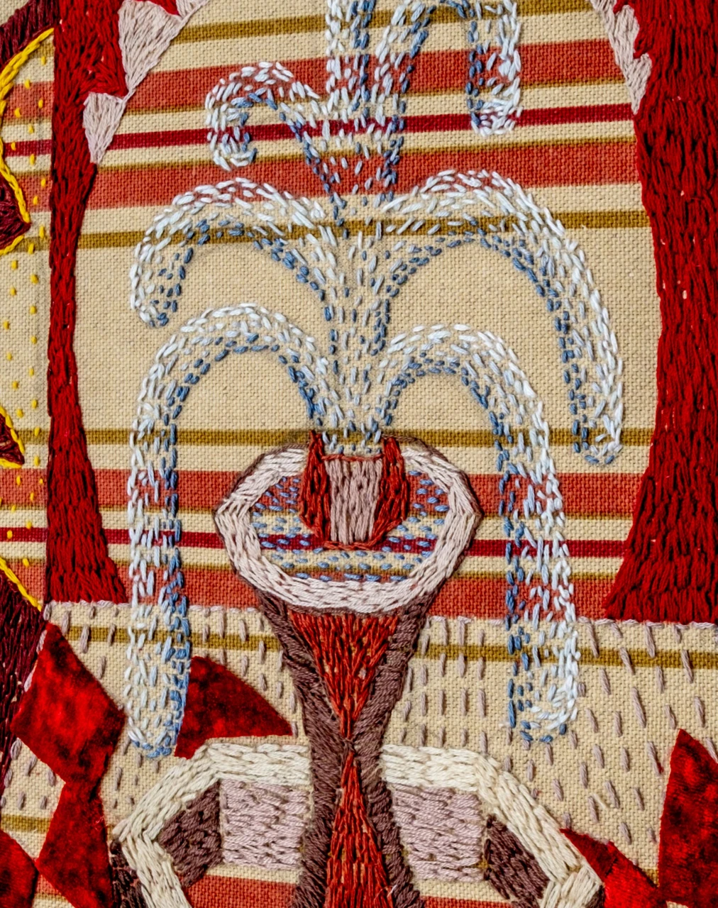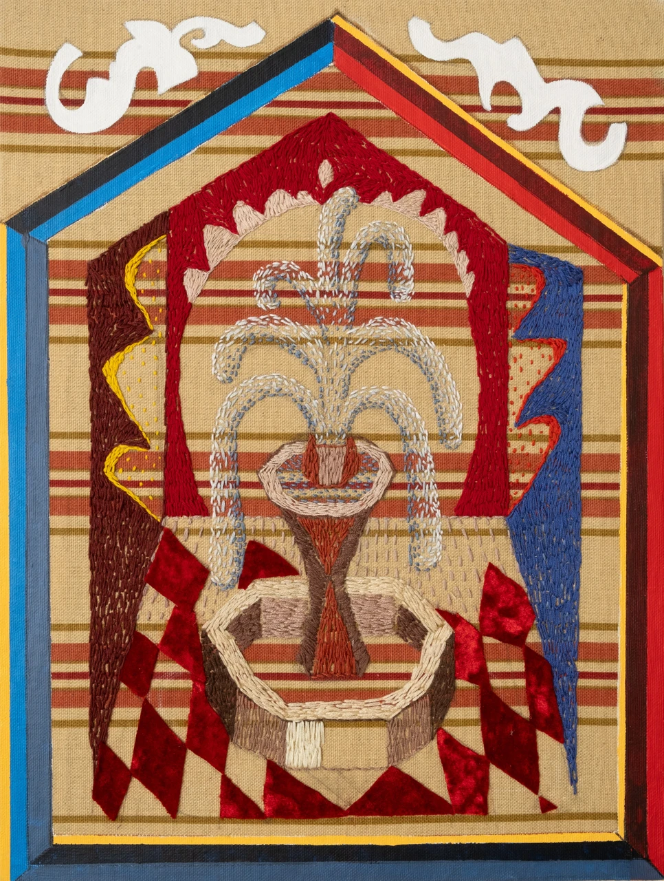 Работа выполнена в смешанной технике на ткани: сочетание ручной вышивки, живописного коллажа и текстиля. Основа — декоративный текстиль с цветочным рисунком, на котором вышиты и дорисованы органические формы. В центре — образ фонтана, выполненный из плотных нитяных стежков, напоминающих фактуру мха или кораллов, дополненный золотыми акцентами, имитирующими струи воды. Вокруг — декоративные и абстрактные мотивы, перекликающиеся с историческими тканями и орнаментами.