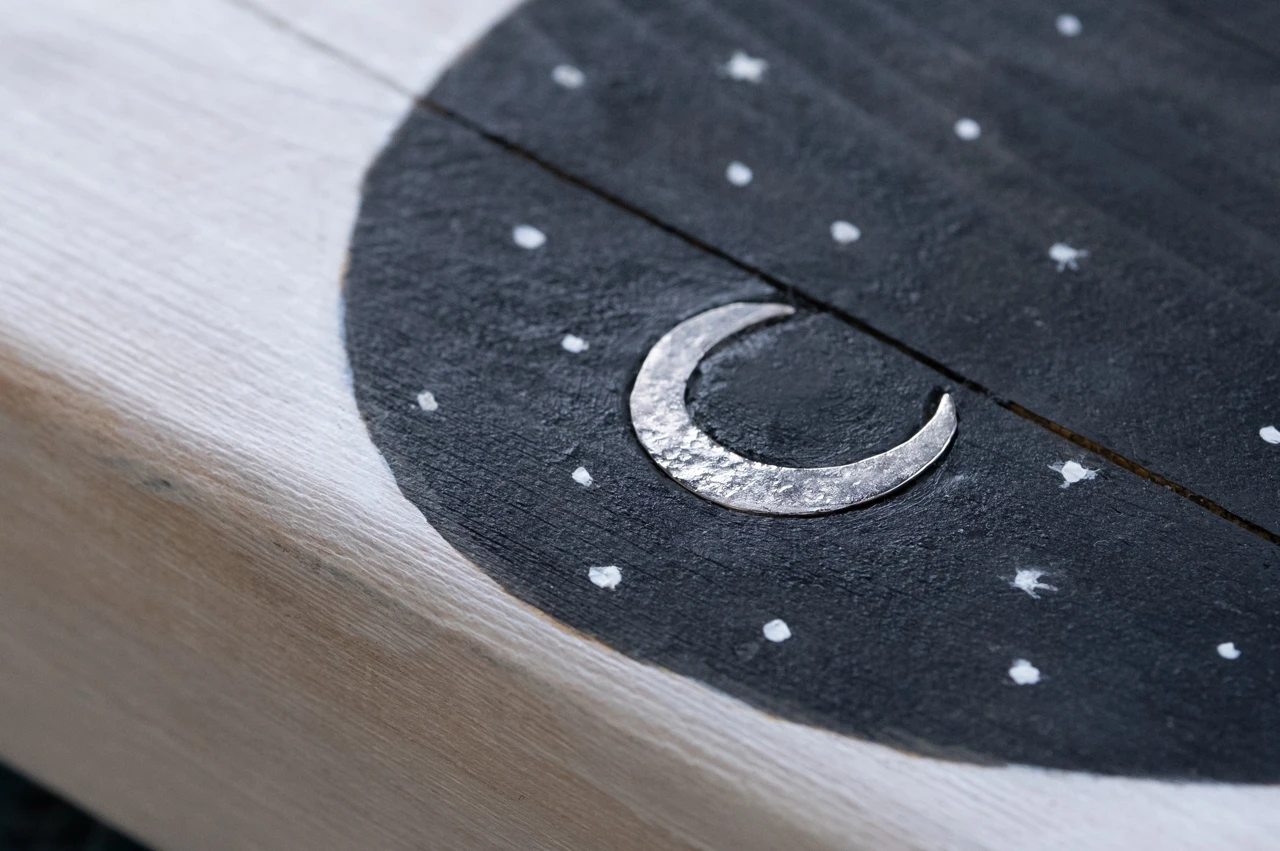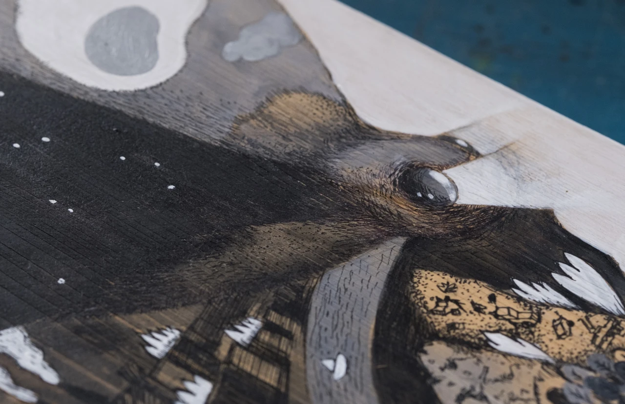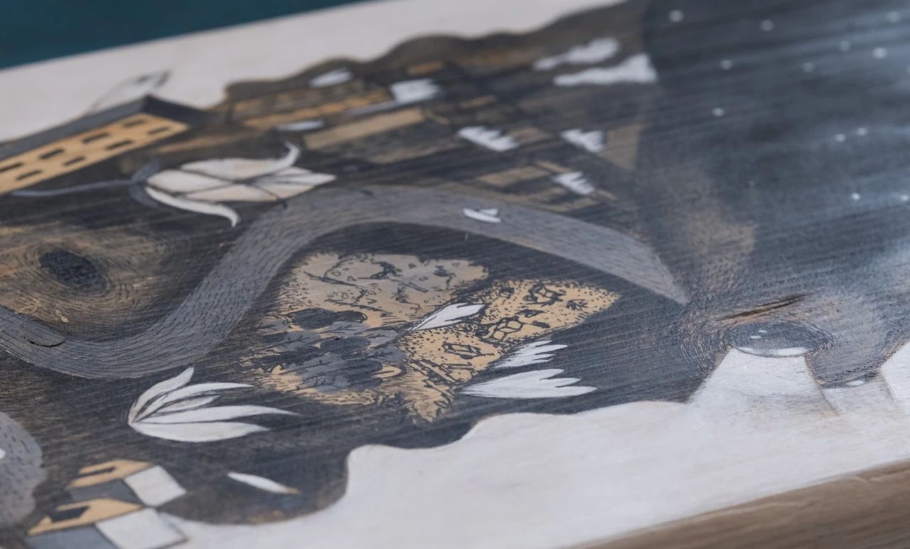 Работа «Мойра — спасительница» — это панно-рельеф, выполненное на массивной деревянной основе с элементами металлической вставки, что придаёт объекту ощущение прочности, монументальности и почти архитектурного характера. Это произведение является частью художественной сказки «Сказка про Мойру и Годзиллу», где фантастический образ чудовища становится метафорой внешнего врага, разрушительной силы или культурного проникновения, а бабочка Мойра — символом надежды, добра и внутренней силы.