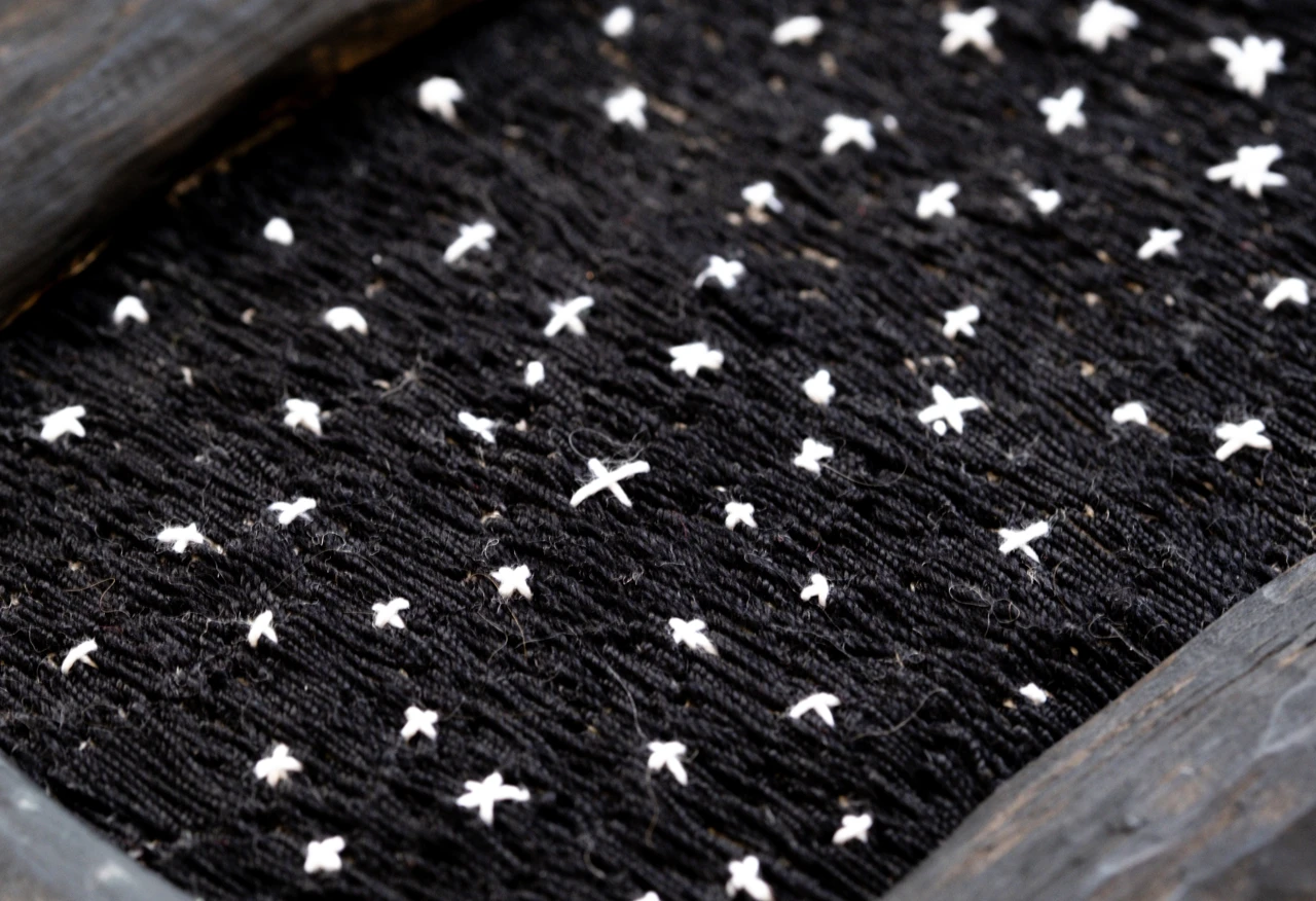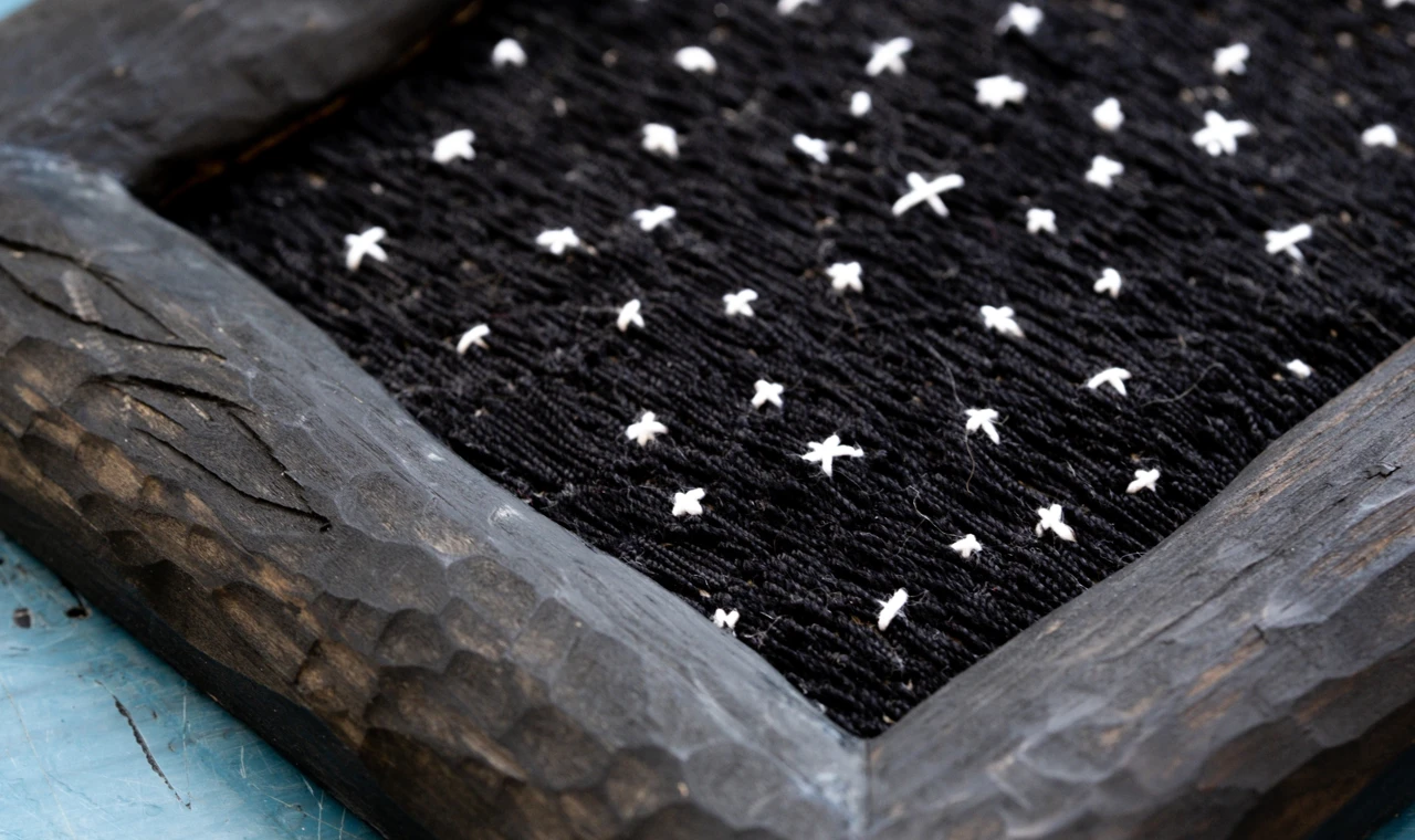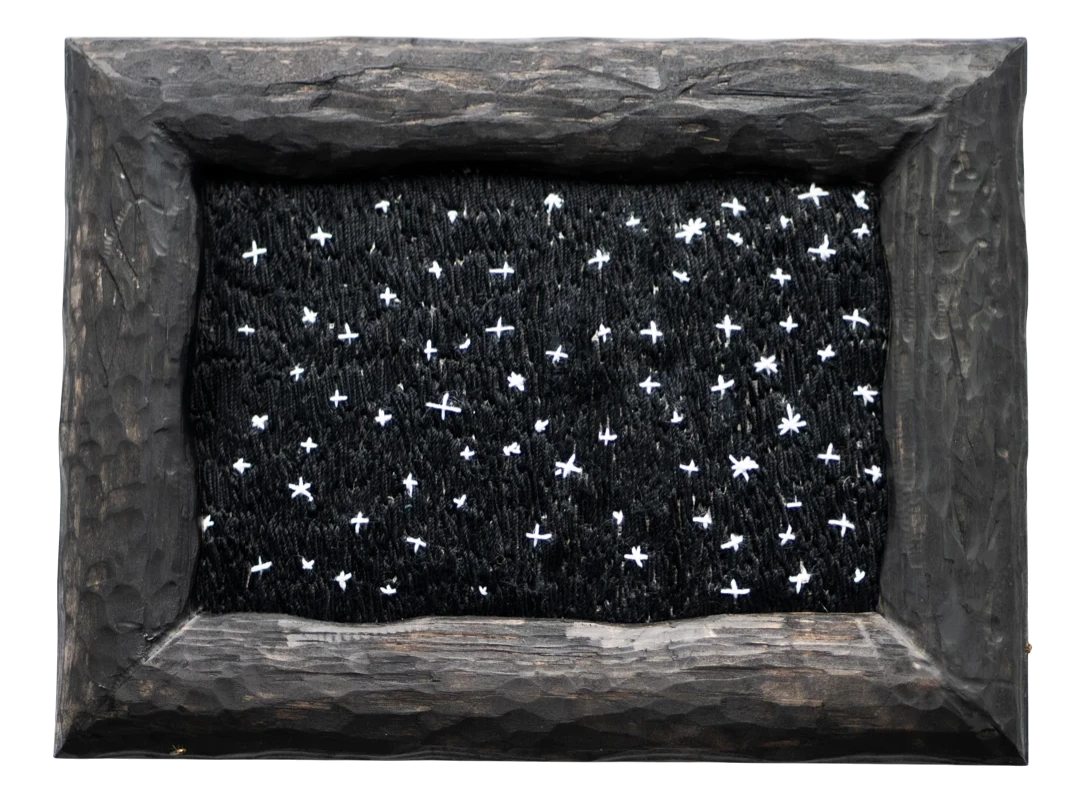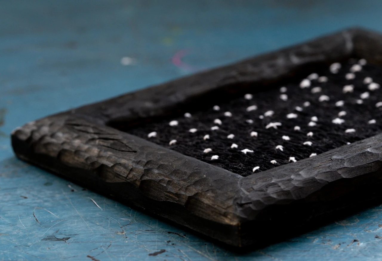 Работа «Ночь» представляет собой миниатюрное композитное произведение, сочетающее в себе традиционные ремесленные техники — ручную вышивку и резьбу по дереву — в контексте современного художественного выражения. Это работа масштаба «объекта-реликвии», где пространство, материал и символизм синтезируются в едином арт-предмете, призывая к медитации и внутреннему восприятию.