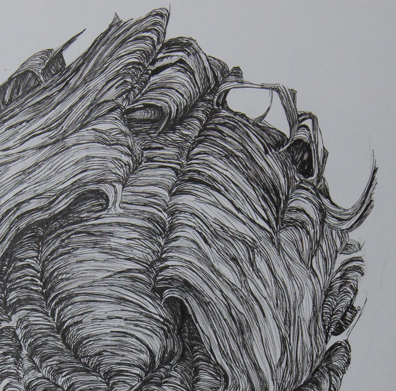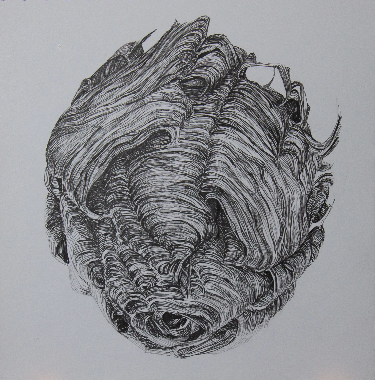 Графическая работа из серии «Осиное гнездо». Осиные гнезда — архитектурные сооружения насекомых, которые становятся визуальным языком для размышлений о том, как формируются, функционируют и трансформируются сообщества. Автора привлекает двойственность этих конструкций: их геометрическая сложность соседствует с удивительной хрупкостью, а совершенство форм контрастирует с их временным характером. Пустые ячейки гнёзд, лишённые обитателей, превращаются в символы социальных пространств, сохраняющих свою структуру даже после ухода тех, кто их создавал.