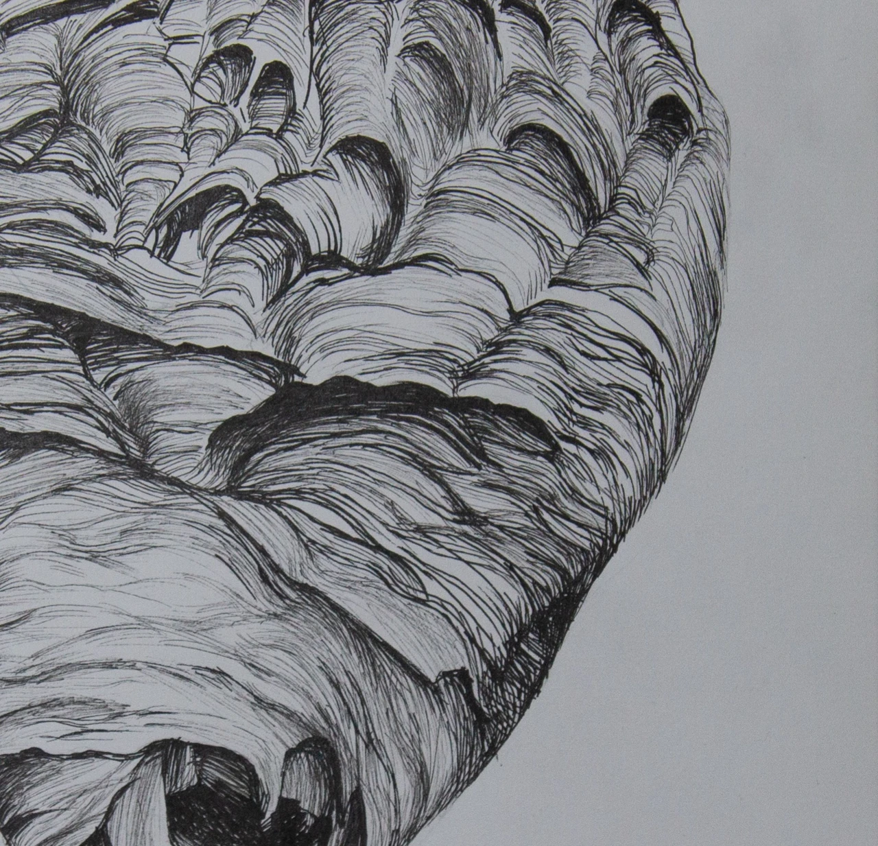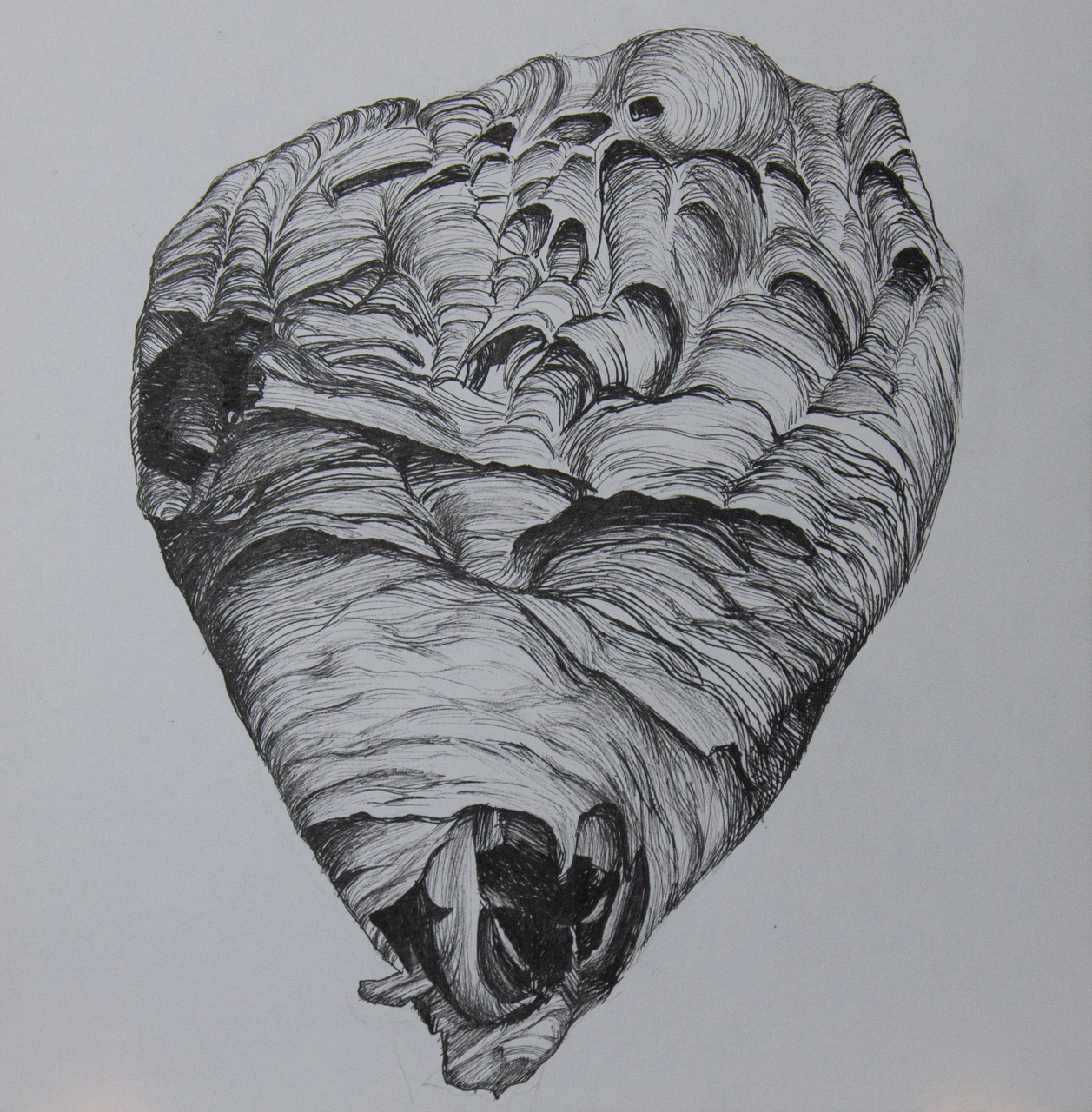 Графическая работа из серии «Осиное гнездо». Осиные гнезда — архитектурные сооружения насекомых, которые становятся визуальным языком для размышлений о том, как формируются, функционируют и трансформируются сообщества. Автора привлекает двойственность этих конструкций: их геометрическая сложность соседствует с удивительной хрупкостью, а совершенство форм контрастирует с их временным характером. Пустые ячейки гнёзд, лишённые обитателей, превращаются в символы социальных пространств, сохраняющих свою структуру даже после ухода тех, кто их создавал.