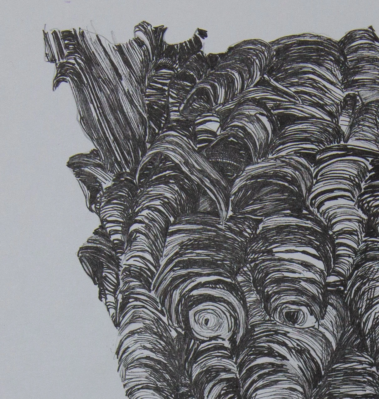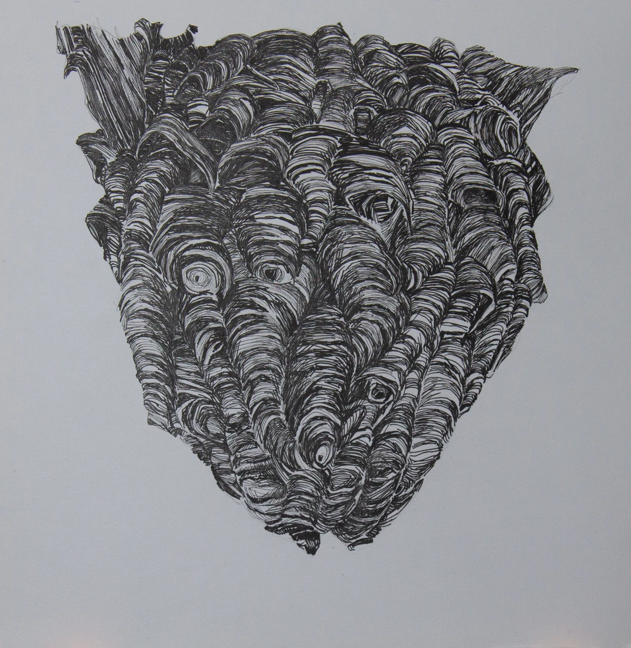 Графическая работа из серии «Осиное гнездо». Осиные гнезда — архитектурные сооружения насекомых, которые становятся визуальным языком для размышлений о том, как формируются, функционируют и трансформируются сообщества. Автора привлекает двойственность этих конструкций: их геометрическая сложность соседствует с удивительной хрупкостью, а совершенство форм контрастирует с их временным характером. Пустые ячейки гнёзд, лишённые обитателей, превращаются в символы социальных пространств, сохраняющих свою структуру даже после ухода тех, кто их создавал.