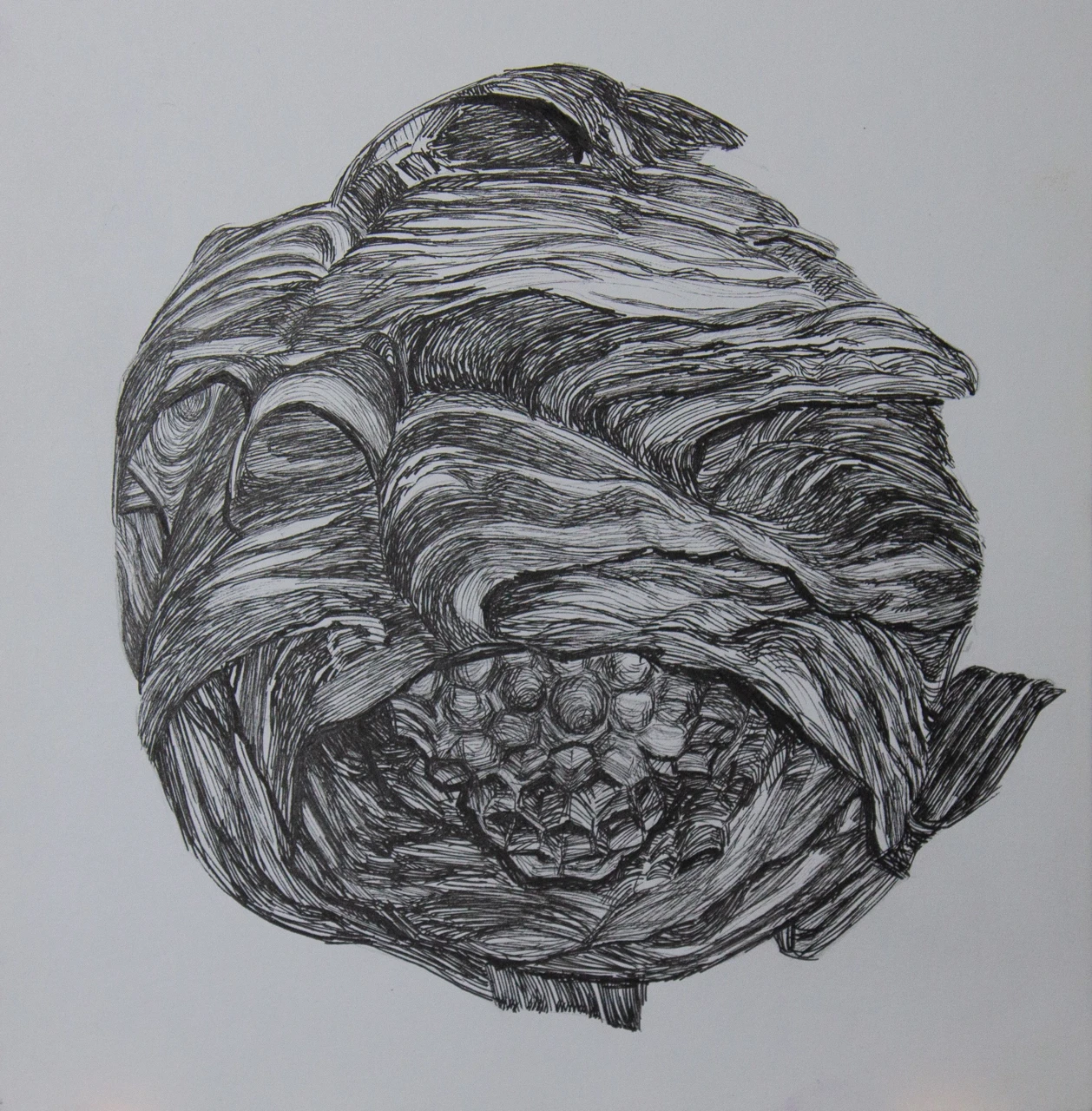 Графическая работа из серии «Осиное гнездо». Осиные гнезда — архитектурные сооружения насекомых, которые становятся визуальным языком для размышлений о том, как формируются, функционируют и трансформируются сообщества. Автора привлекает двойственность этих конструкций: их геометрическая сложность соседствует с удивительной хрупкостью, а совершенство форм контрастирует с их временным характером. Пустые ячейки гнёзд, лишённые обитателей, превращаются в символы социальных пространств, сохраняющих свою структуру даже после ухода тех, кто их создавал.