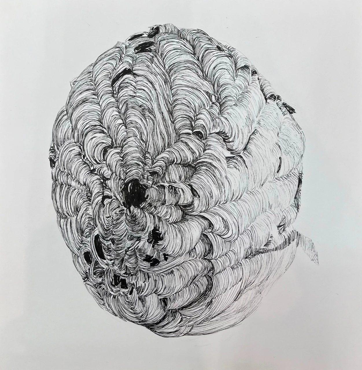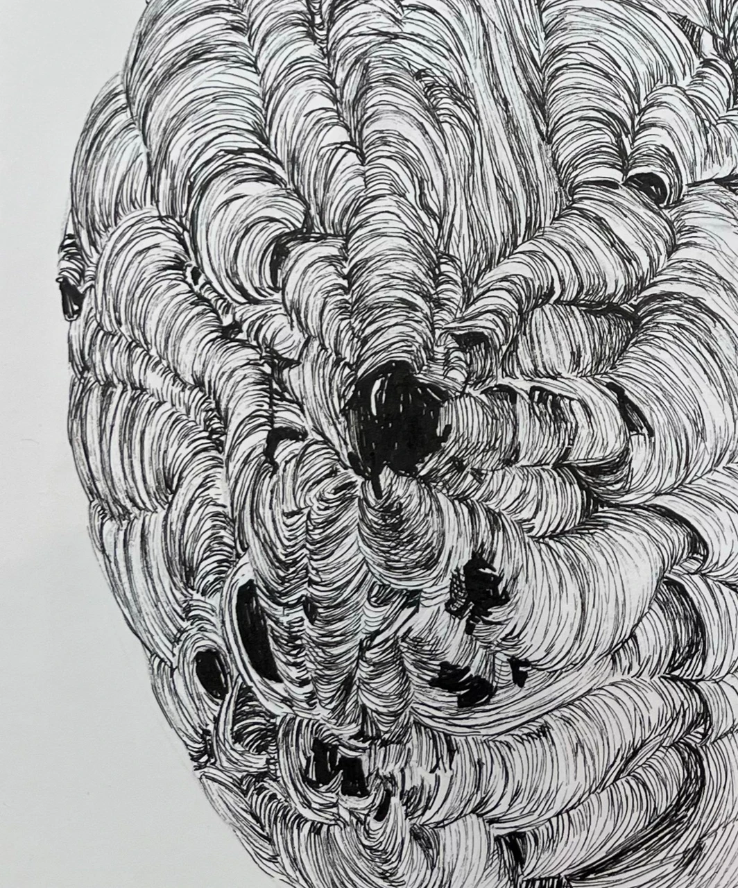 Графическая работа из серии «Осиное гнездо». Осиные гнезда — архитектурные сооружения насекомых, которые становятся визуальным языком для размышлений о том, как формируются, функционируют и трансформируются сообщества. Автора привлекает двойственность этих конструкций: их геометрическая сложность соседствует с удивительной хрупкостью, а совершенство форм контрастирует с их временным характером. Пустые ячейки гнёзд, лишённые обитателей, превращаются в символы социальных пространств, сохраняющих свою структуру даже после ухода тех, кто их создавал.