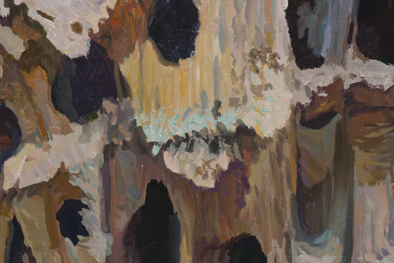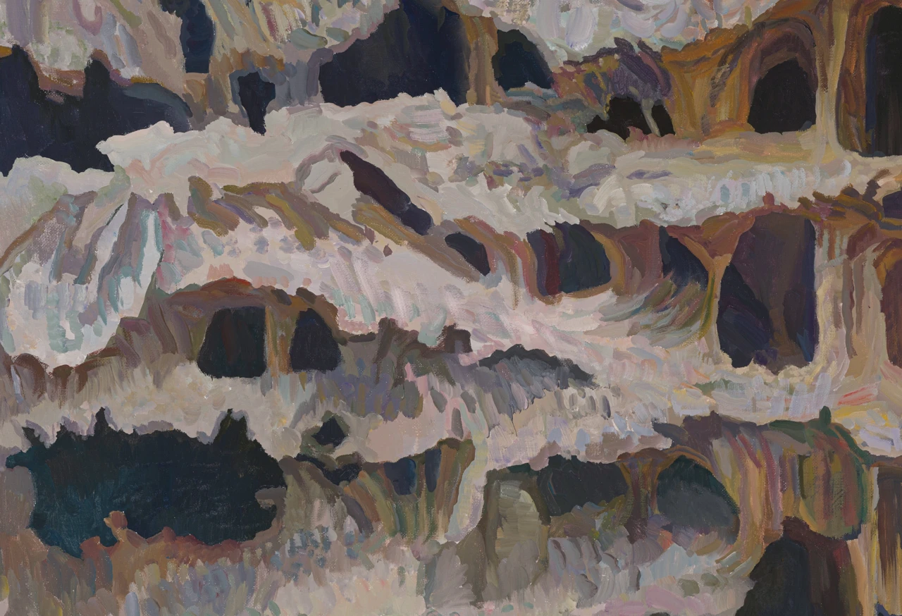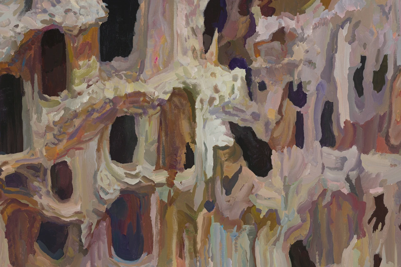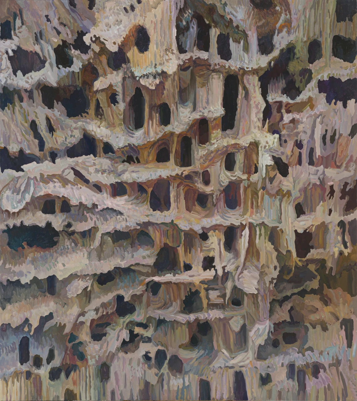 Работа из серии «Архитектура сообщества». Термитник здесь — модель любой цивилизации, чья сложная архитектура рождается не по единому плану, а из миллионов слепых, стихийных взаимодействий. Хаос — как метод, порождающий новый порядок. Термитник предстает как монолит в пустоте (слепой порядок, где каждый шаг предопределен), испещренный множественными ходами — где пустота также необходима, как система опор. Но за этим фасадом скрывается все та же архаичная, хаотичная структура.