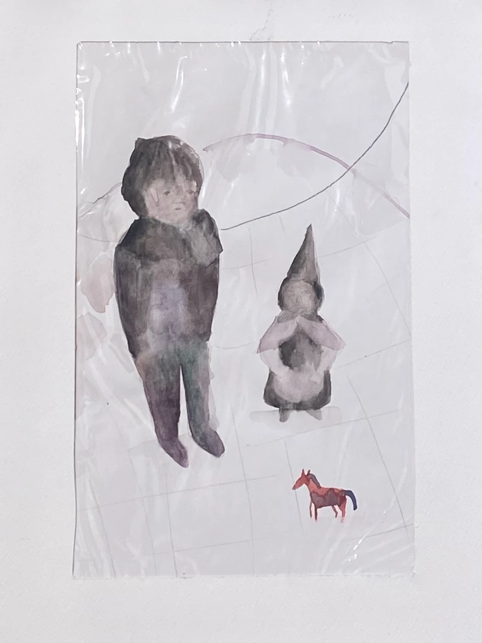 Работа Мы? — это авторская графика, выполненная в технике акварели. Композиция построена на мягких, размытых формах и приглушенной палитре, включающей оттенки серого, фиолетового и коричневого, что создает атмосферу задумчивости и некоторой неопределенности.