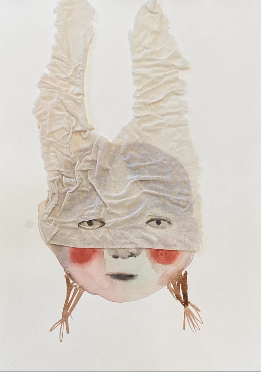 Работа «Наряд II» представляет собой авторскую графику, выполненную в смешанной технике. Центральным элементом композиции является стилизованное изображение лица, созданное акварелью и карандашом. Нежные розовые акценты на щеках и тонко прорисованные черты лица придают образу выразительность, в то время как глаза, выполненные с вниманием к деталям, создают ощущение взгляда, направленного на зрителя.