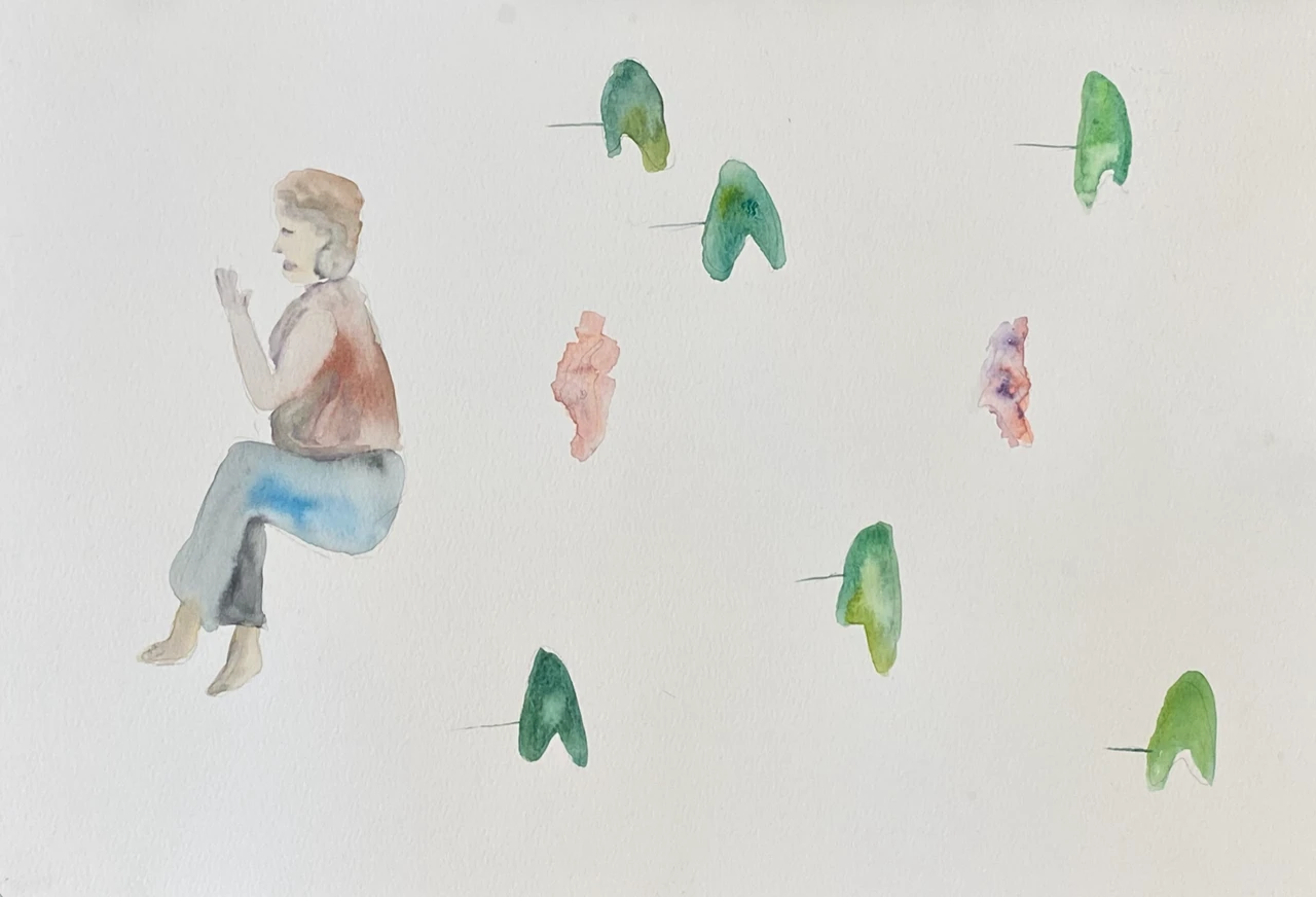 Работа "Пруд с кувшинками" — это акварельная графика на бумаге, изображающая сидящую фигуру человека.