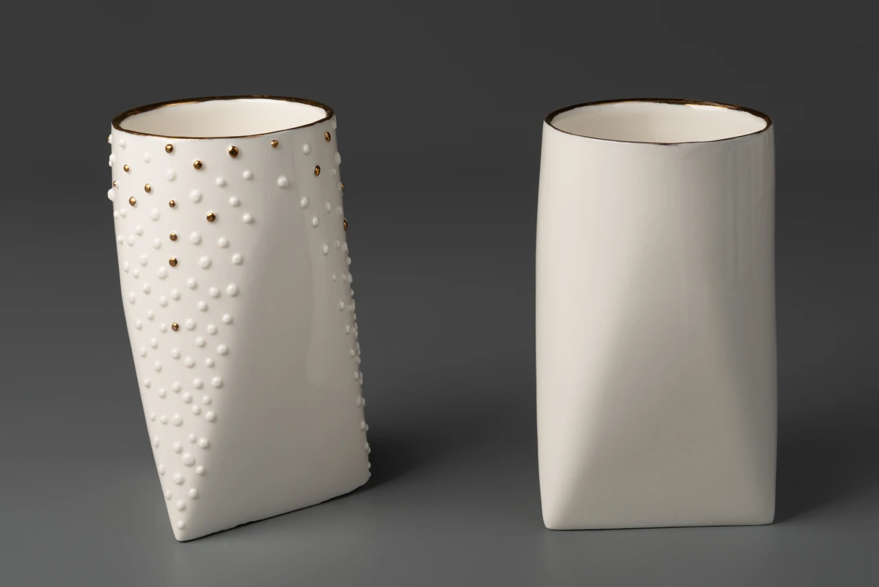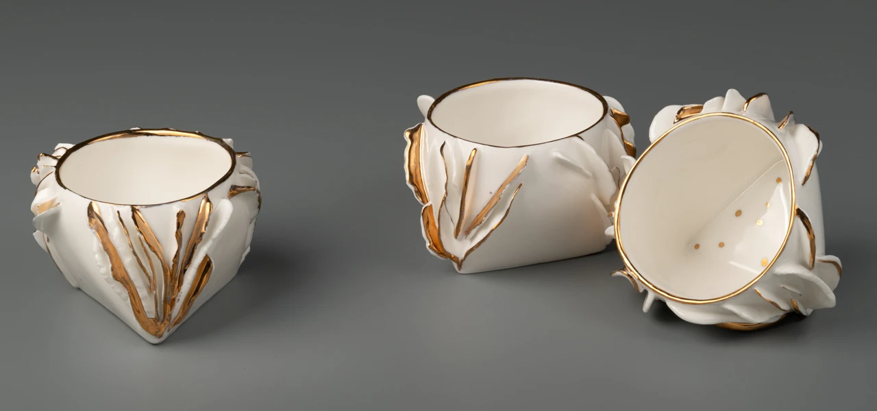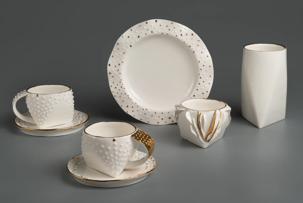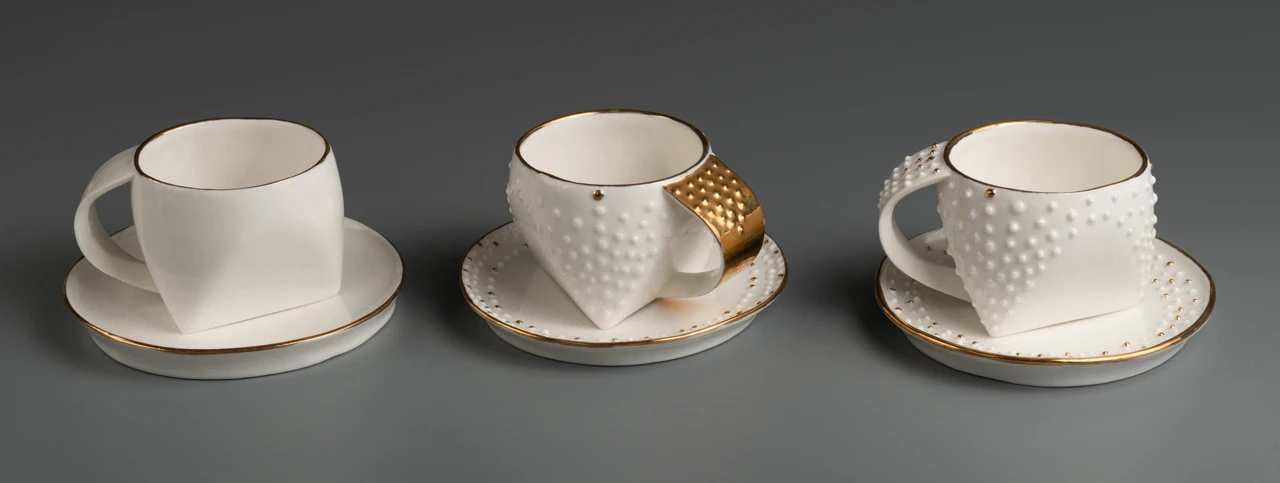 Основа пластического решения — перемена формы от треугольного основания к круглой кайме. Техника — шликерное литье, ручная лепка. Предметы дополнены тактильными элементами, расписаны золотом. Поэтому вид товара может незначительно отличаться от фото, так как они выполнены вручную.