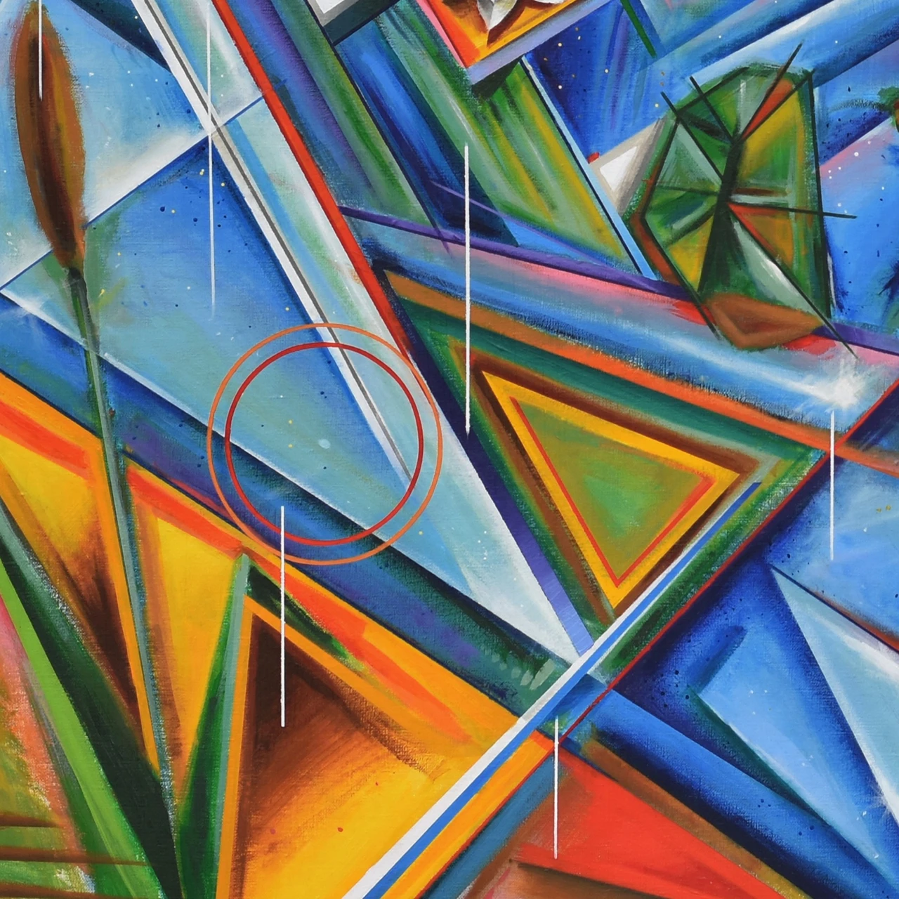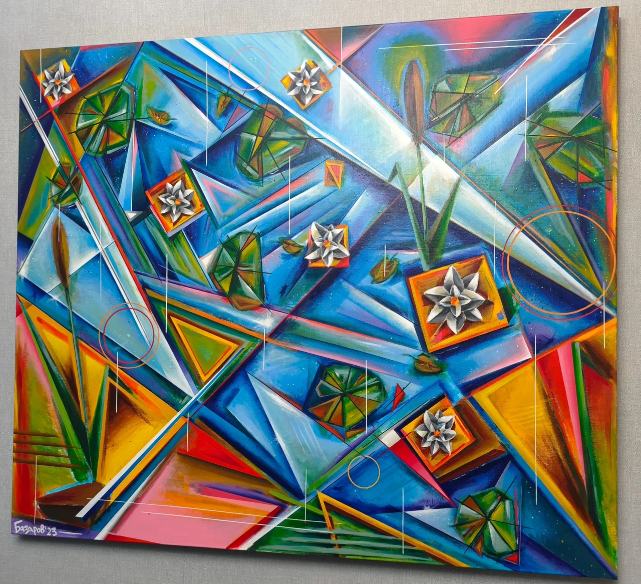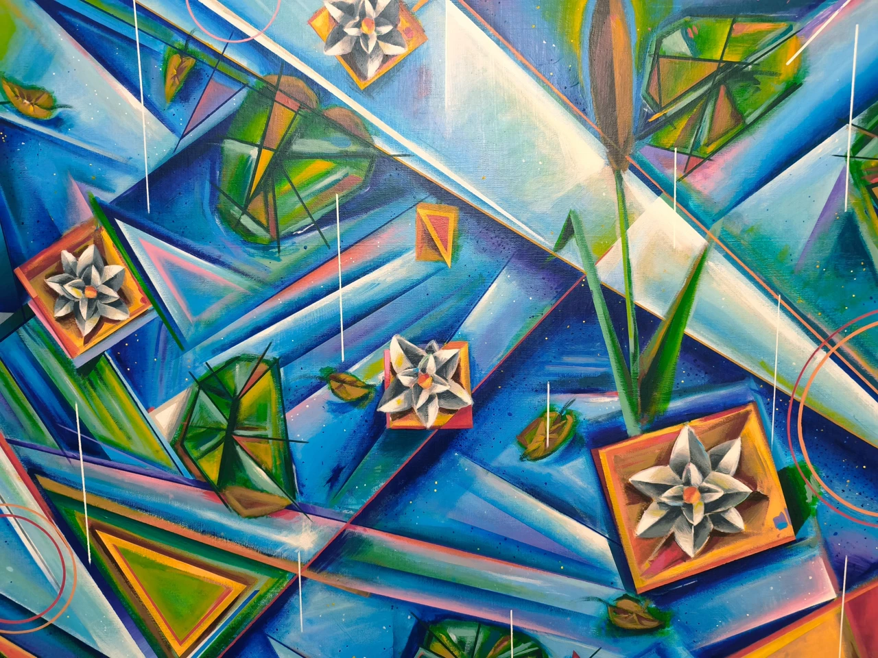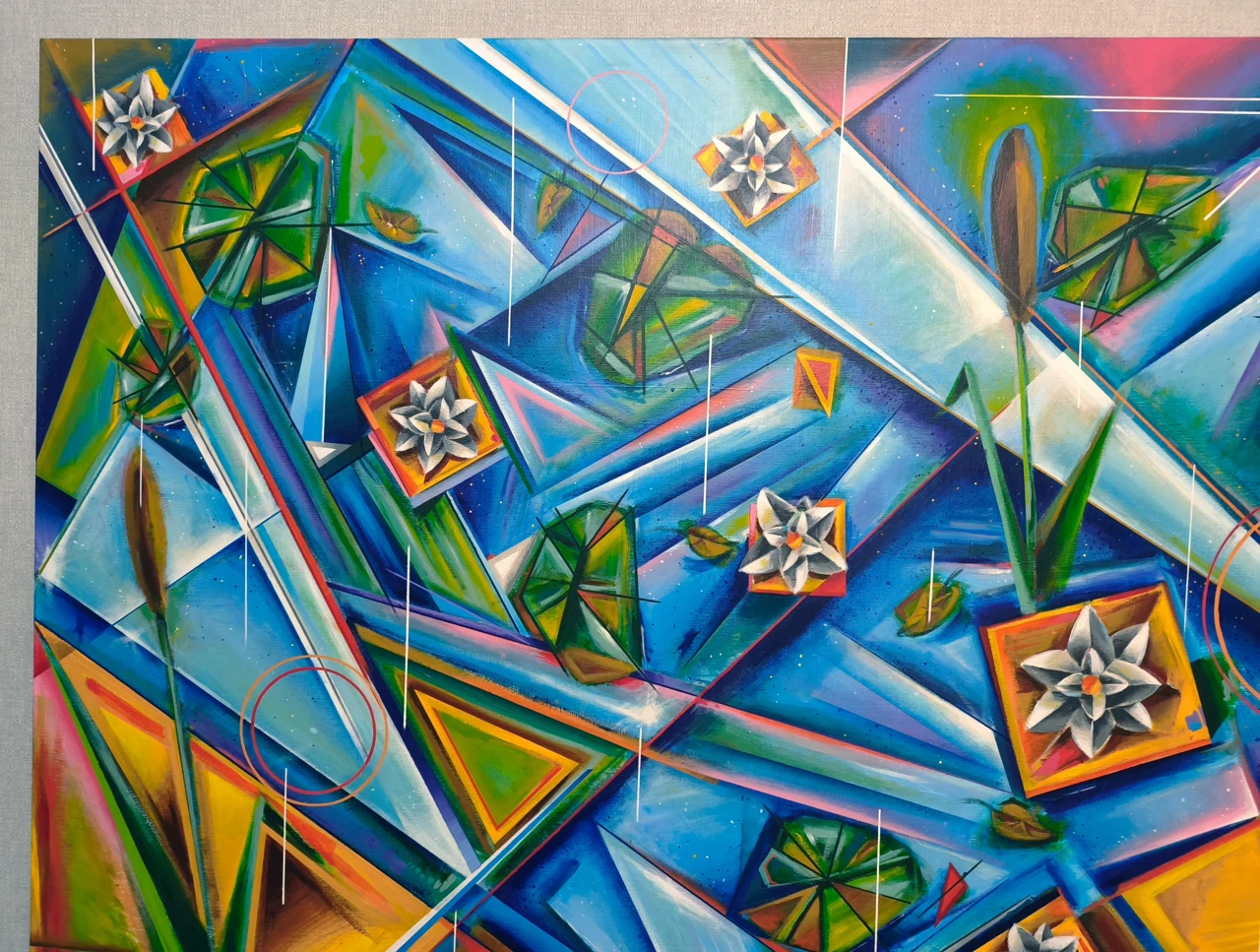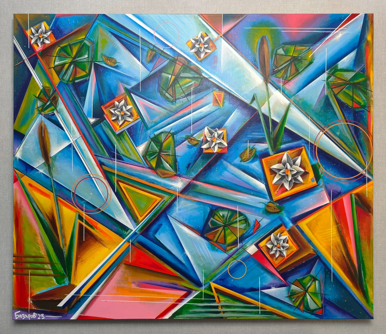 Природный сюжет, стилизованный под геометрию. Вода — плоскостями, кувшинки, камыш, цветок лилии собраны из более мягких форм, создавая контраст. Жёсткая геометрия встречается с узнаваемыми очертаниями природы.