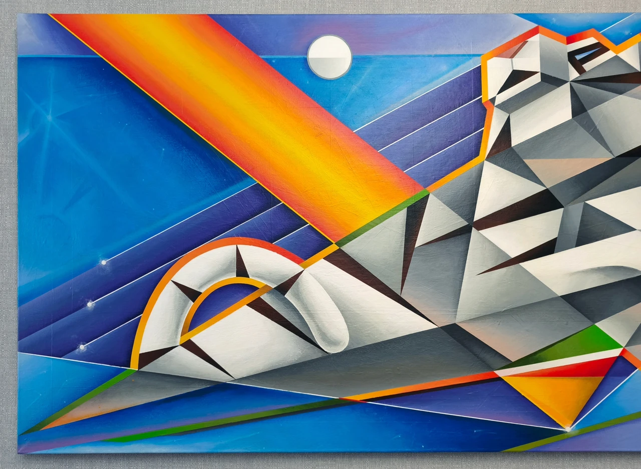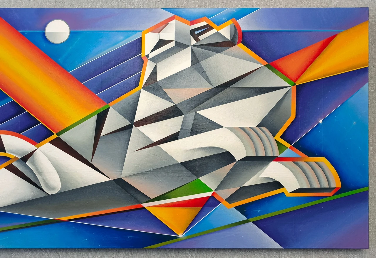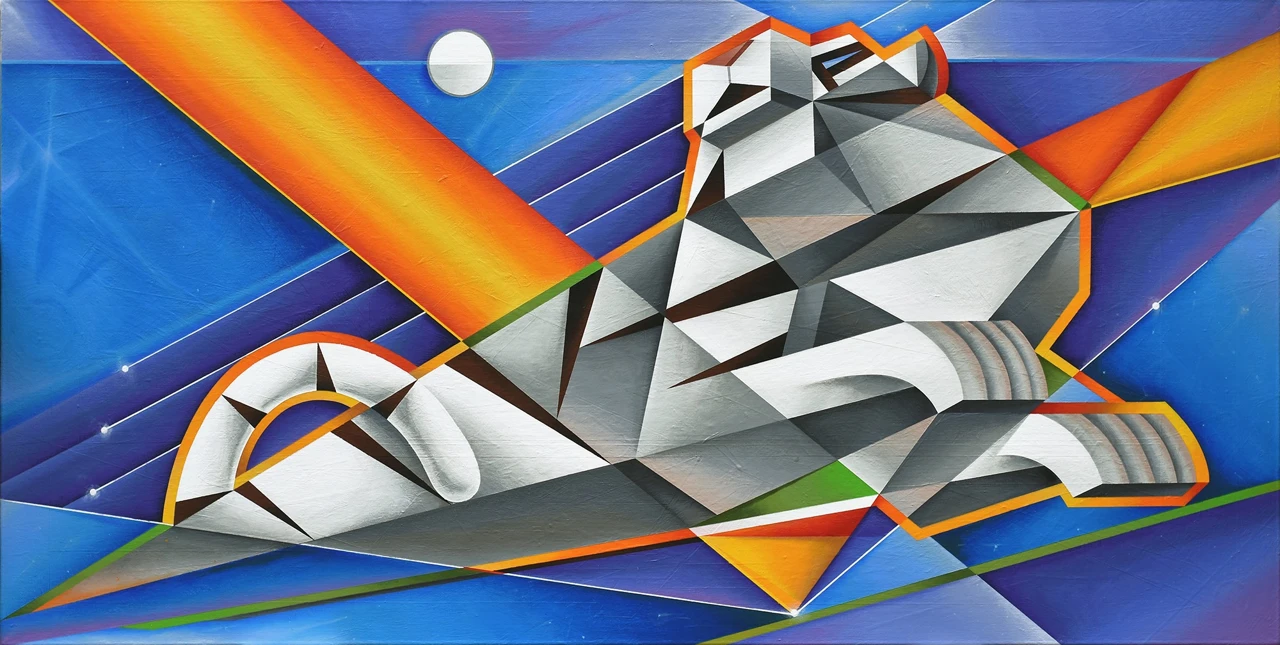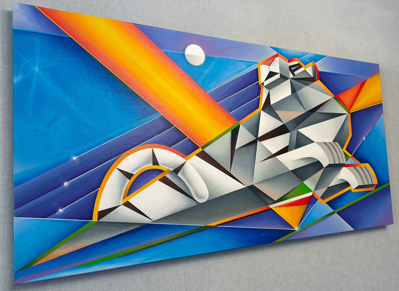 Образ белого тигра, стилизованный грубой геометрией. Форма заострена, стремится в клин. Фон холодный. Присутствуют красный, жёлтый и зелёный, создавая ритмичность.