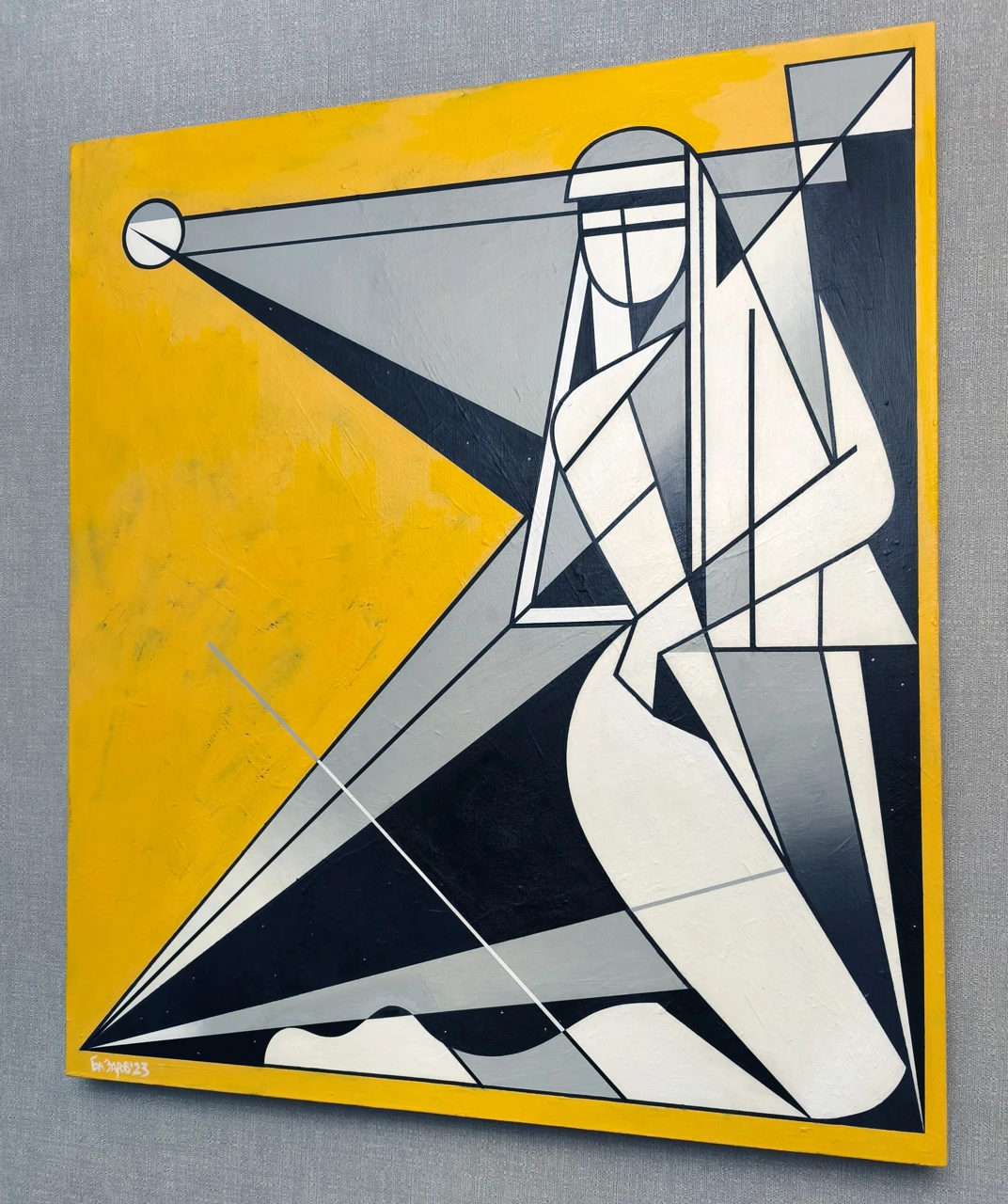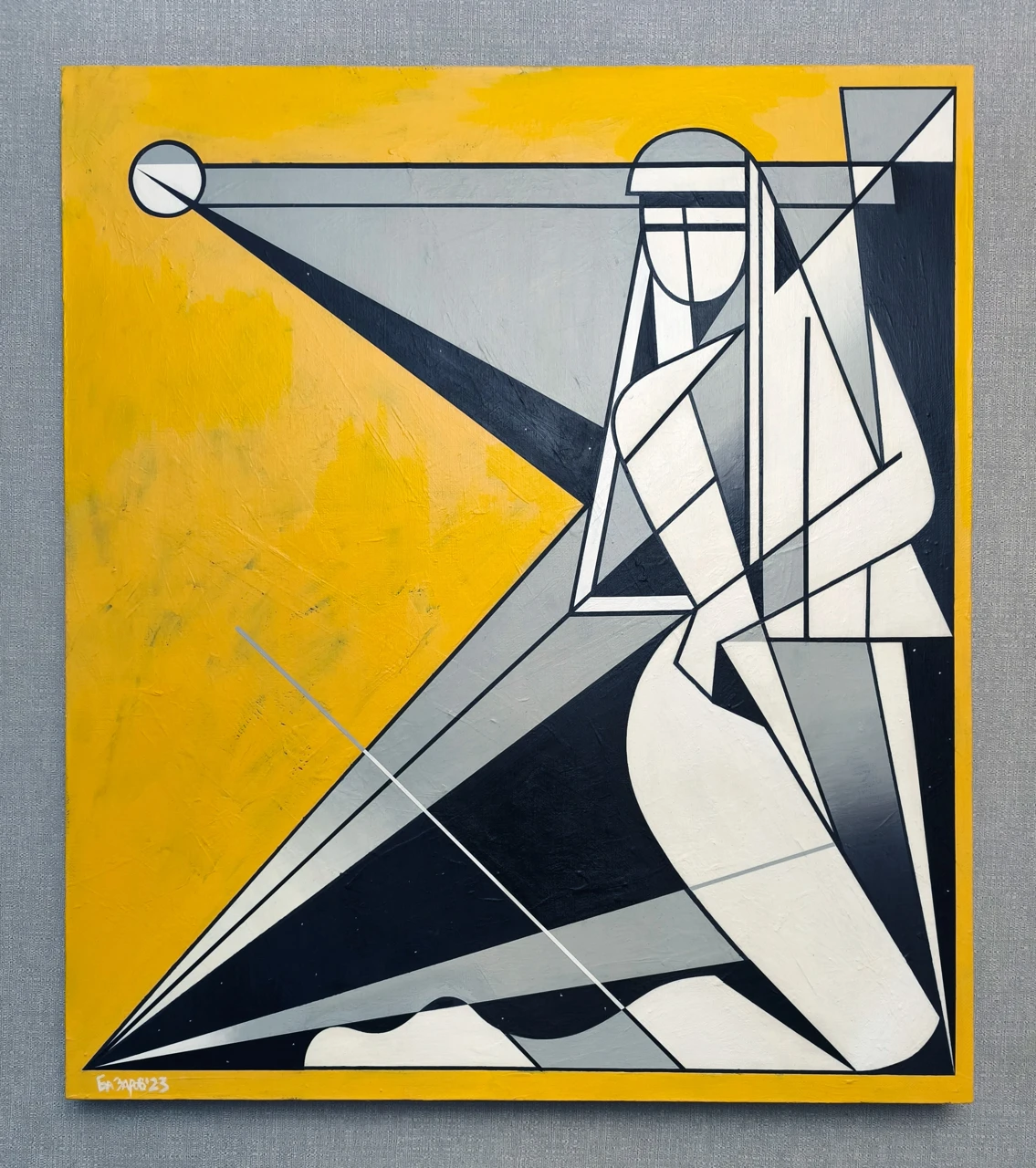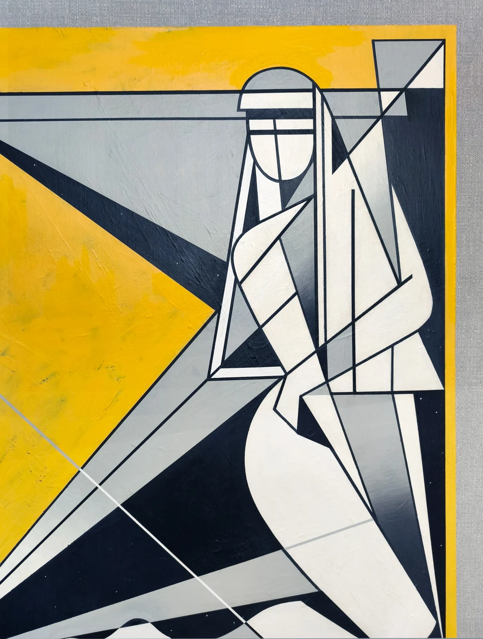 Женская фигура стоит, слегка обхватив локоть, и смотрит в сторону. Её образ собран из чётких линий, белых и серых плоскостей и чёрного контура. Вся композиция заключена в форму треугольников. Ровный цвет фона служит для неё строгим обрамлением, подчёркивая лаконичность и графичность силуэта.